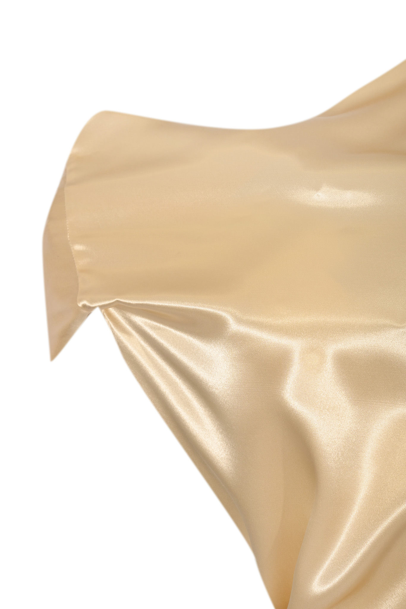 - Dettagli: Linea fluida e avvolgente, taglio obliquo sul davanti, orlo asimmetrico, finiture lucide