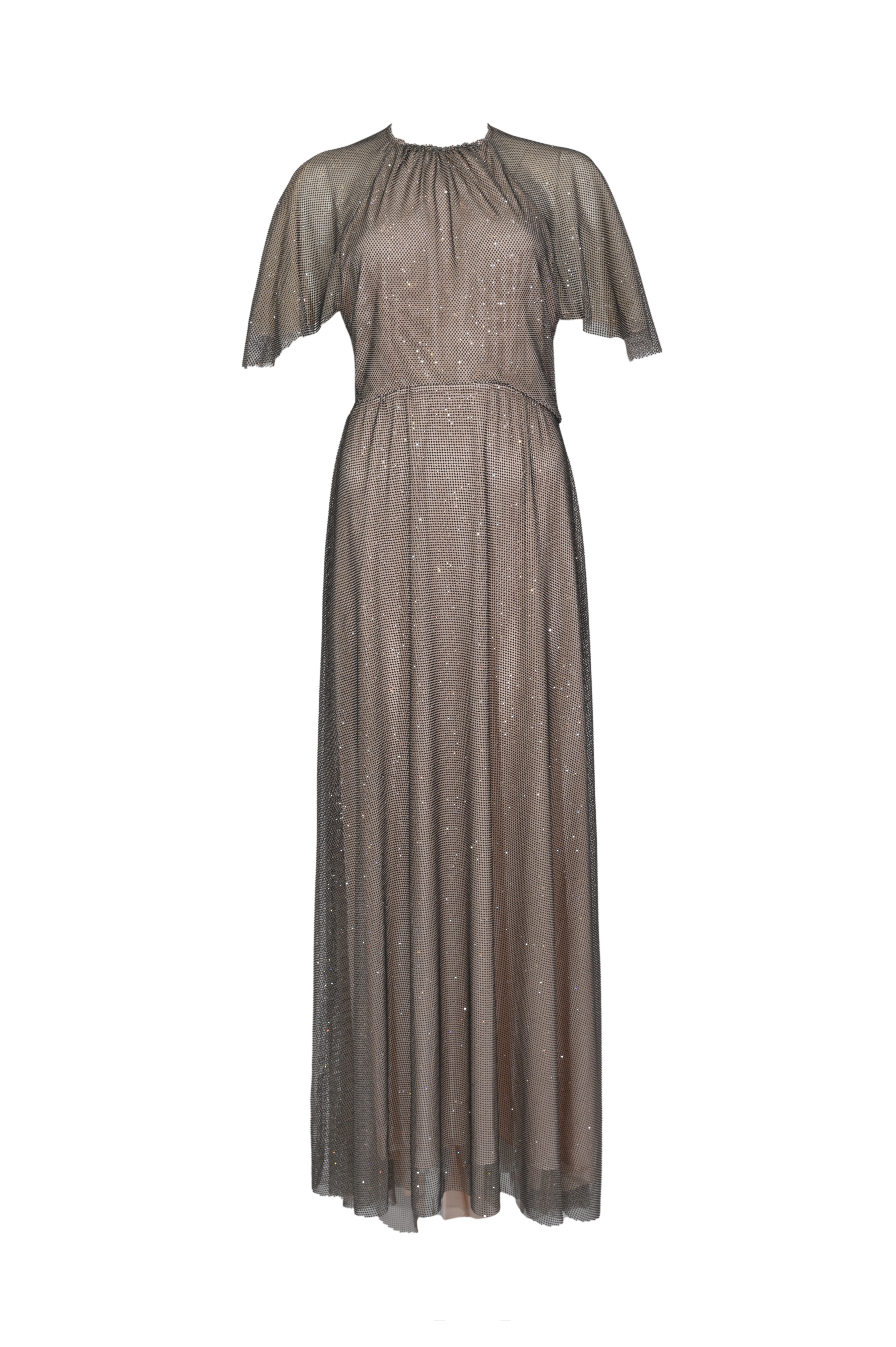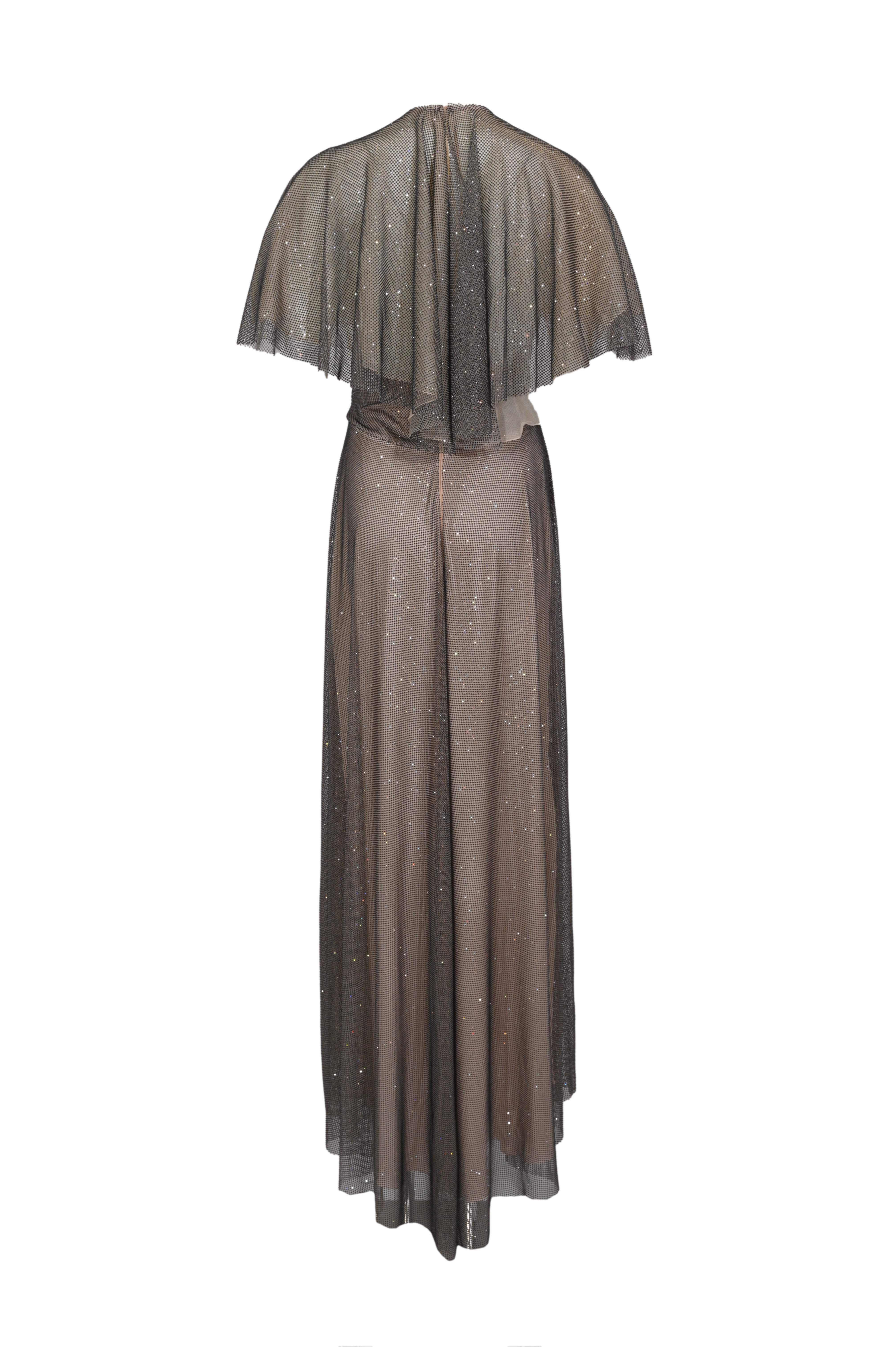 - Dettagli: abito lungo dal design fluido ed elegante, lavorazione interamente ricoperta da micro strass luminosi, corpetto aderente con punto vita segnato e gonna morbida e scivolata, maniche a mantella leggere con effetto drappeggiato, retro con apertura e caduta morbida per un effetto scenografico