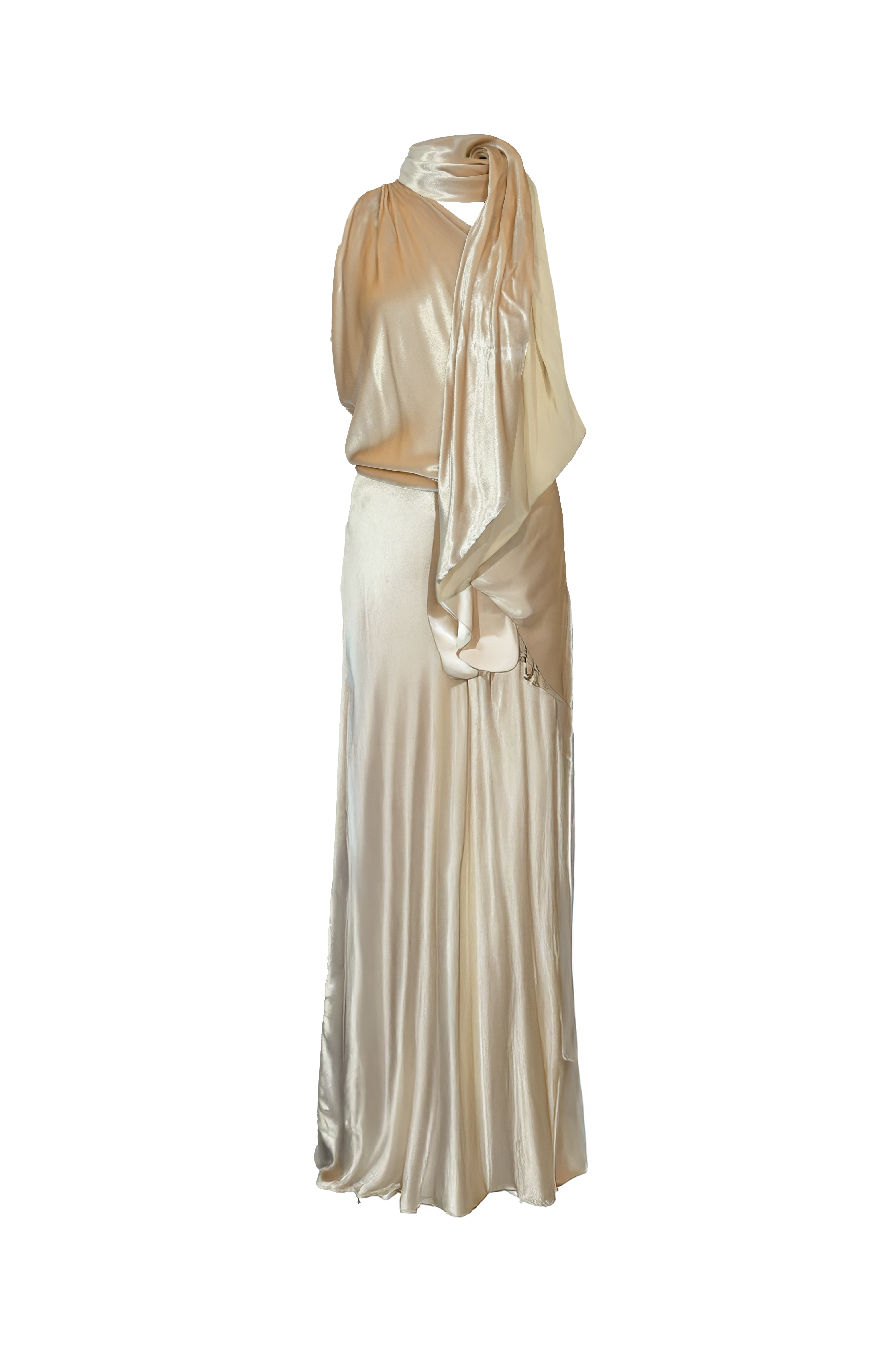 - Dettagli: Drappeggi morbidi sul busto e sulla schiena, taglio fluido con pieghe verticali, finitura lucida effetto seta, fondo ampio con movimento naturale
