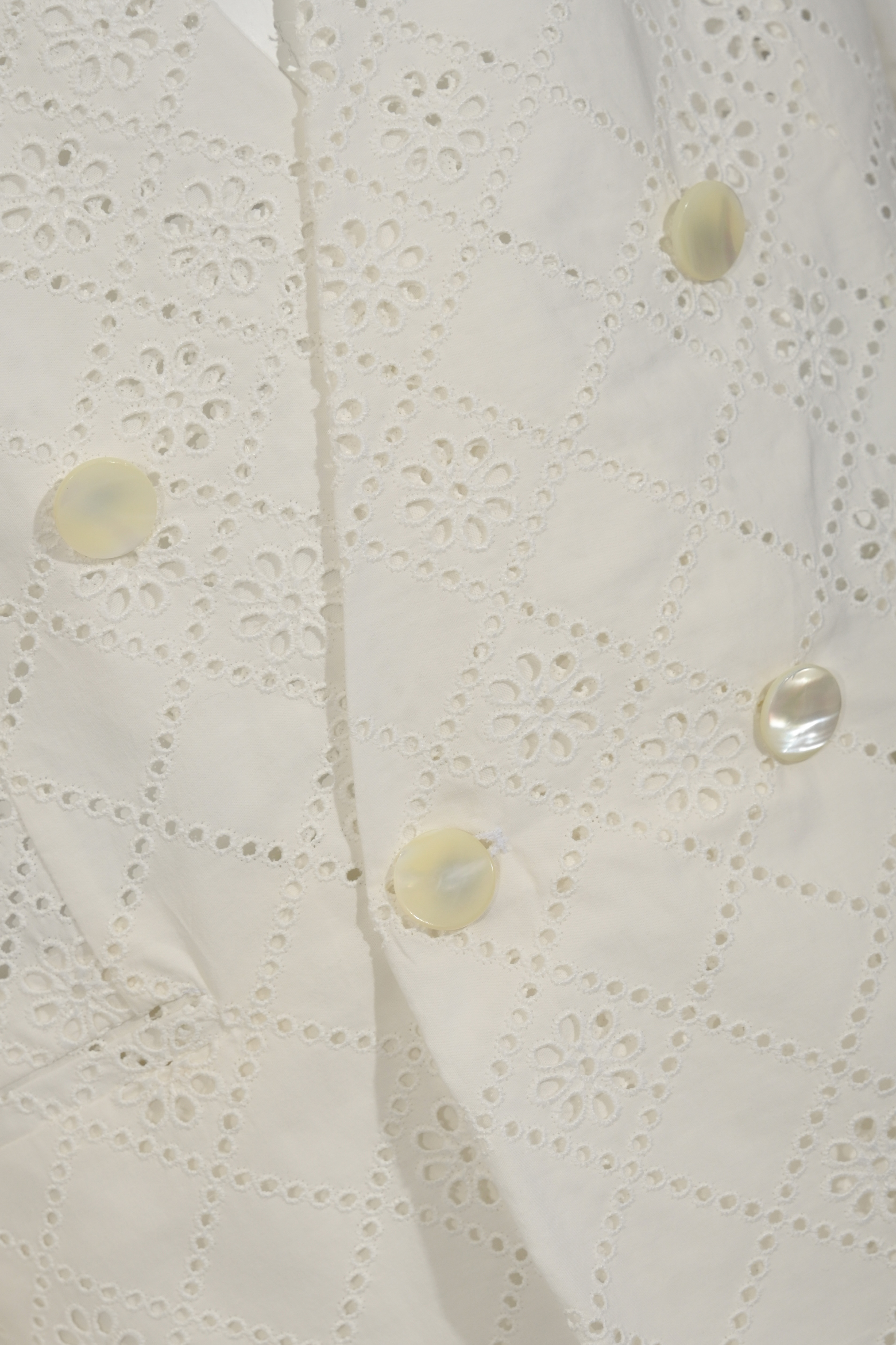 - Dettagli: lavorazione traforata Sangallo, bottoni effetto madreperla