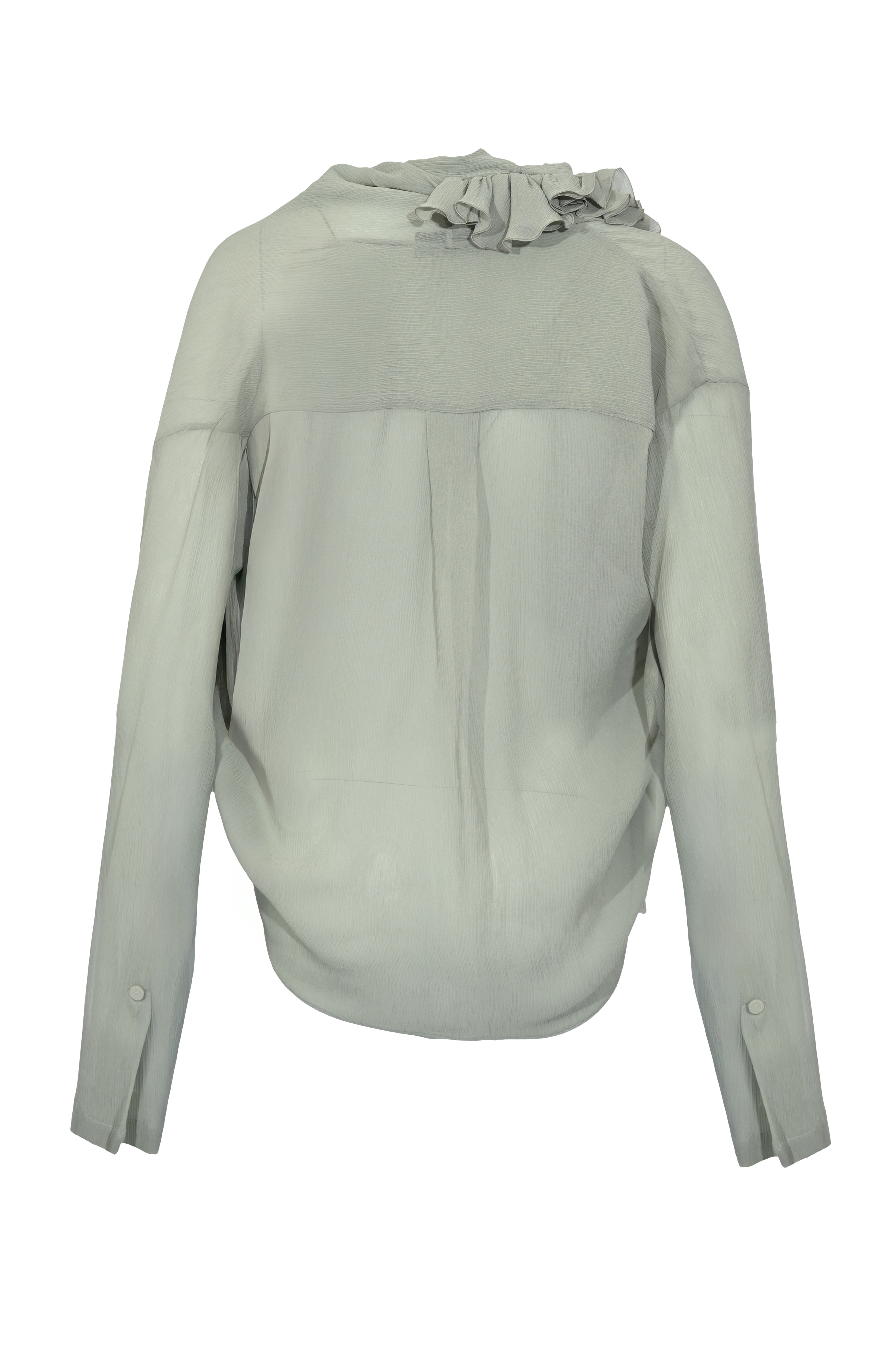 - Dettagli: Lavorazione fluida, bordo arricciato con balze floreali sul davanti e sul collo, linea morbida