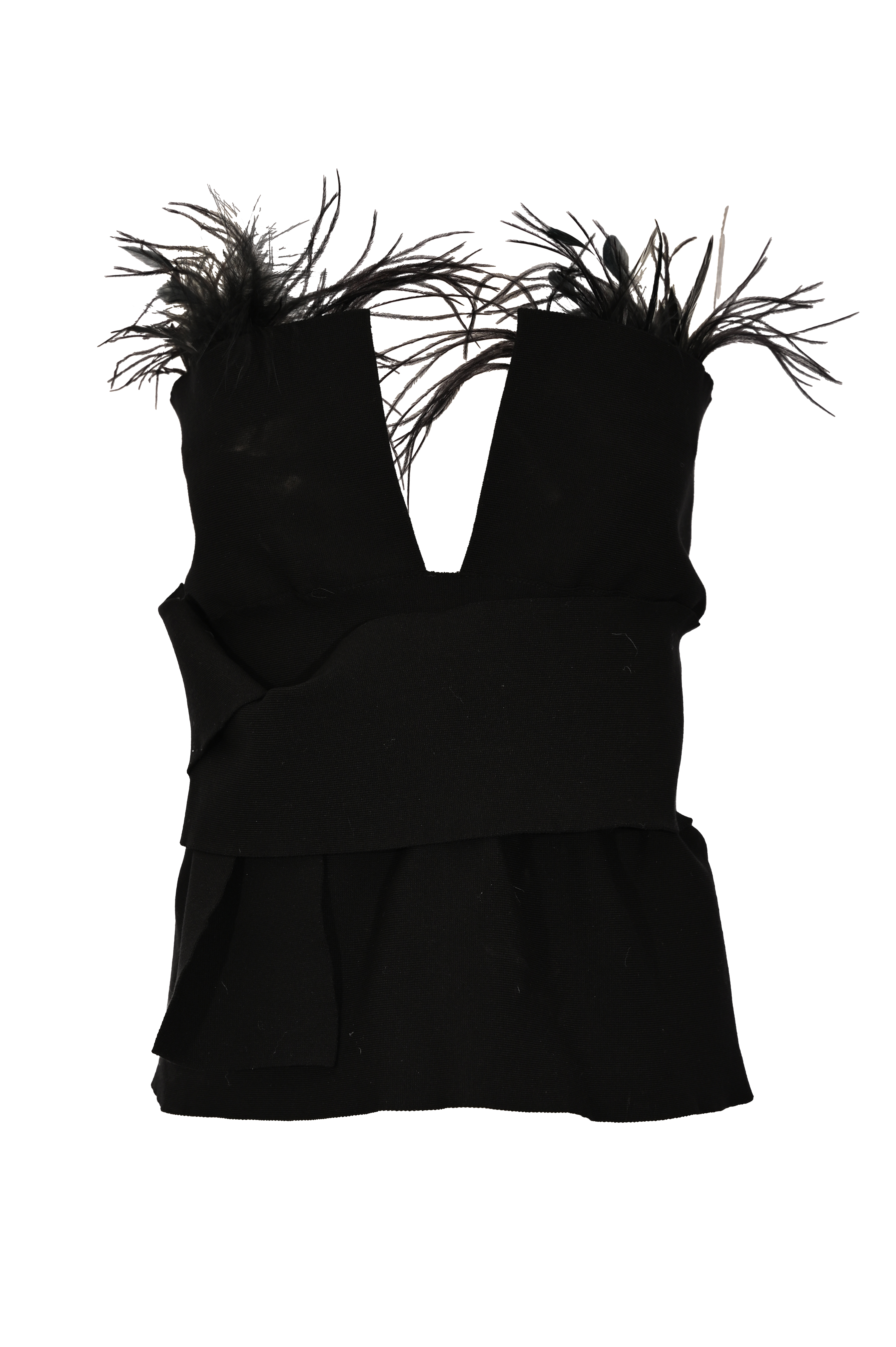 - Tessuto: Maglia di viscosa stretch compatta con inserti decorativi in piume naturali sullo scollo