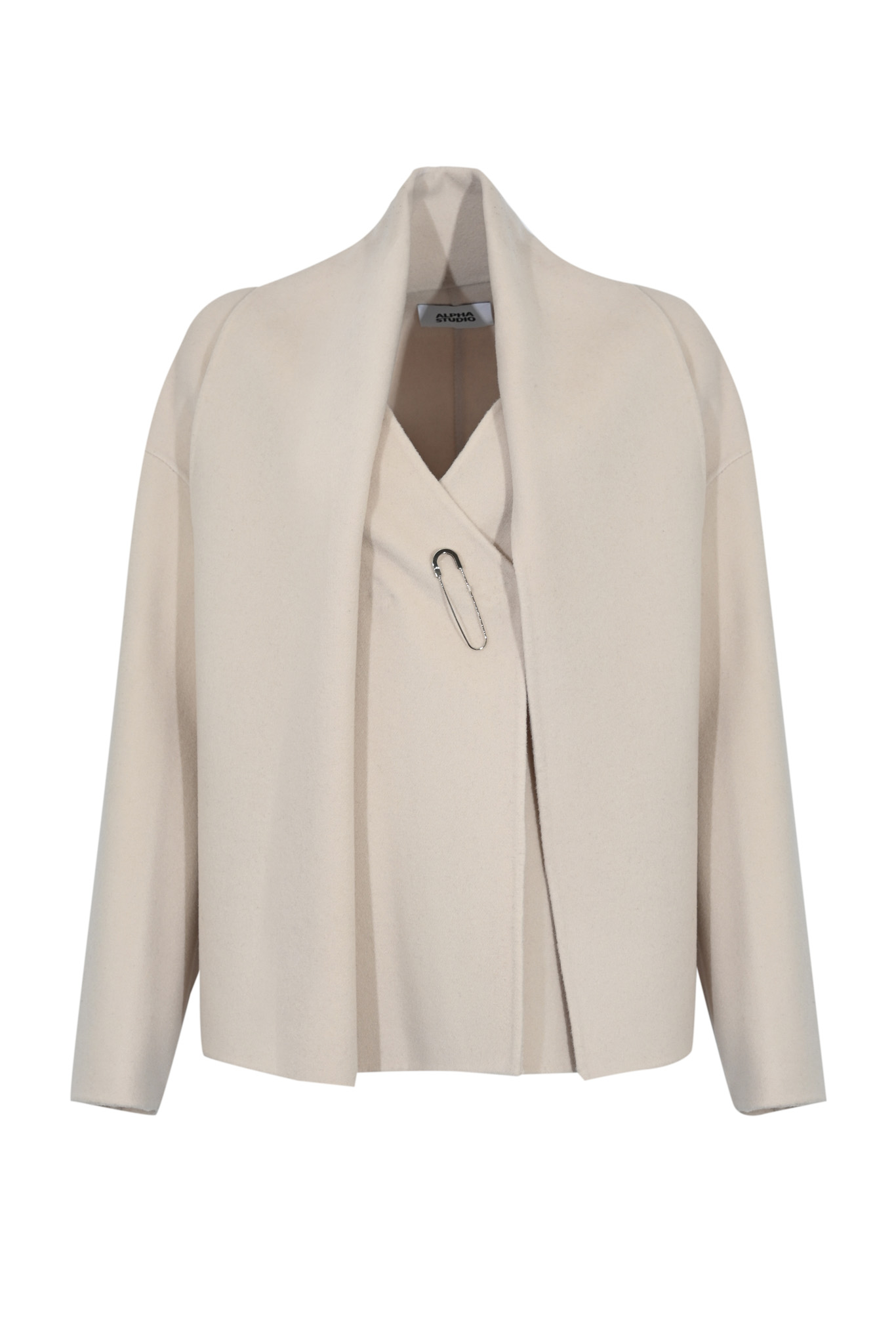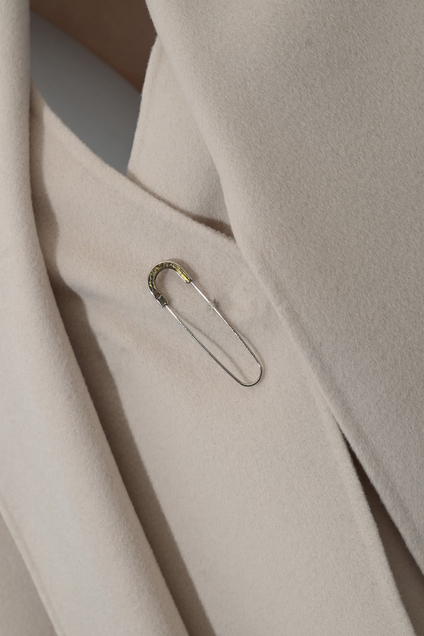 - Dettagli: Linee pulite e minimaliste; struttura sartoriale a taglio vivo; pin decorativa in metallo lucido che aggiunge un tocco contemporaneo; finiture interne senza cuciture a vista