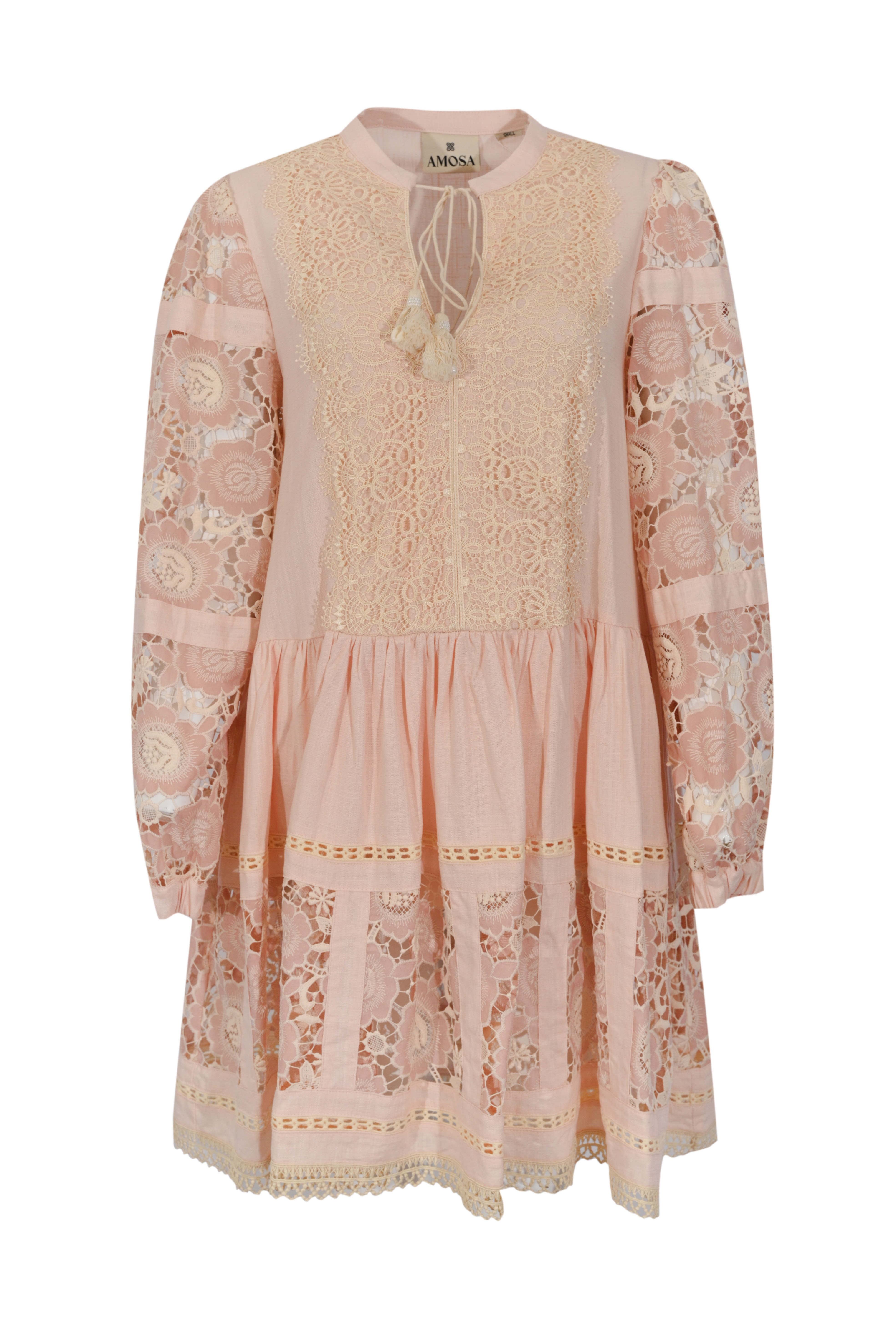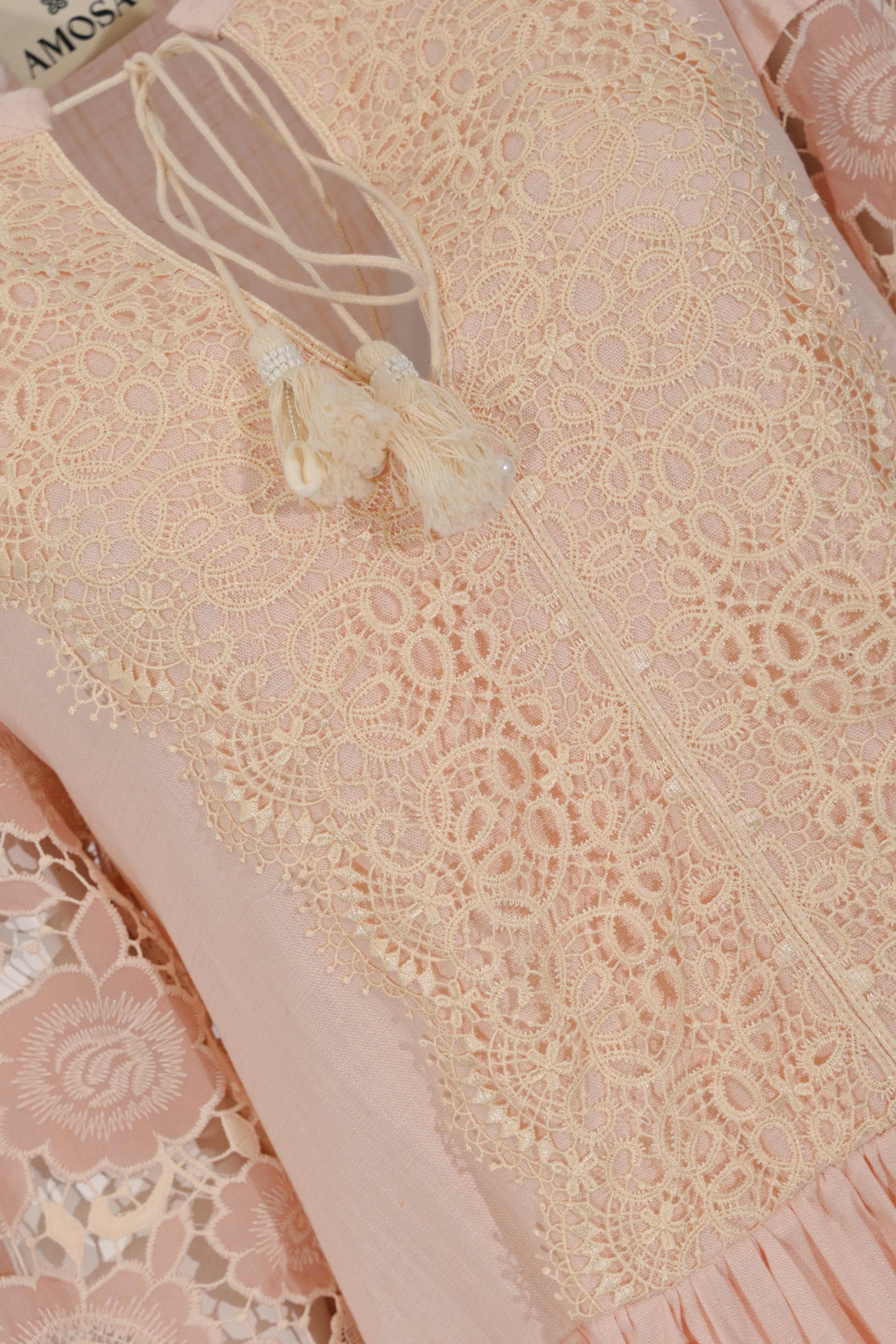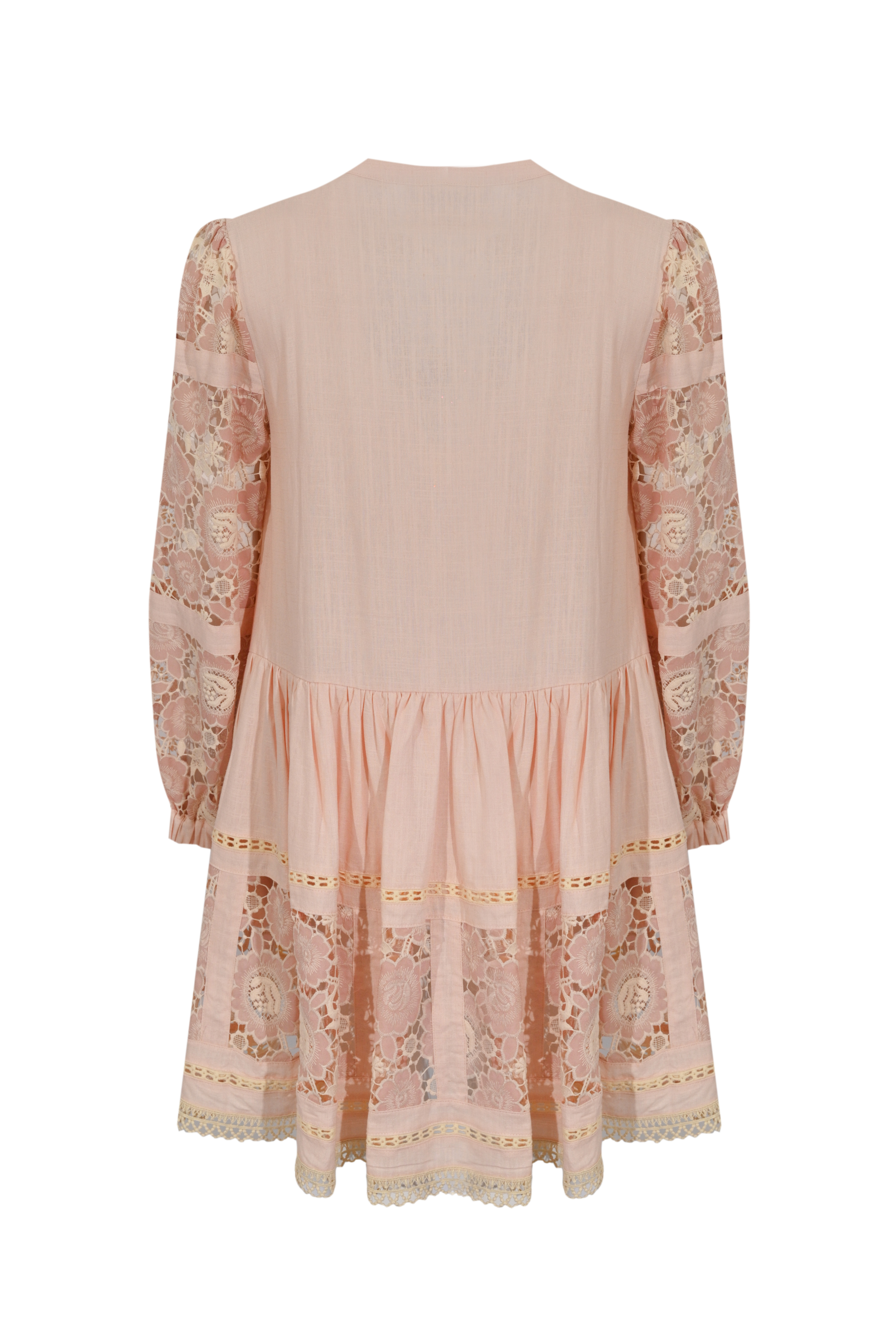 - Dettagli: pannello frontale in pizzo, maniche e fondo con lavorazione traforata, balza arricciata in vita, inserti decorativi e finiture ricamate, effetto leggermente trasparente