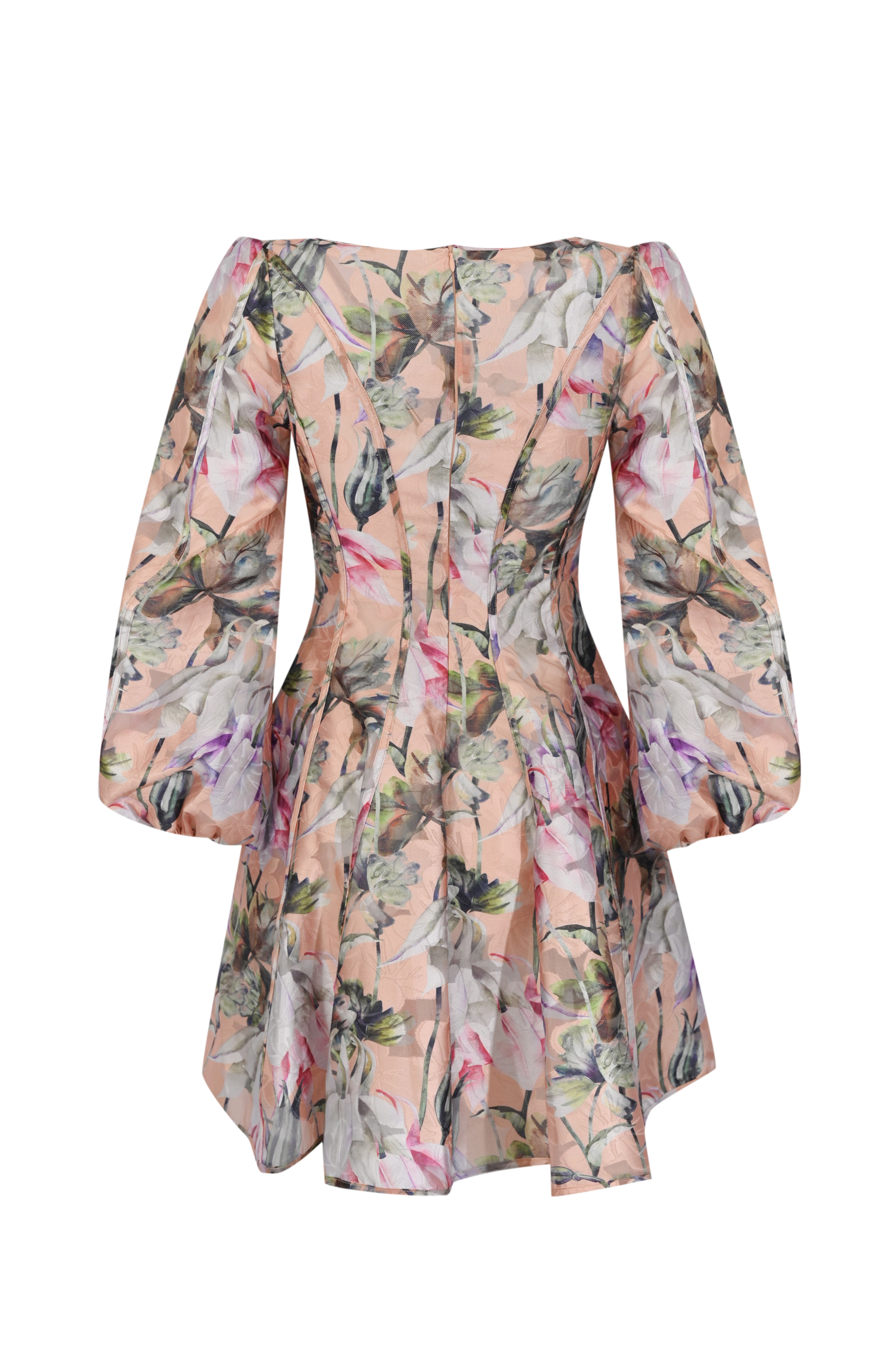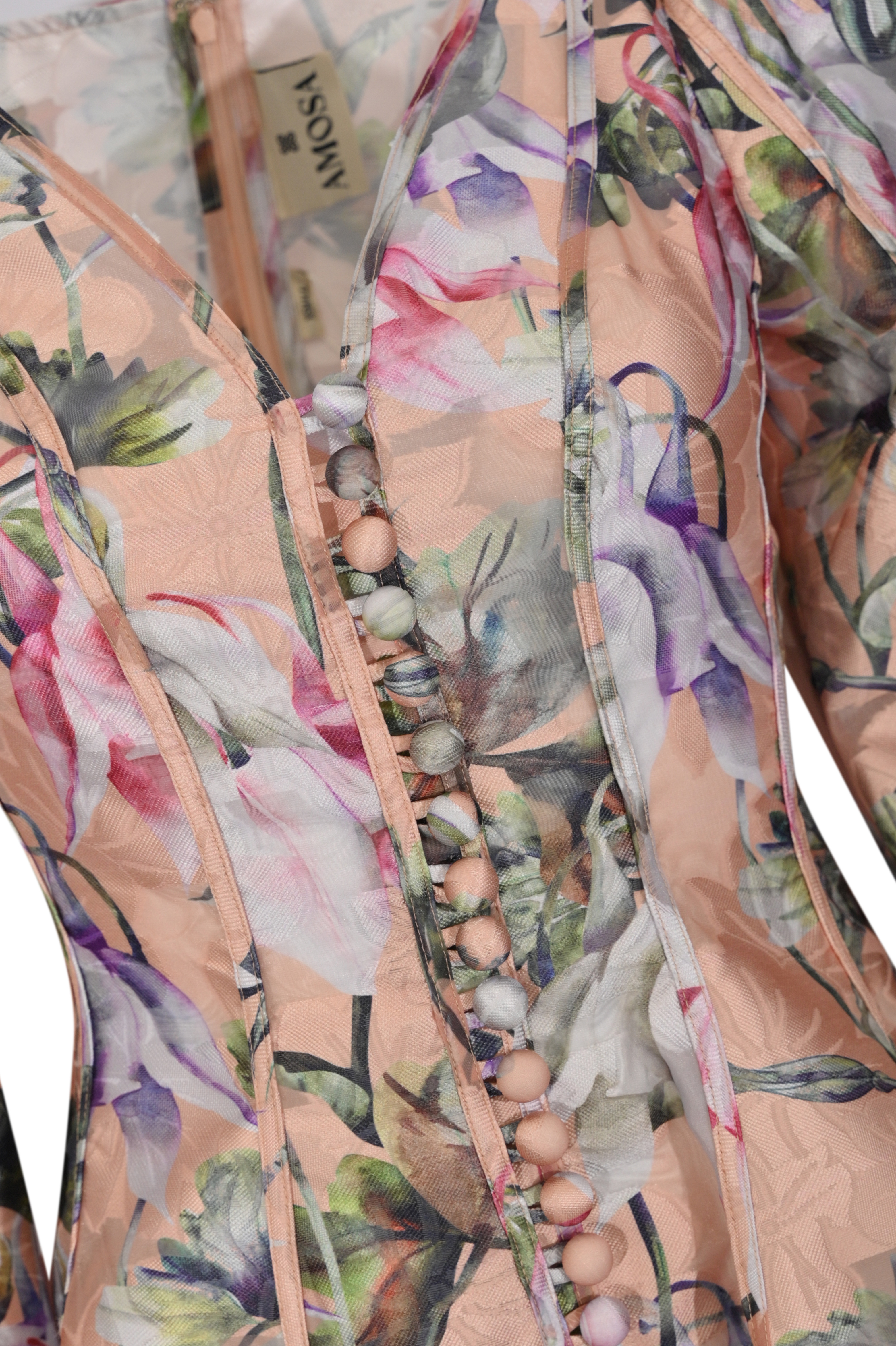 - Dettagli: costruzione con pannelli sagomati che valorizzano la figura, inserti verticali che slanciano la silhouette, bottoni decorativi tono su tono, stampa floreale delicata su base luminosa, tessuto leggermente trasparente che dona leggerezza, fondo leggermente svasato per un effetto femminile e dinamico