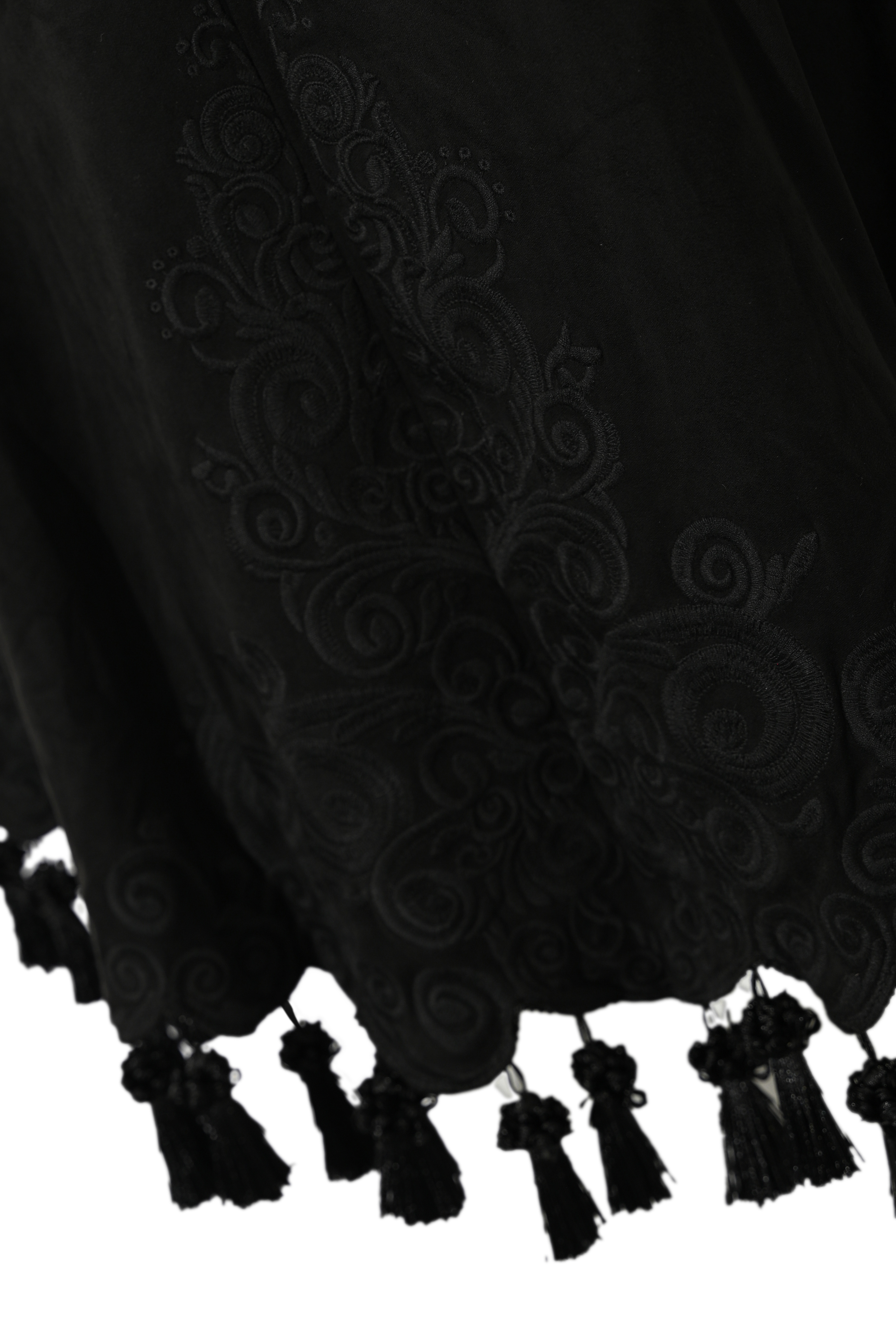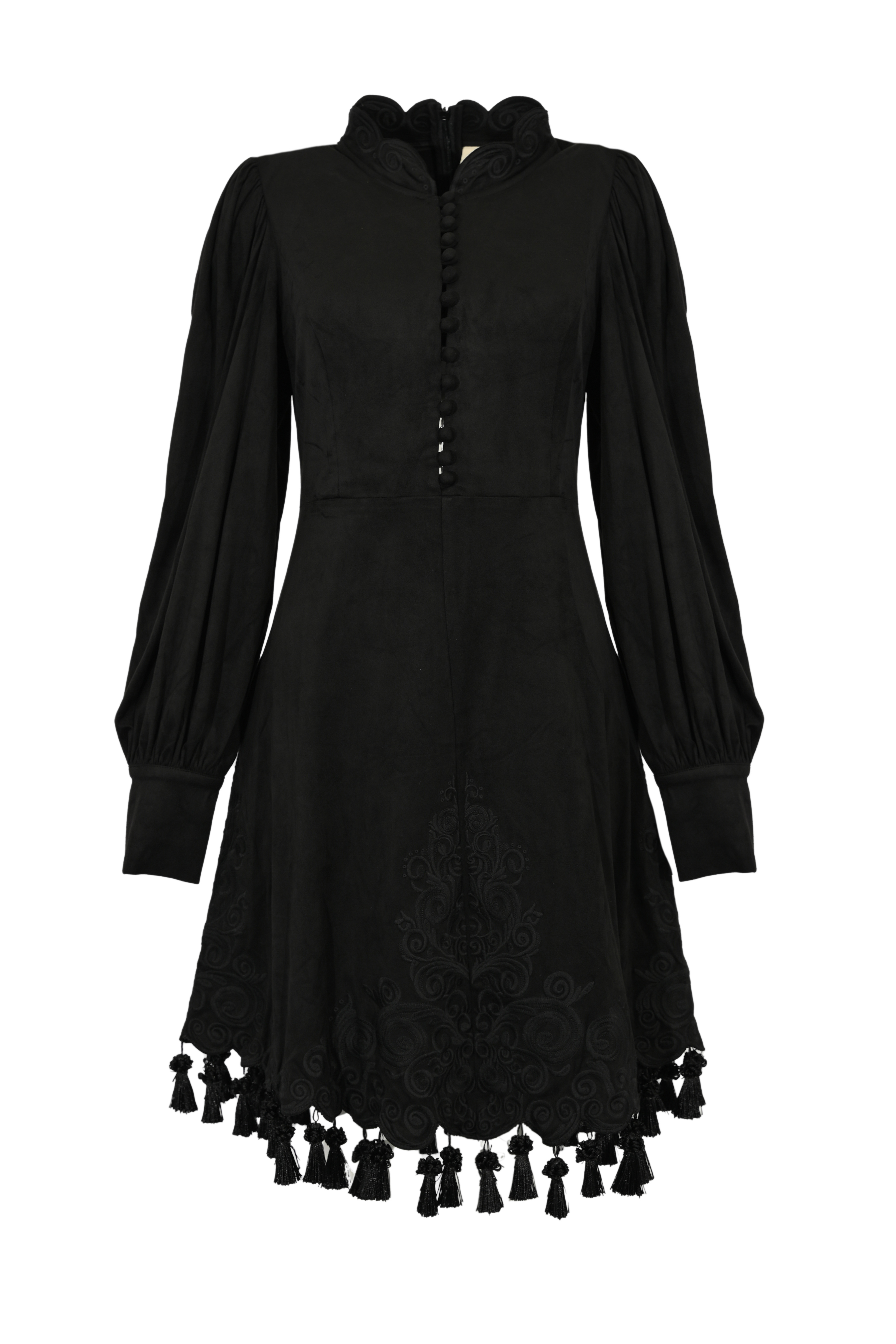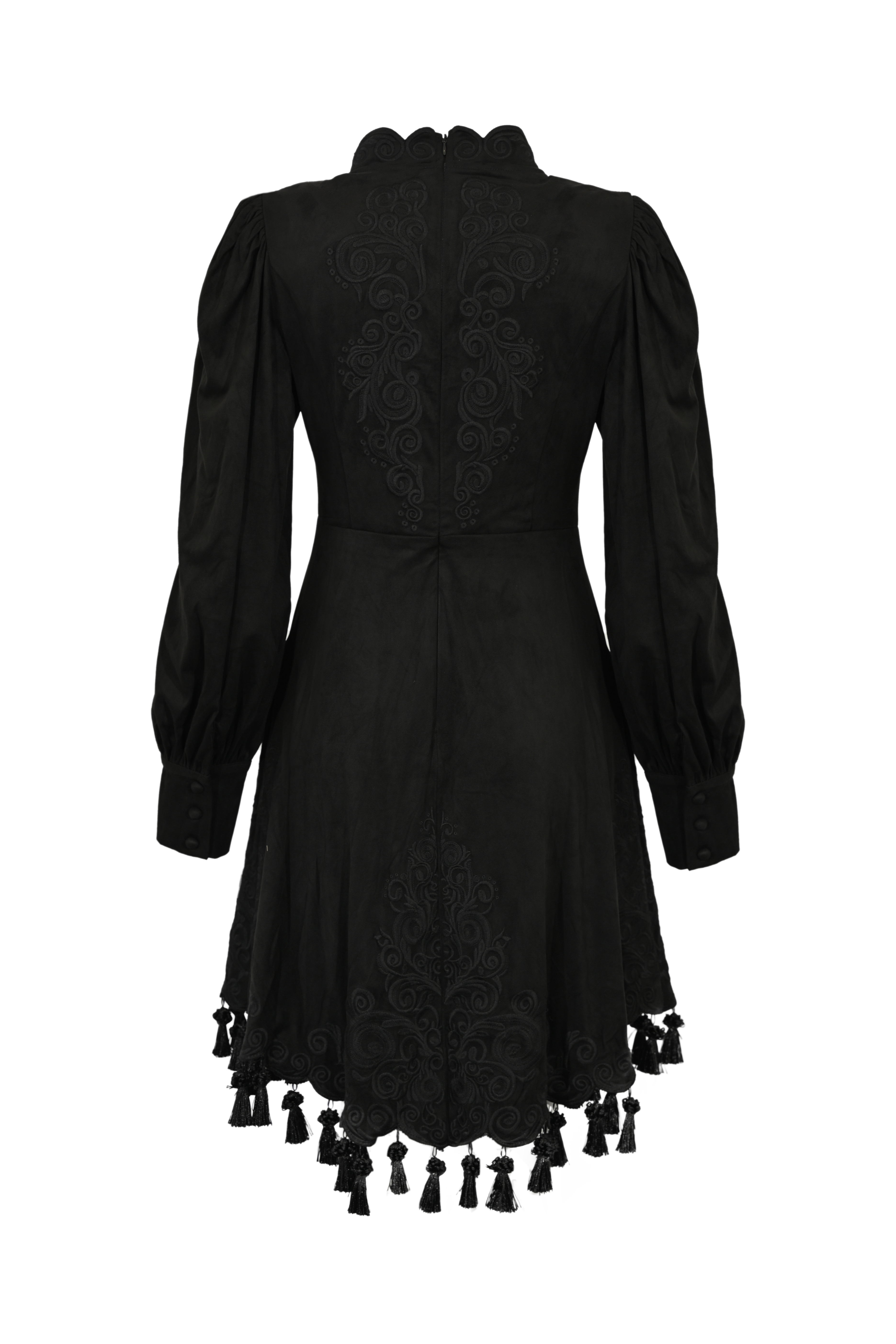 - Dettagli: ricami tono su tono su busto e retro, frange decorative sul fondo, taschini ornamentali, balze leggere