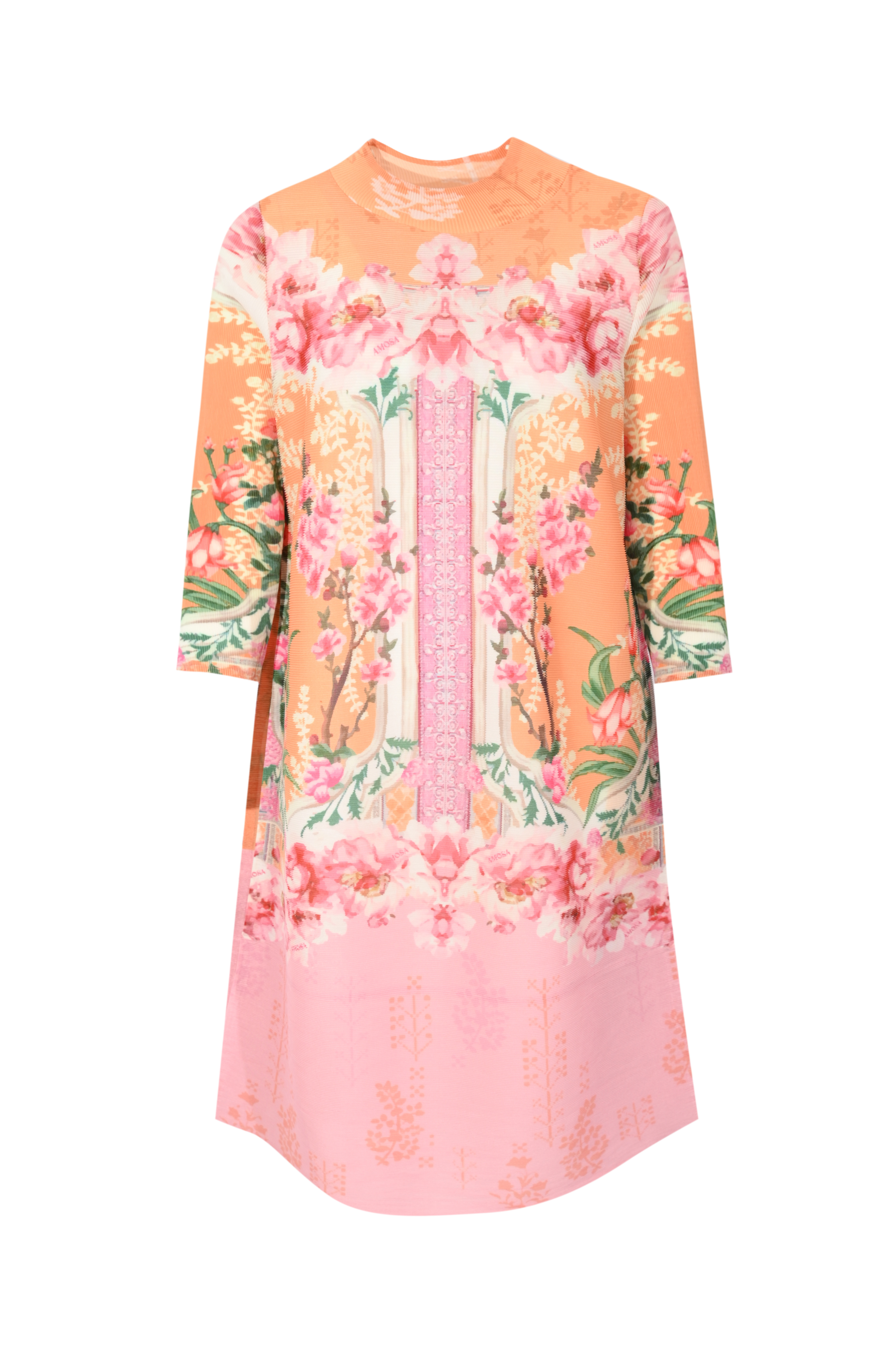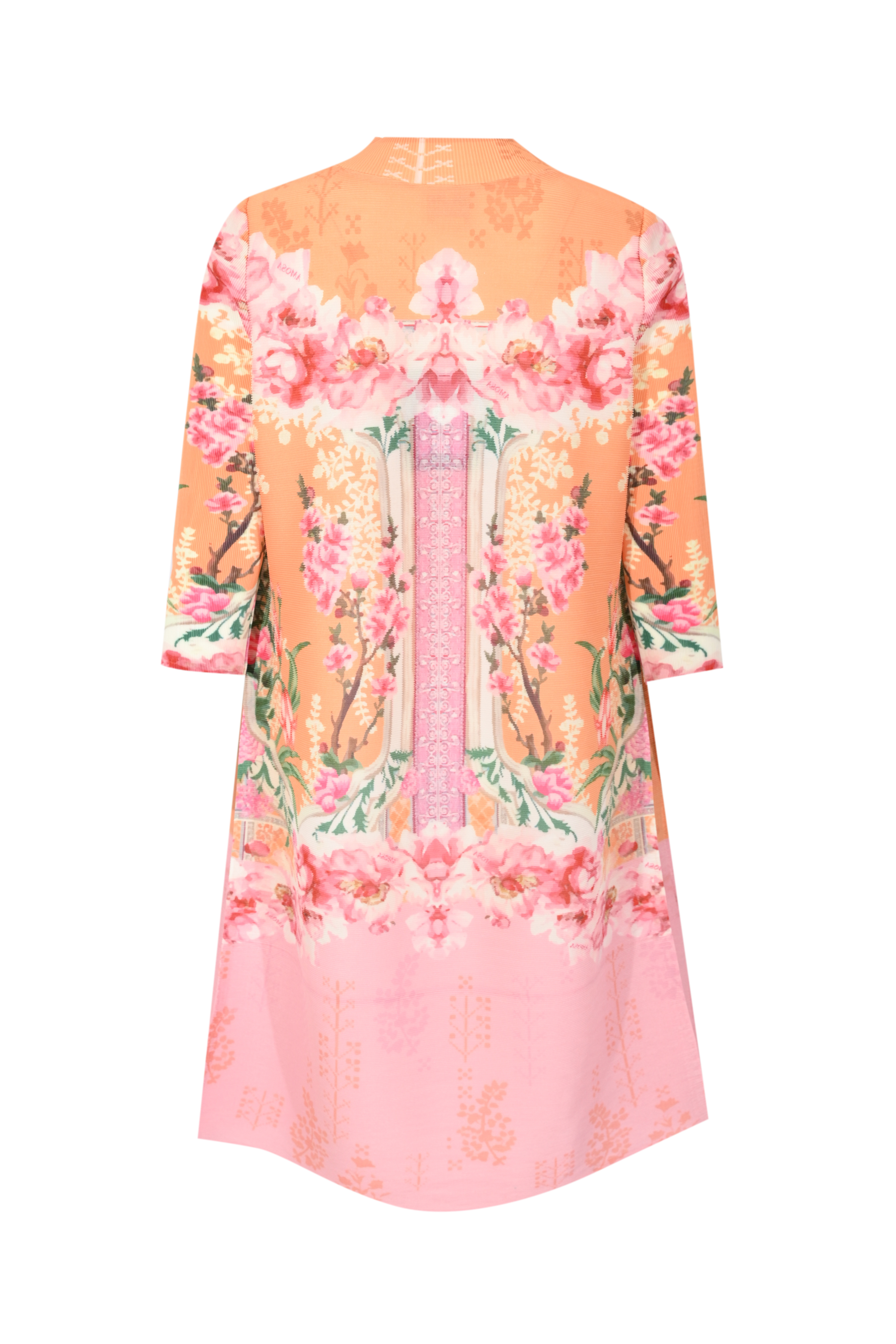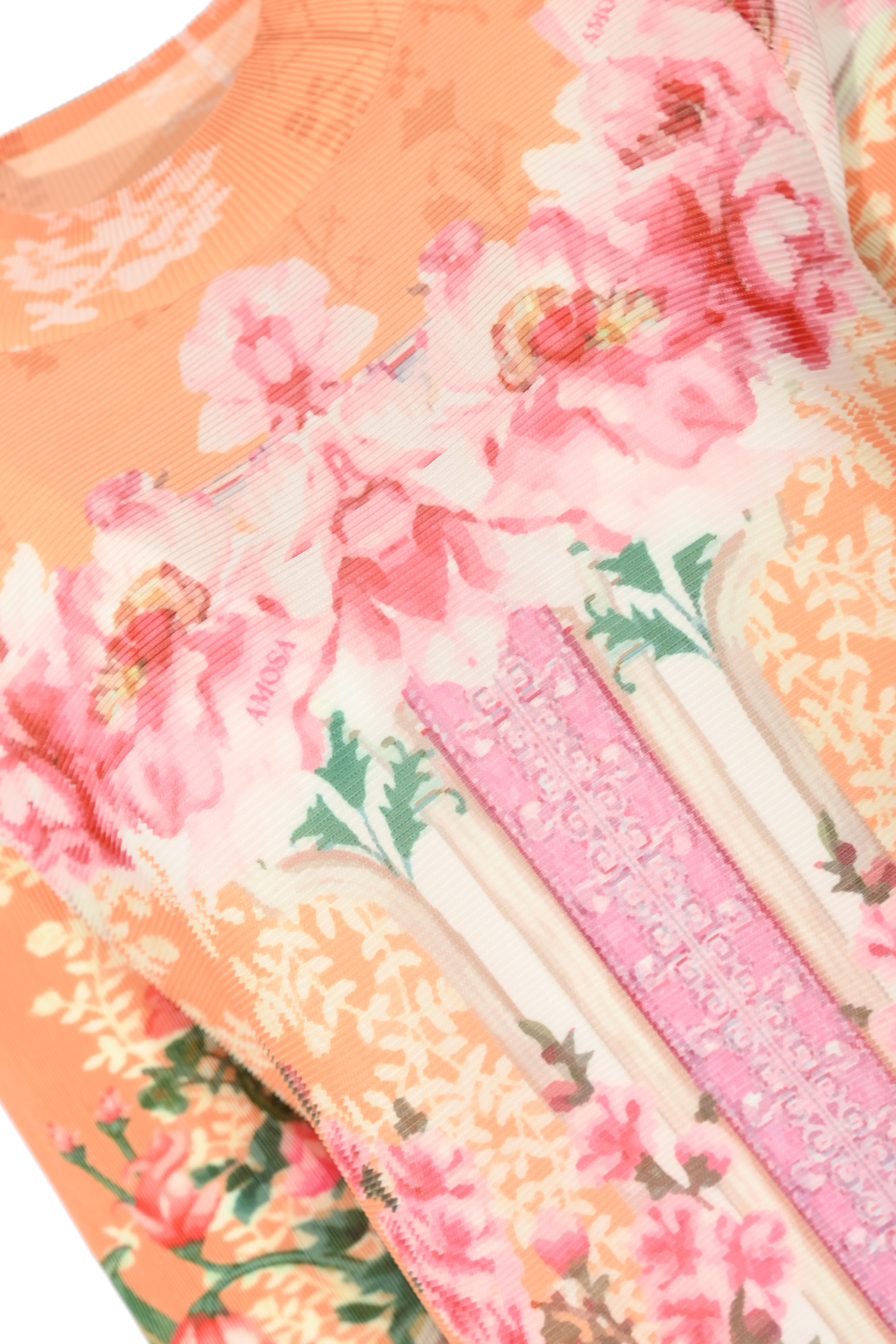 - Dettagli: lavorazione a costine che dona elasticità e comfort, stampa piazzata con motivo floreale e decorativo dal design simmetrico, effetto sfumato sui toni del rosa e arancio, linea pulita senza cuciture evidenti, capo leggero e versatile adatto sia a look casual che più ricercati