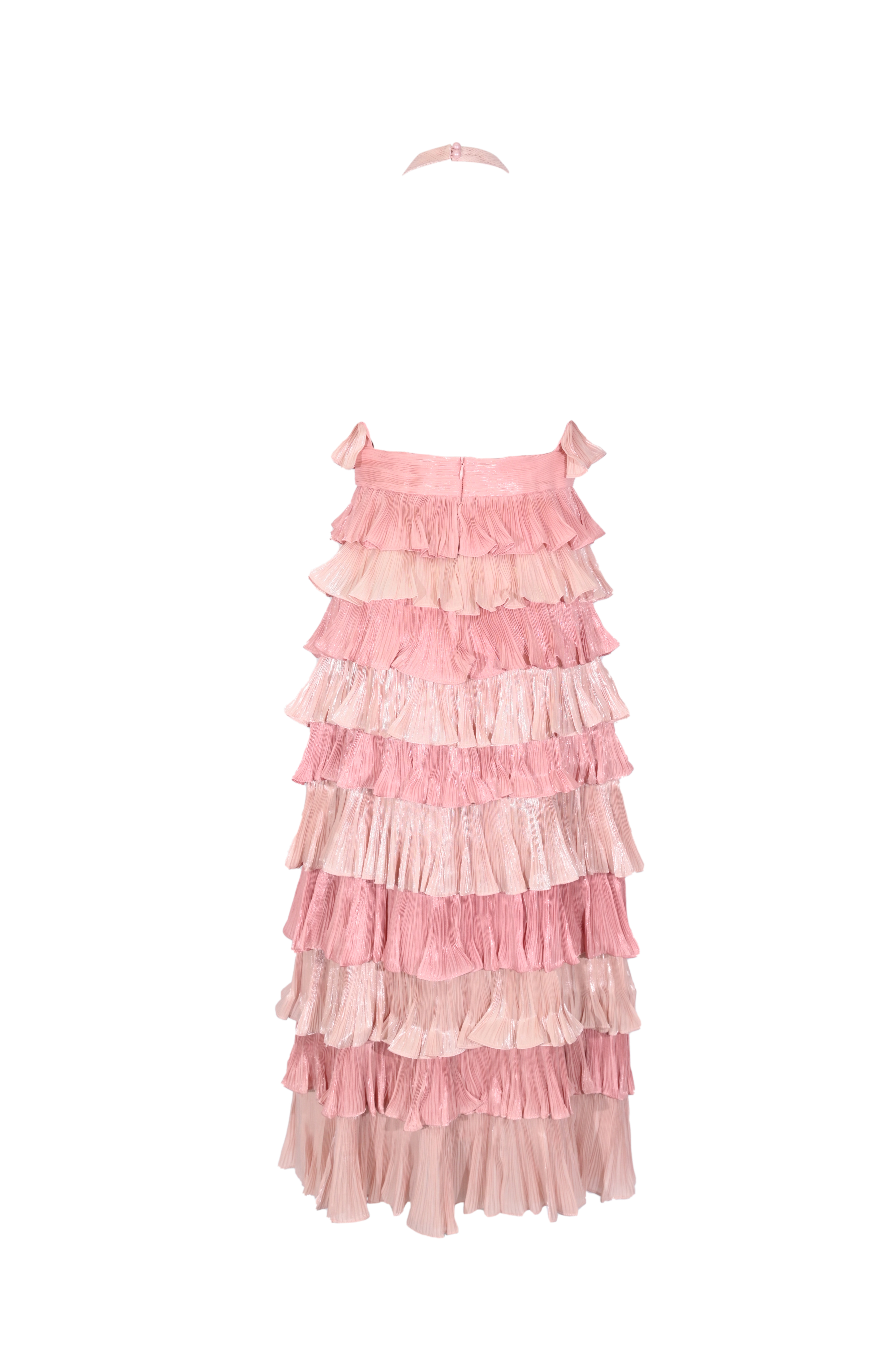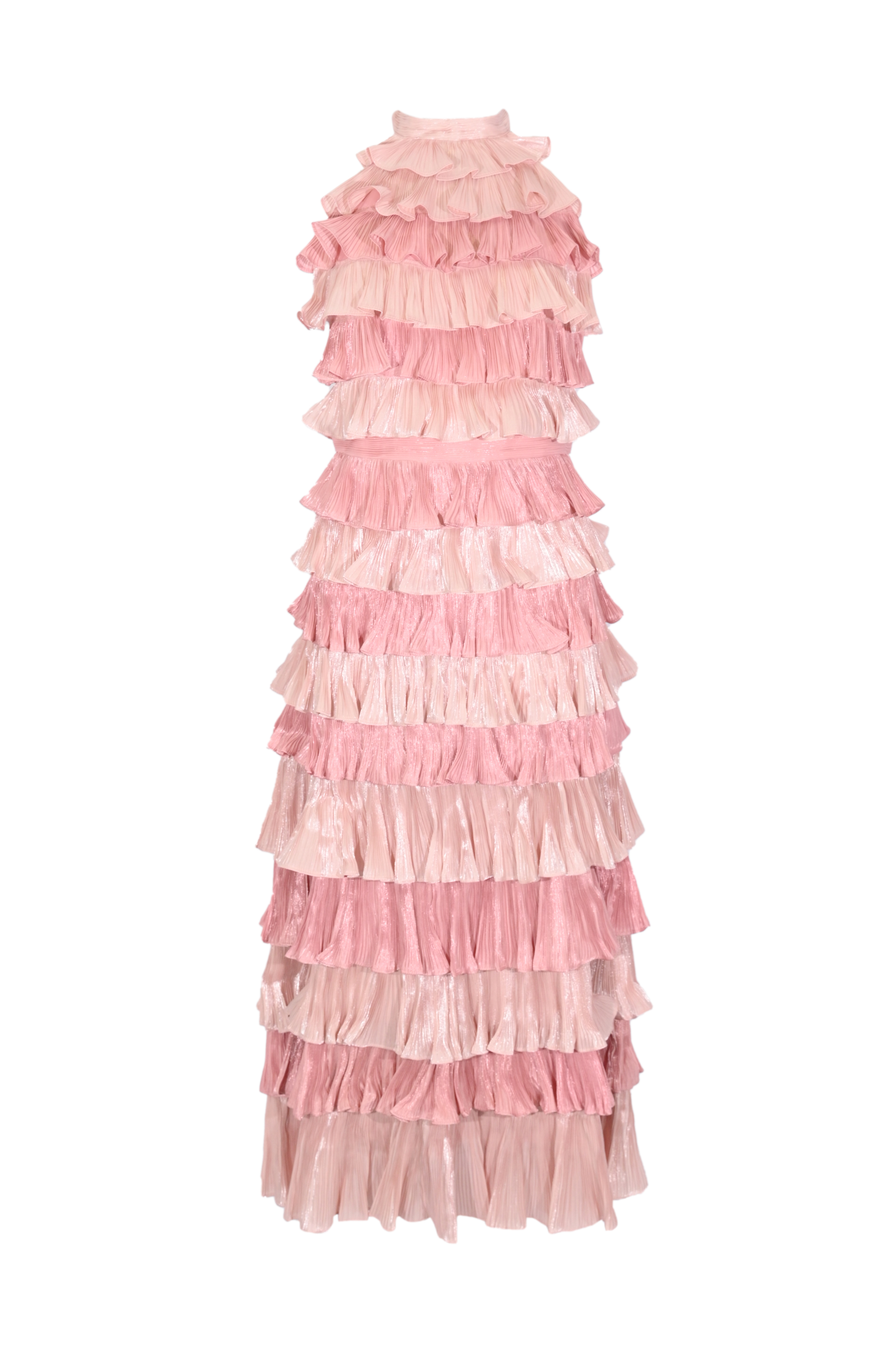 - Dettagli: lavorazione a balze con rouches su tutta la lunghezza, effetto degradé nelle tonalità del rosa, tessuto leggermente brillante