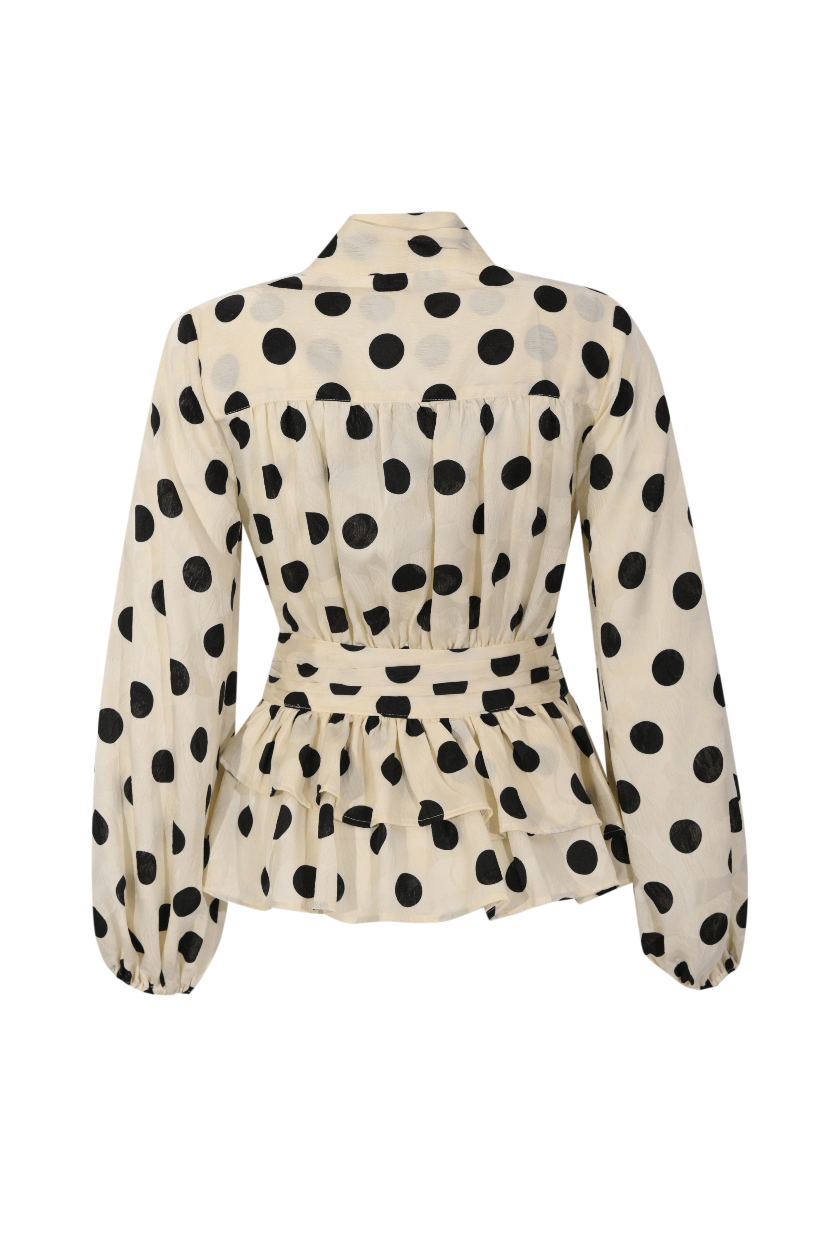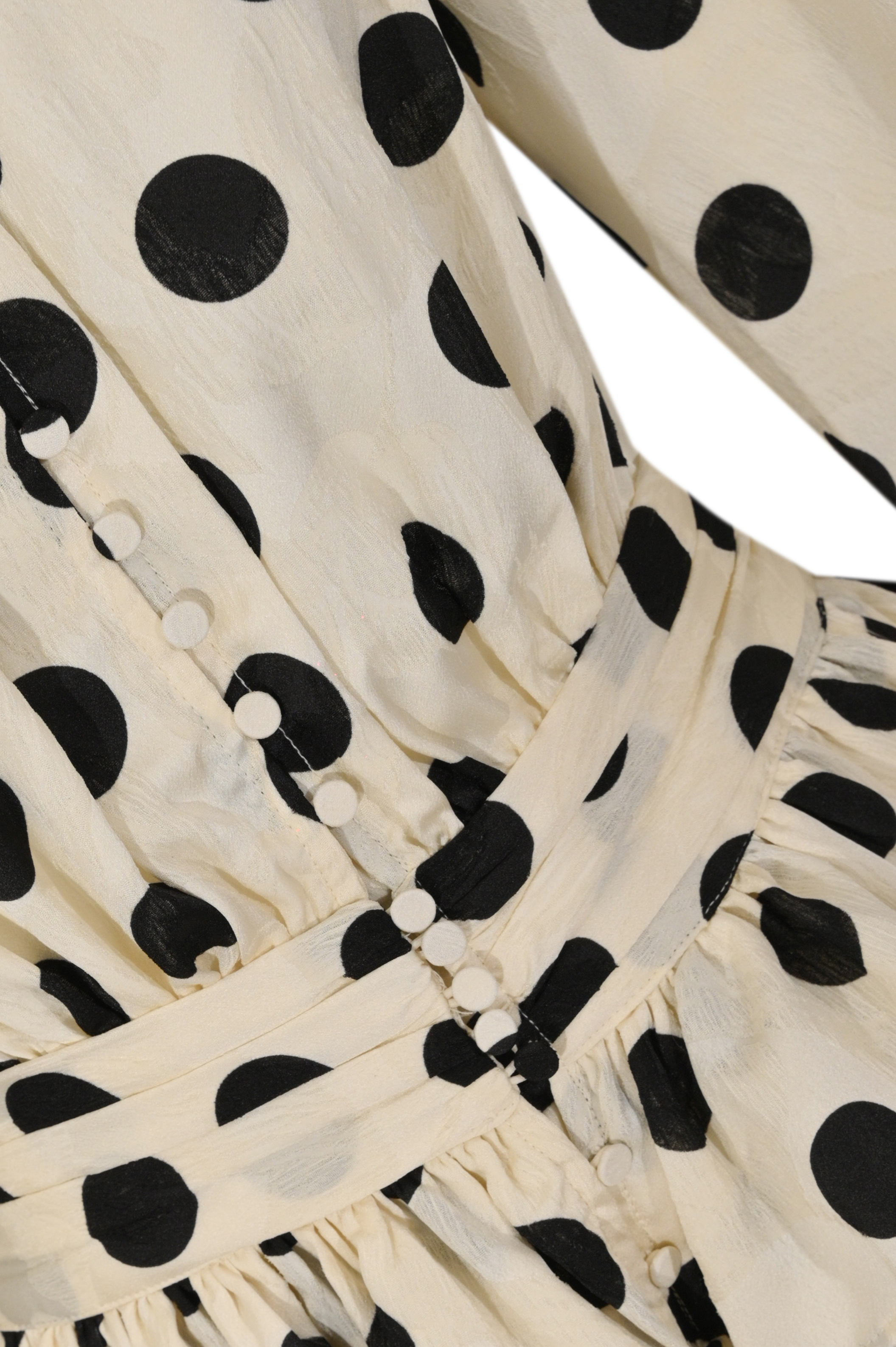 - Dettagli: vita con balza arricciata e cinturino, tessuto leggero e leggermente trasparente, arricciature su spalle e schiena, effetto fluido e femminile
