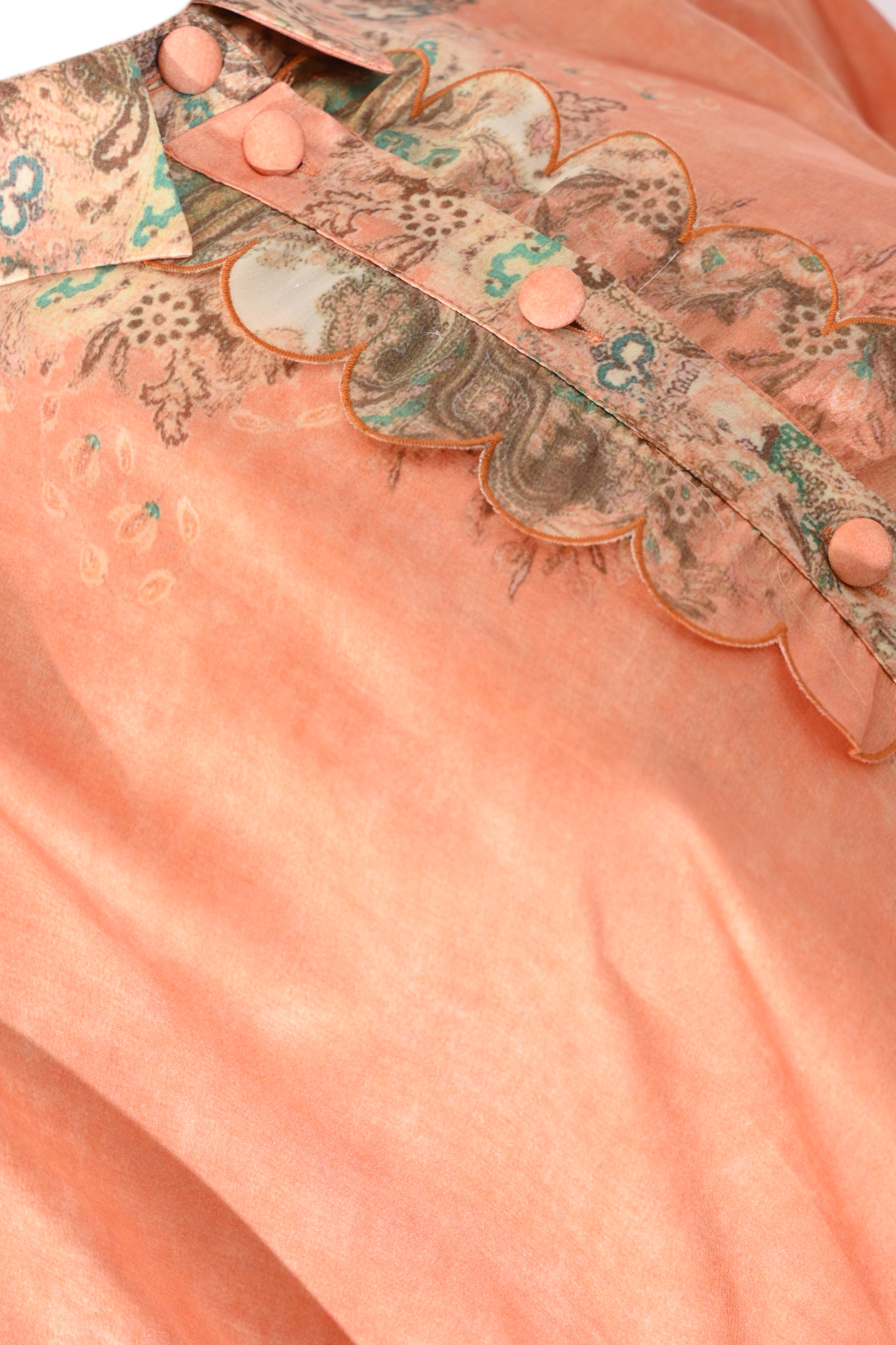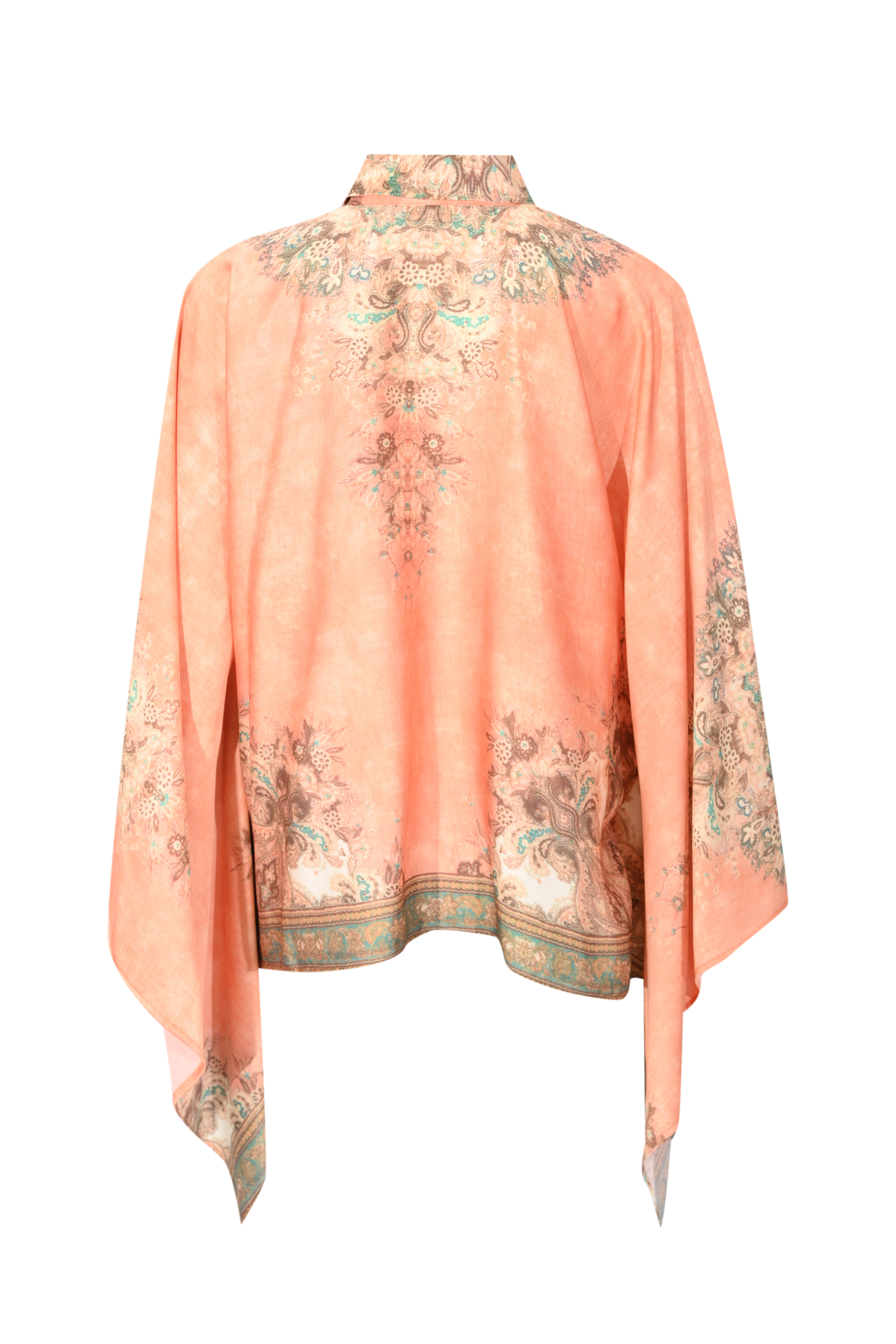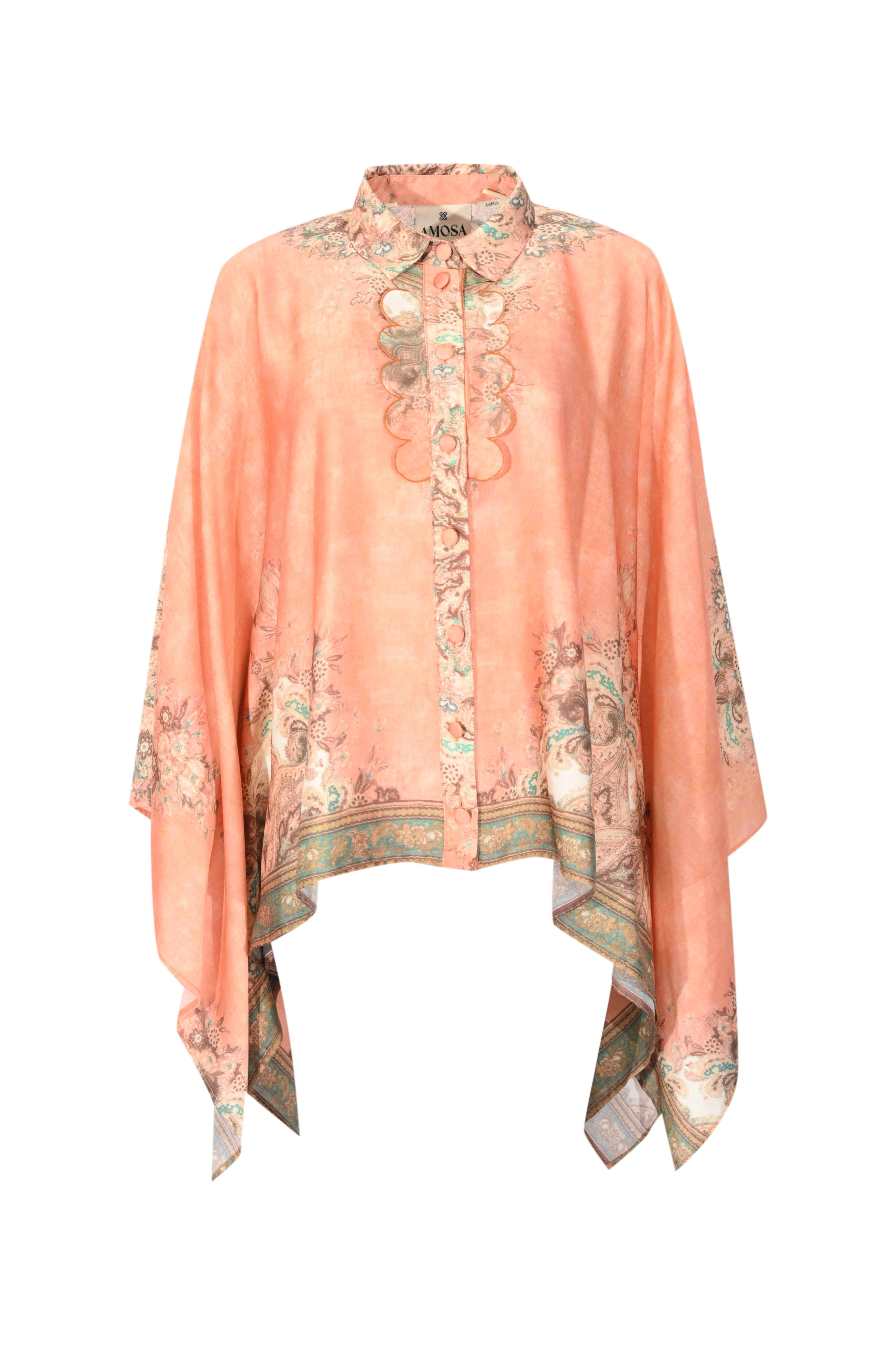 - Dettagli: linea ampia e ariosa che dona movimento al capo, stampa ricca con motivi decorativi e bordature a contrasto, inserto frontale con profilo ondulato decorativo, tessuto morbido e leggermente lucente che valorizza la fantasia, fondo asimmetrico con punte laterali per un effetto dinamico, ideale per look eleganti ma rilassati