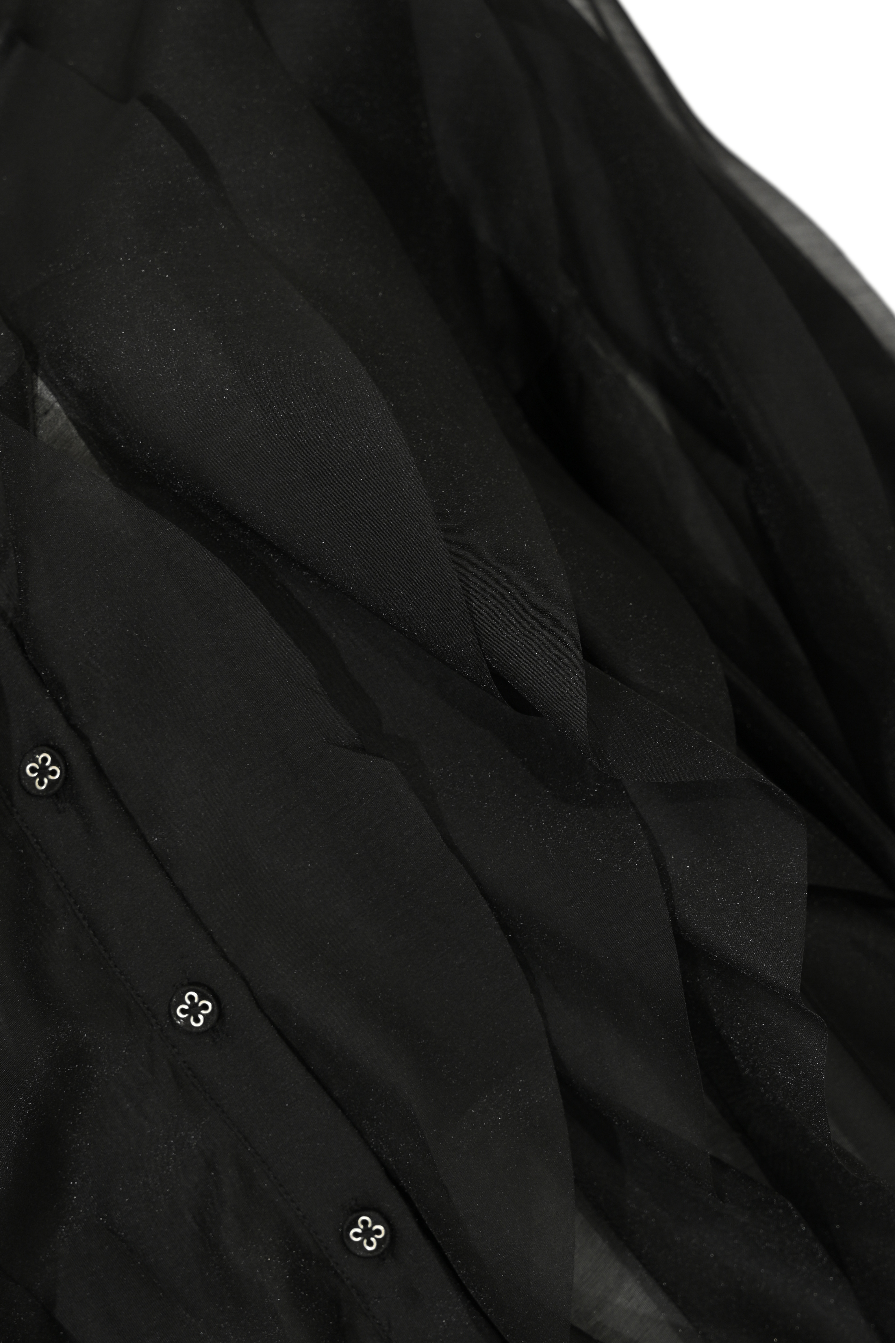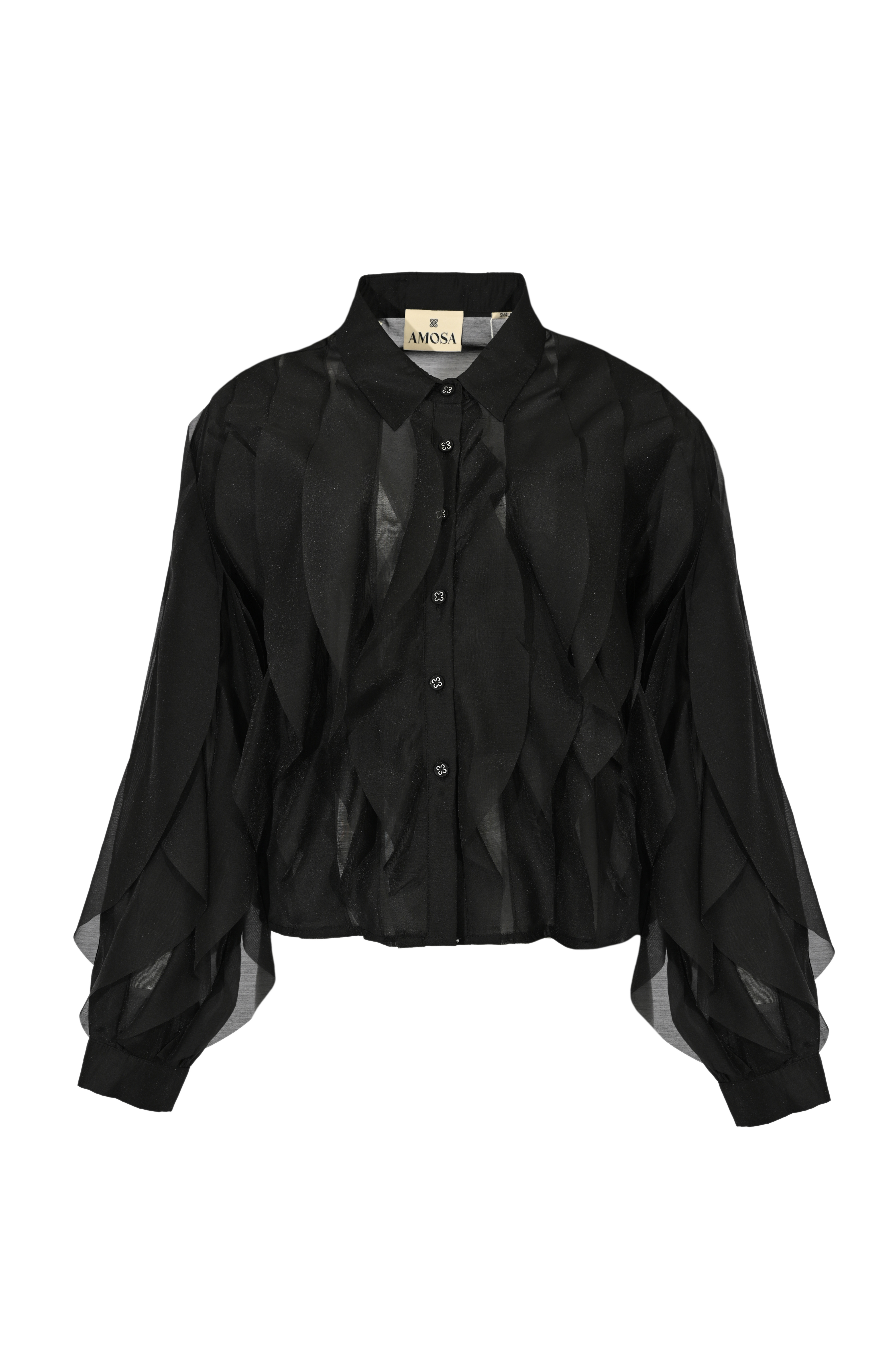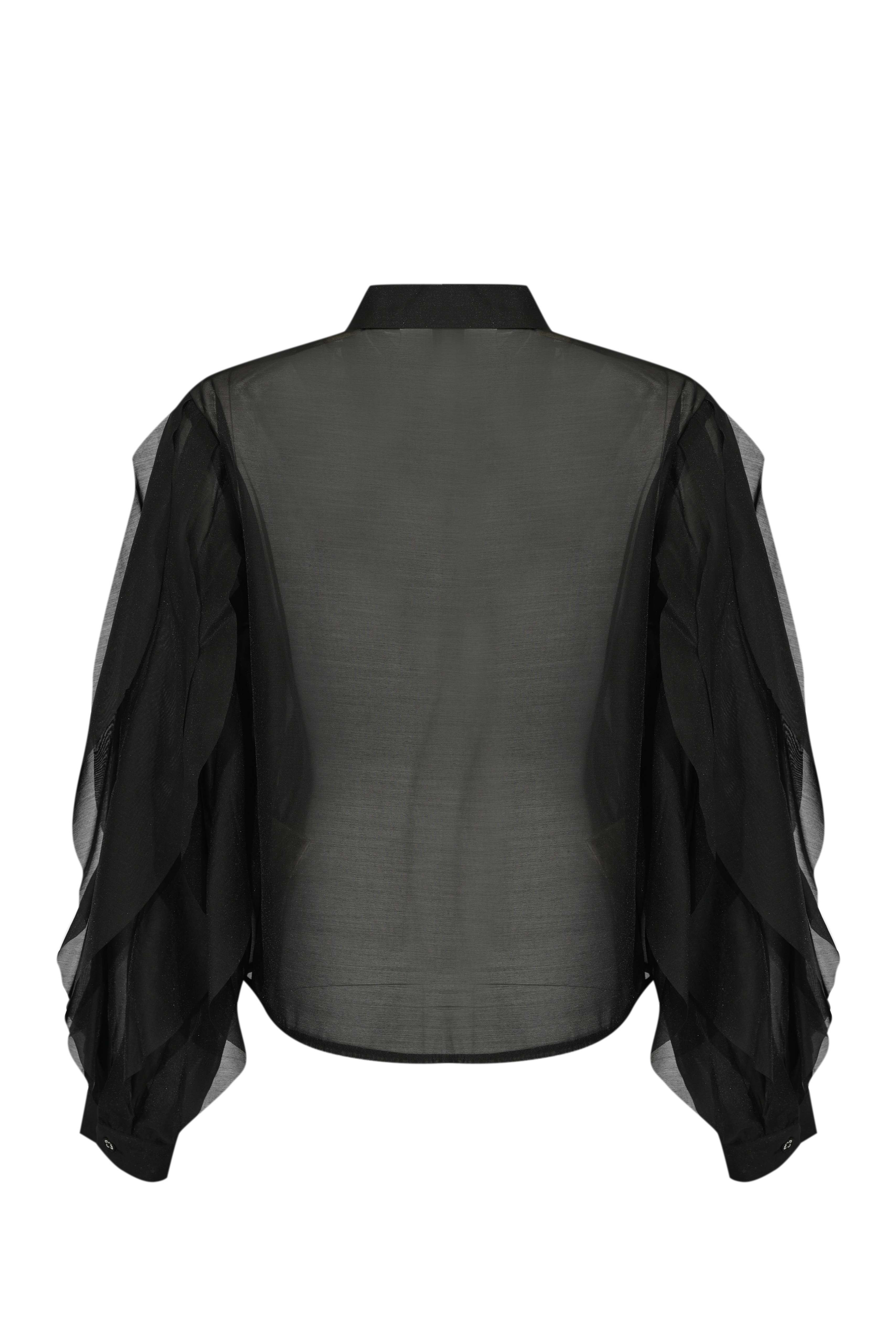 - Dettagli: volant decorativi su davanti e maniche, polsini con bottone, struttura morbida e fluida