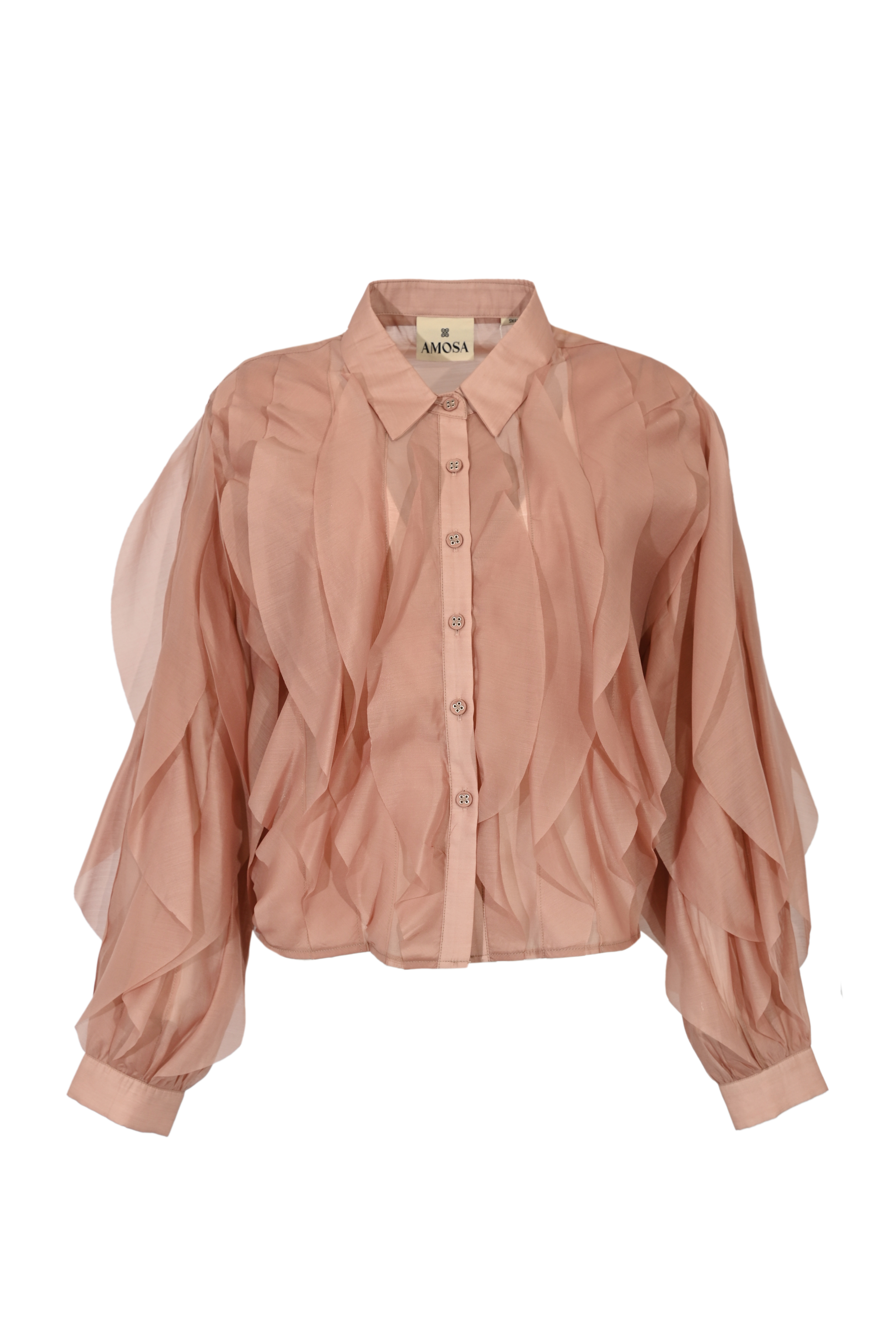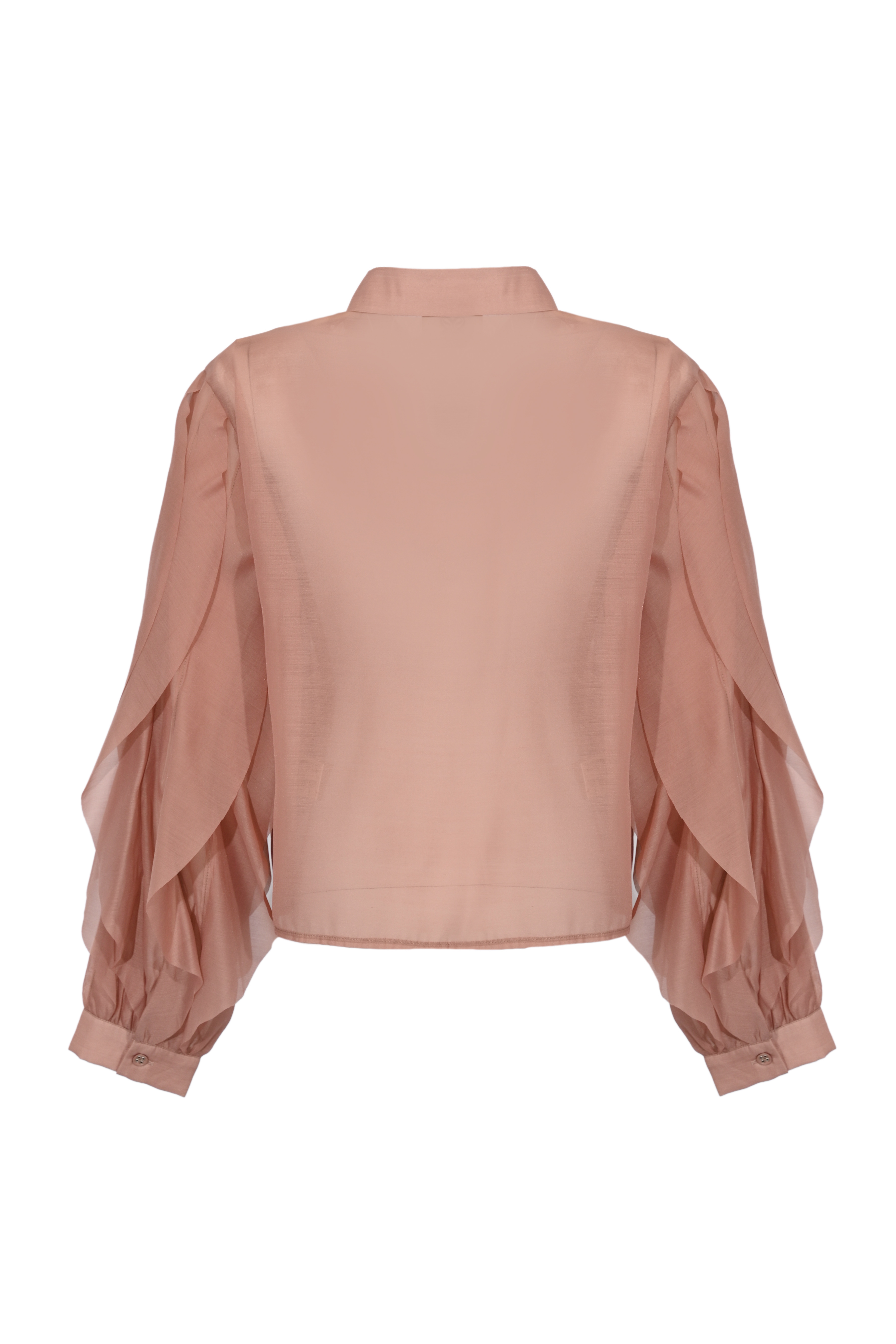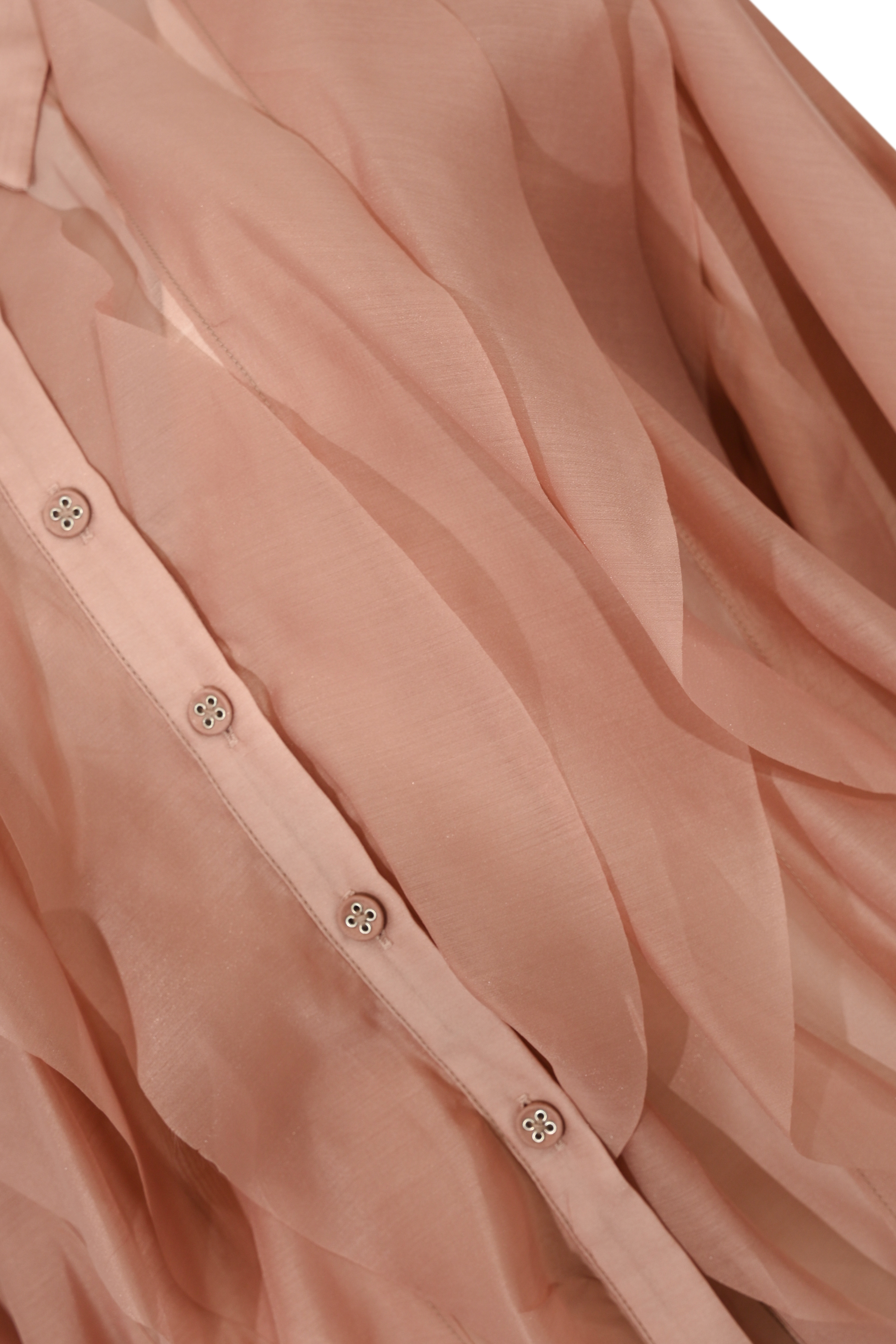 - Dettagli: volant decorativi su davanti e maniche, polsini con bottone, struttura morbida e fluida