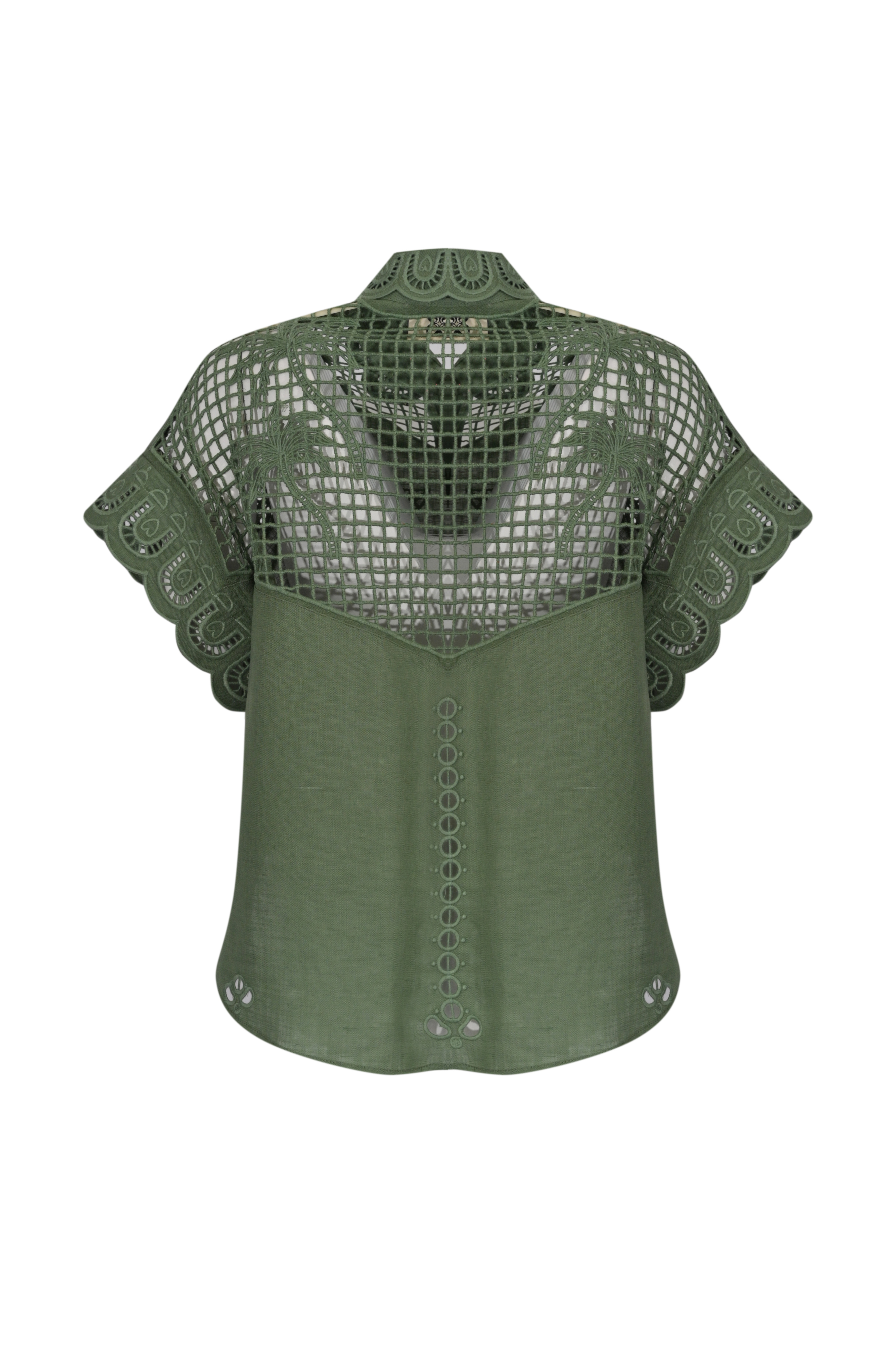 - Dettagli: lavorazione traforata su spalle e parte superiore per un effetto leggero e raffinato, ricami floreali tono su tono sul davanti e sul retro, inserti in pizzo con motivi geometrici e floreali, bordo smerlato su maniche e colletto, linea pulita valorizzata da dettagli artigianali che donano eleganza e femminilità