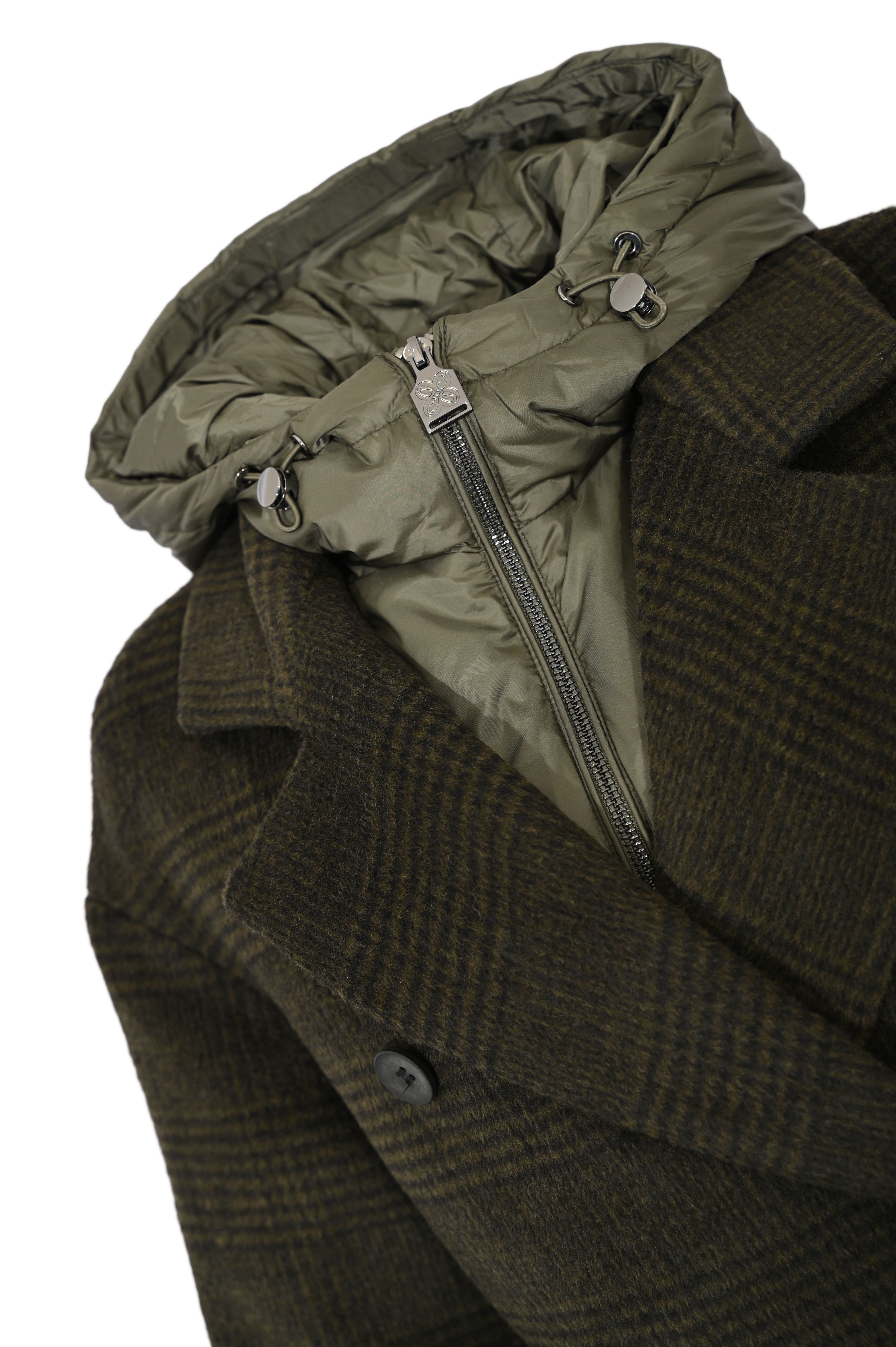 - Tessuto: Esterno in lana a fantasia check; inserti e cappuccio in nylon imbottito