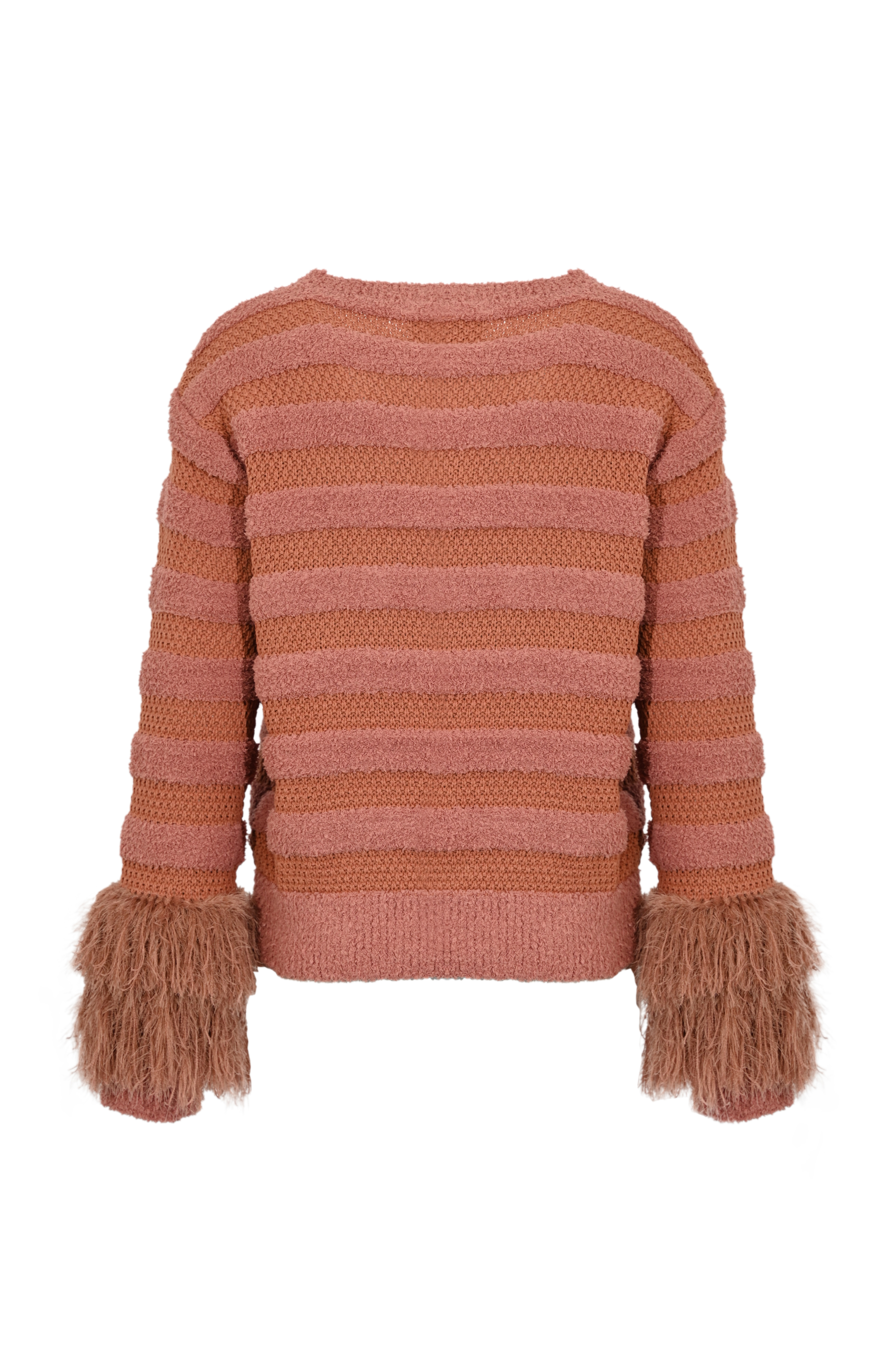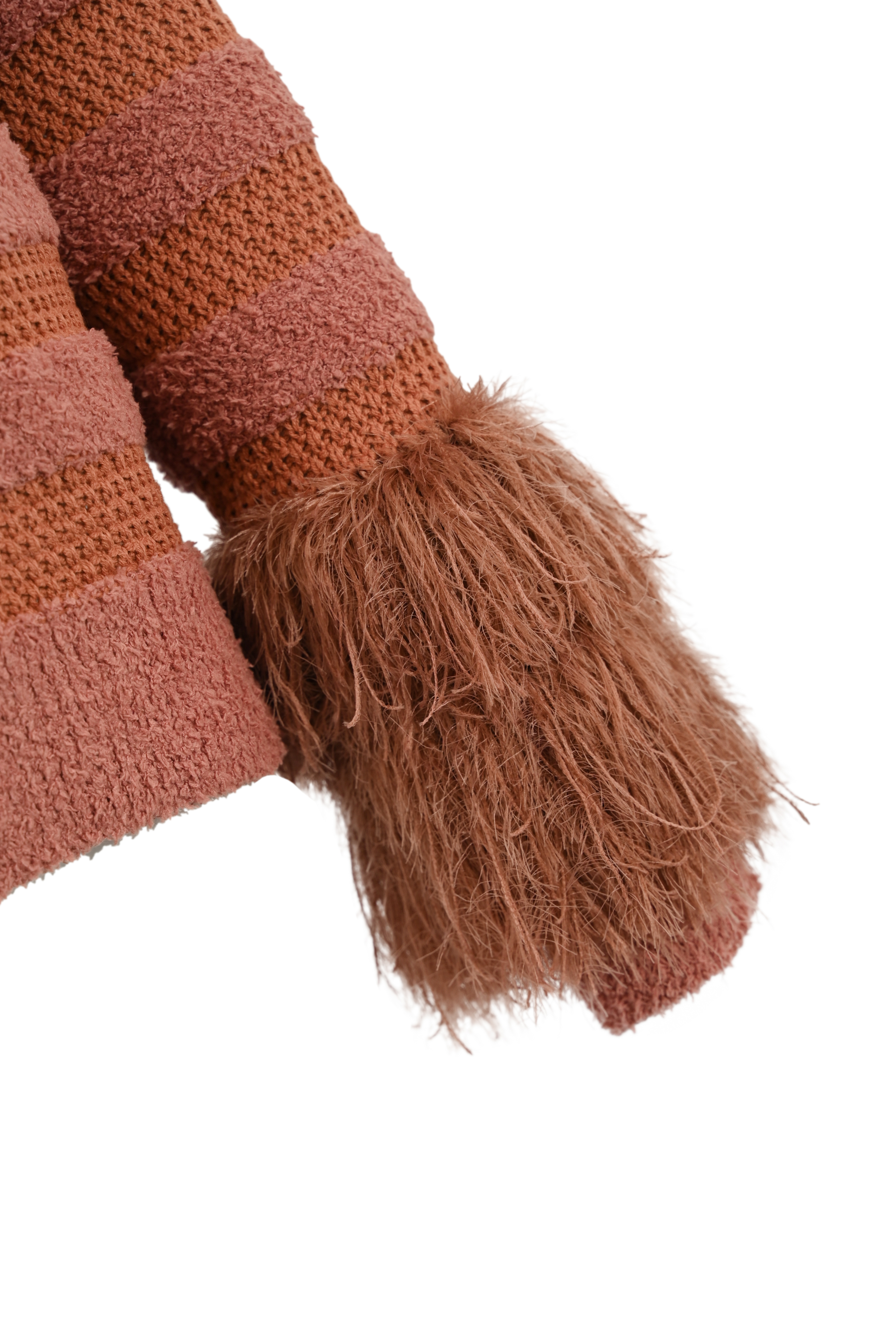 - Dettagli: lavorazione a righe alternate bouclé e tricot, frange lunghe applicate ai polsini, finiture a costine su fondo, collo e polsini