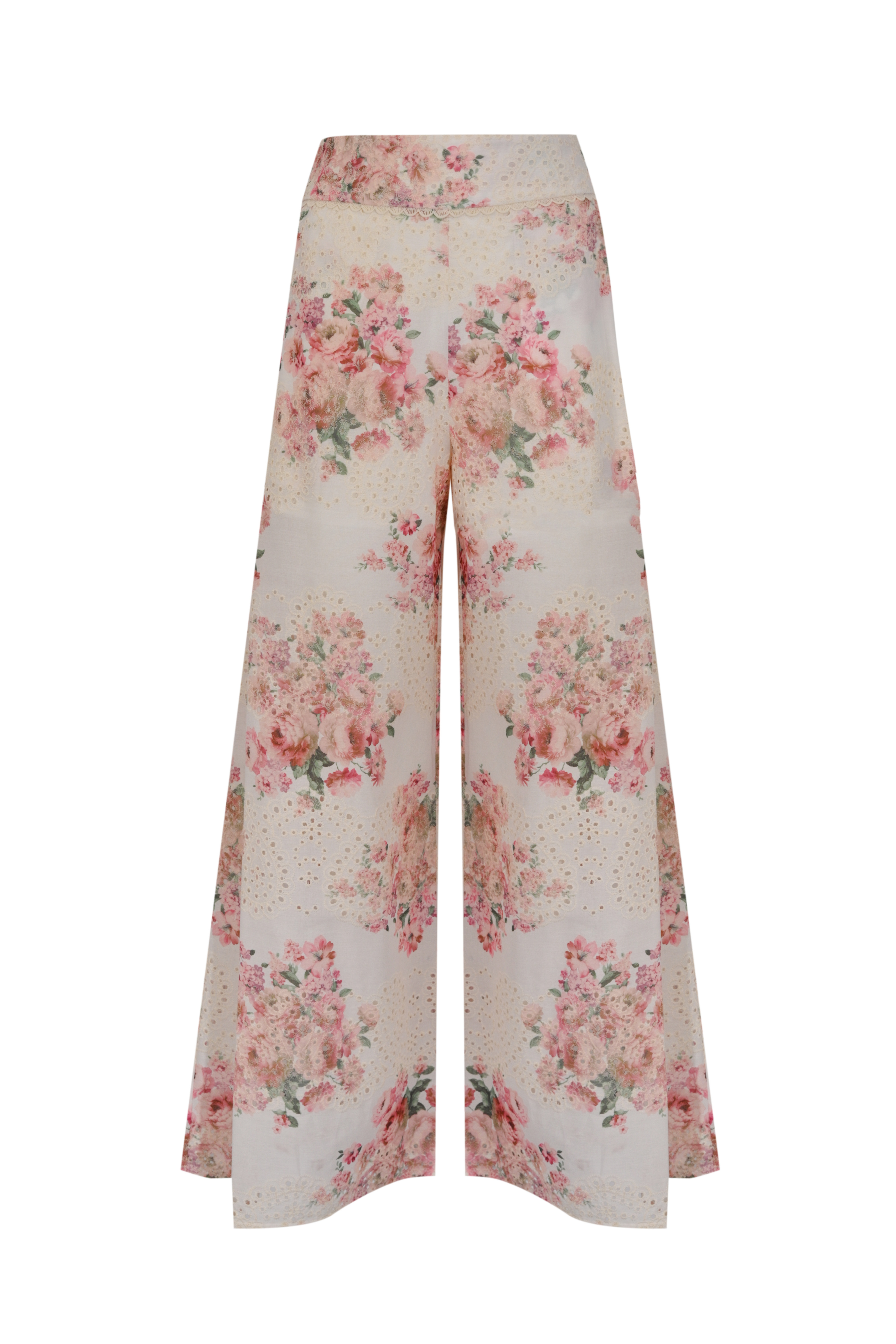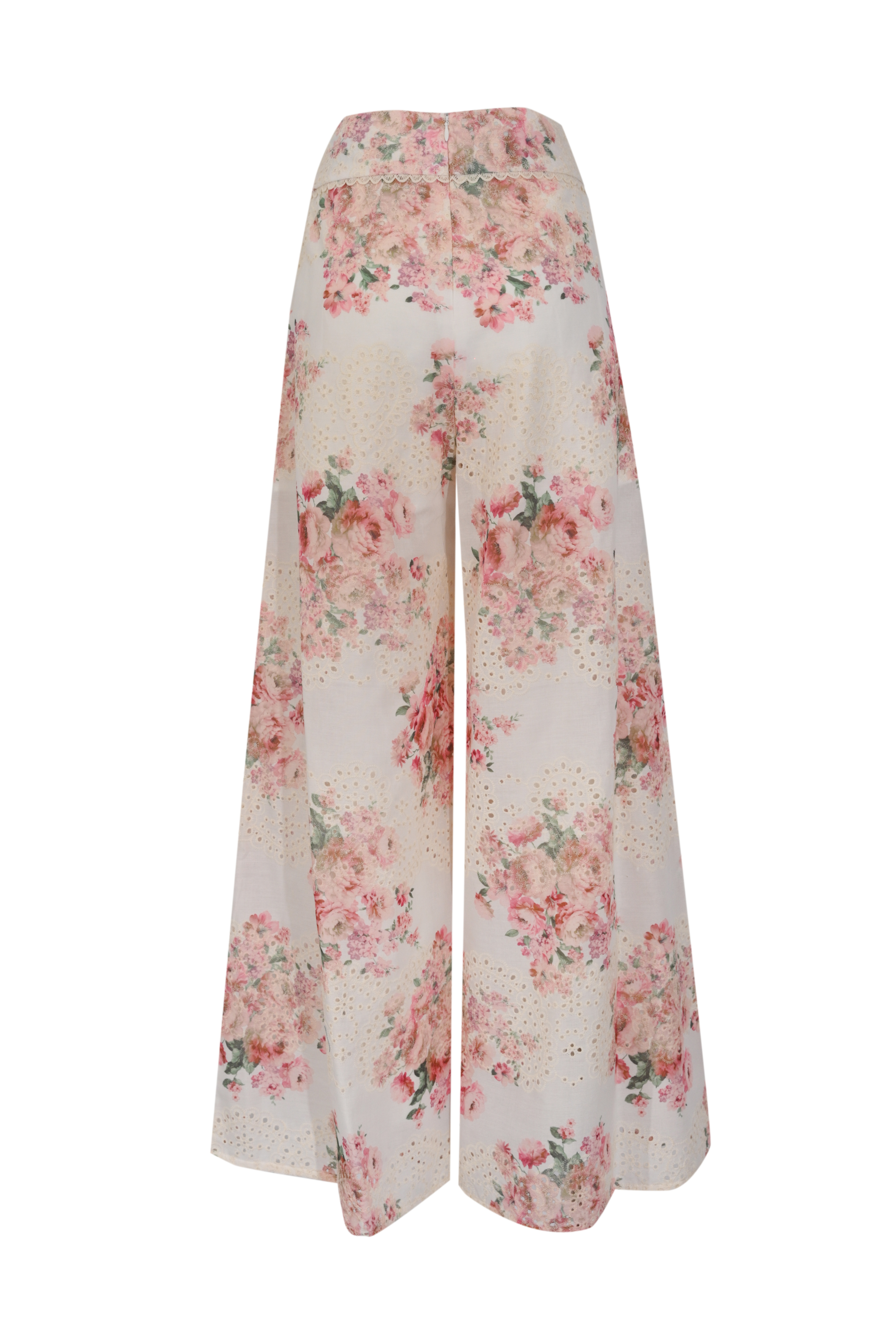 Pantalone ampio in cotone sangallo con stampa floreale