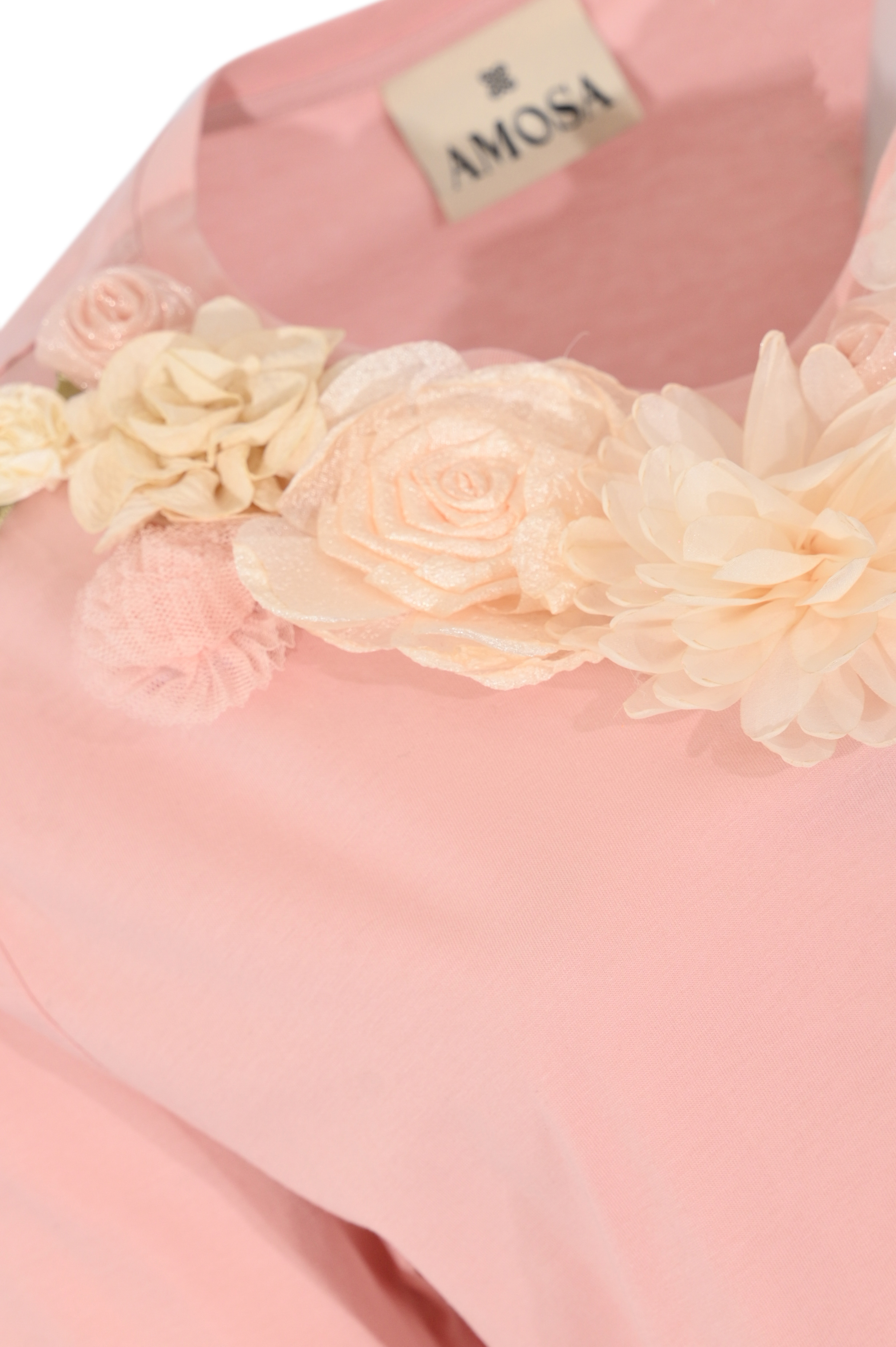 - Dettagli: applicazioni floreali tridimensionali in tessuto sul girocollo con lavorazione decorativa