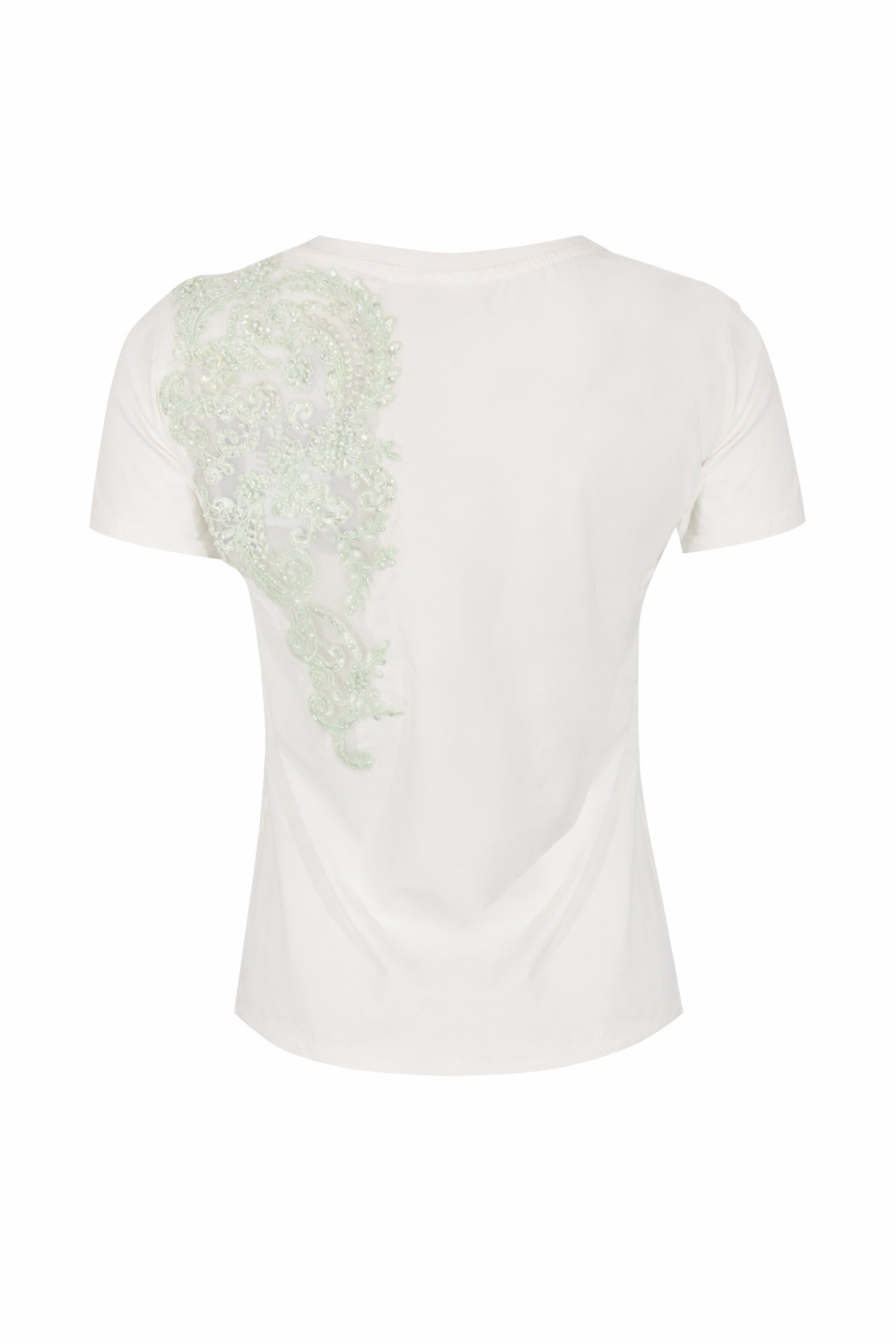 - Dettagli: inserto in pizzo con ricami e perline applicato su spalla e lato frontale e posteriore, lavorazione decorativa elegante