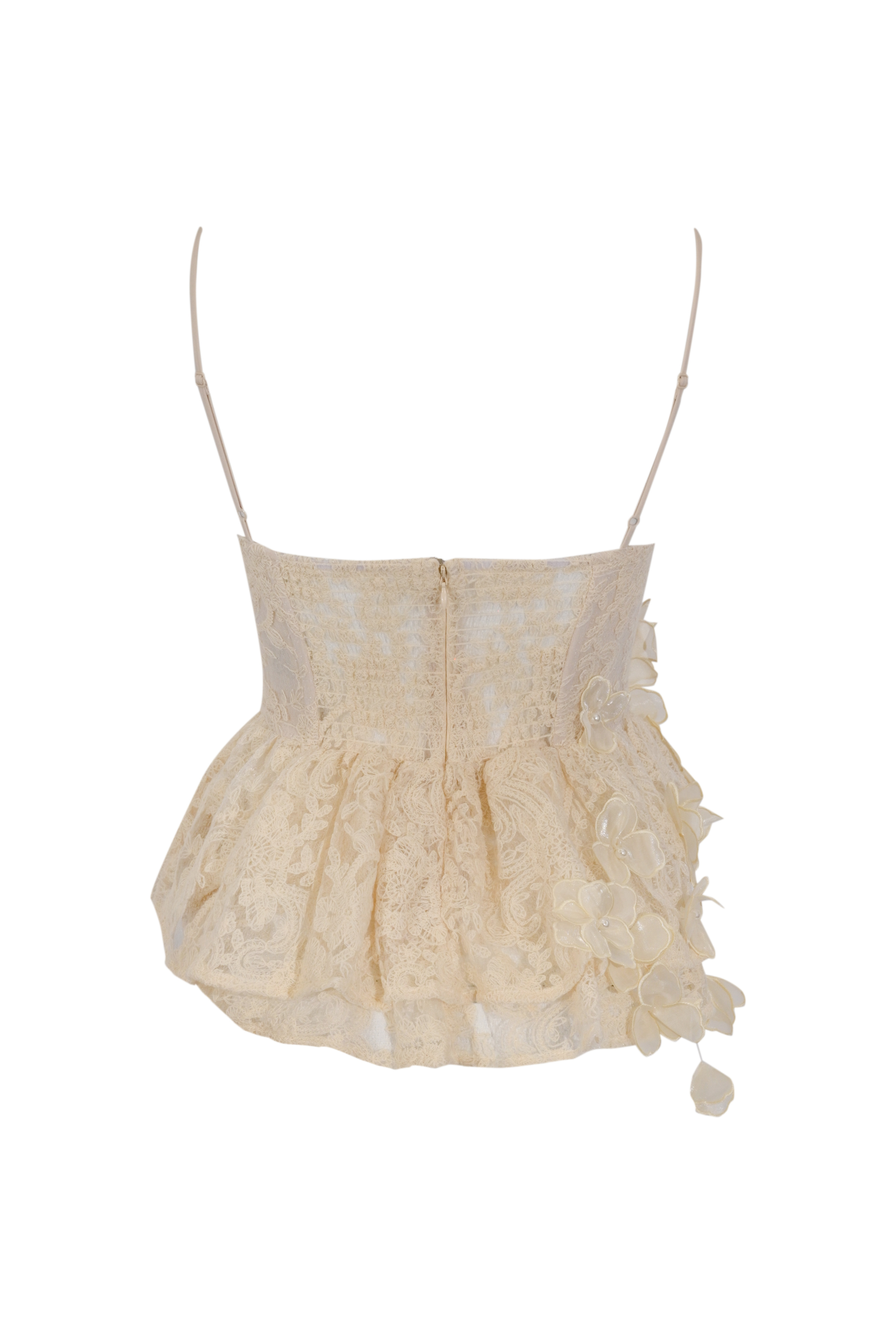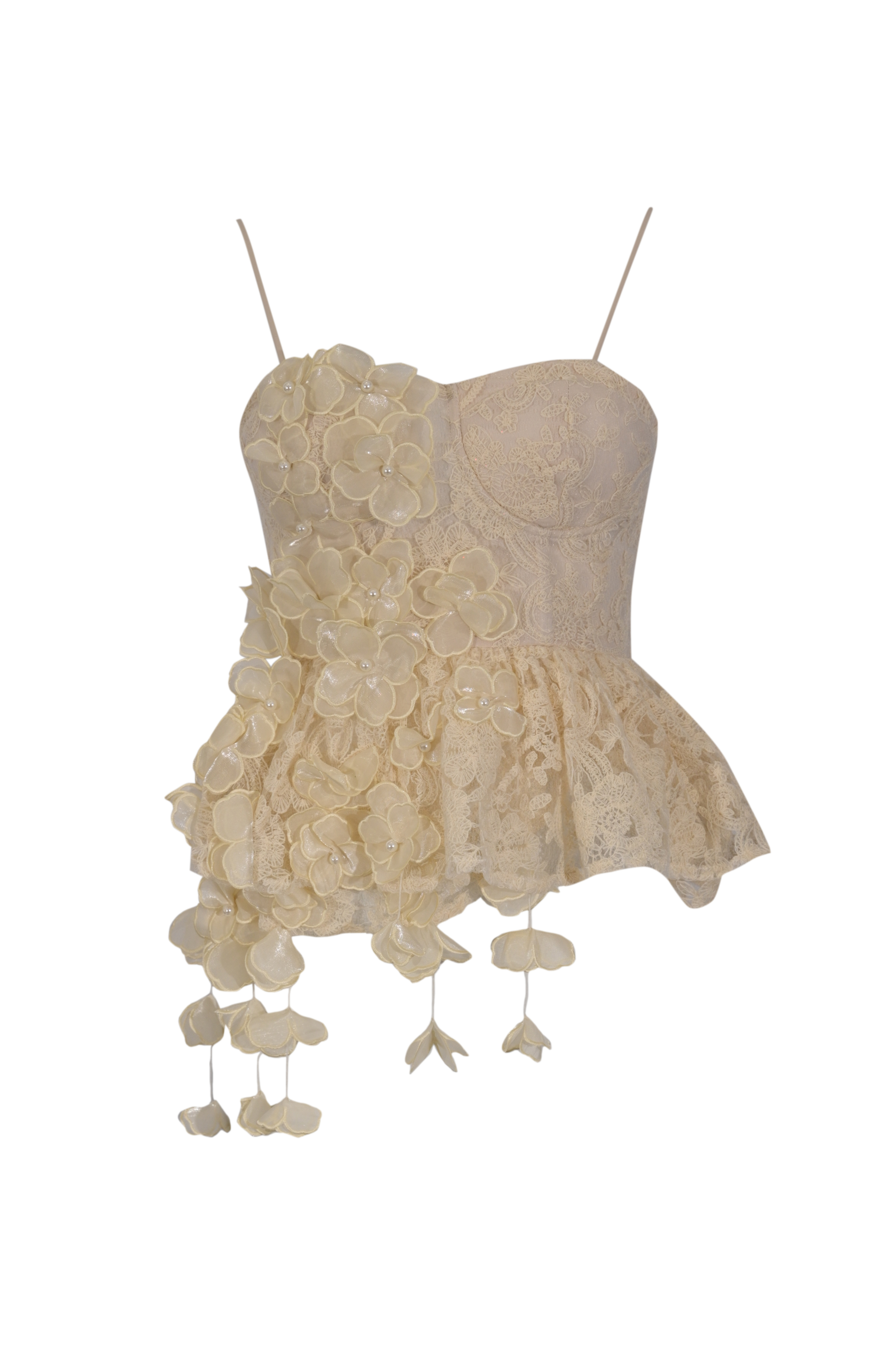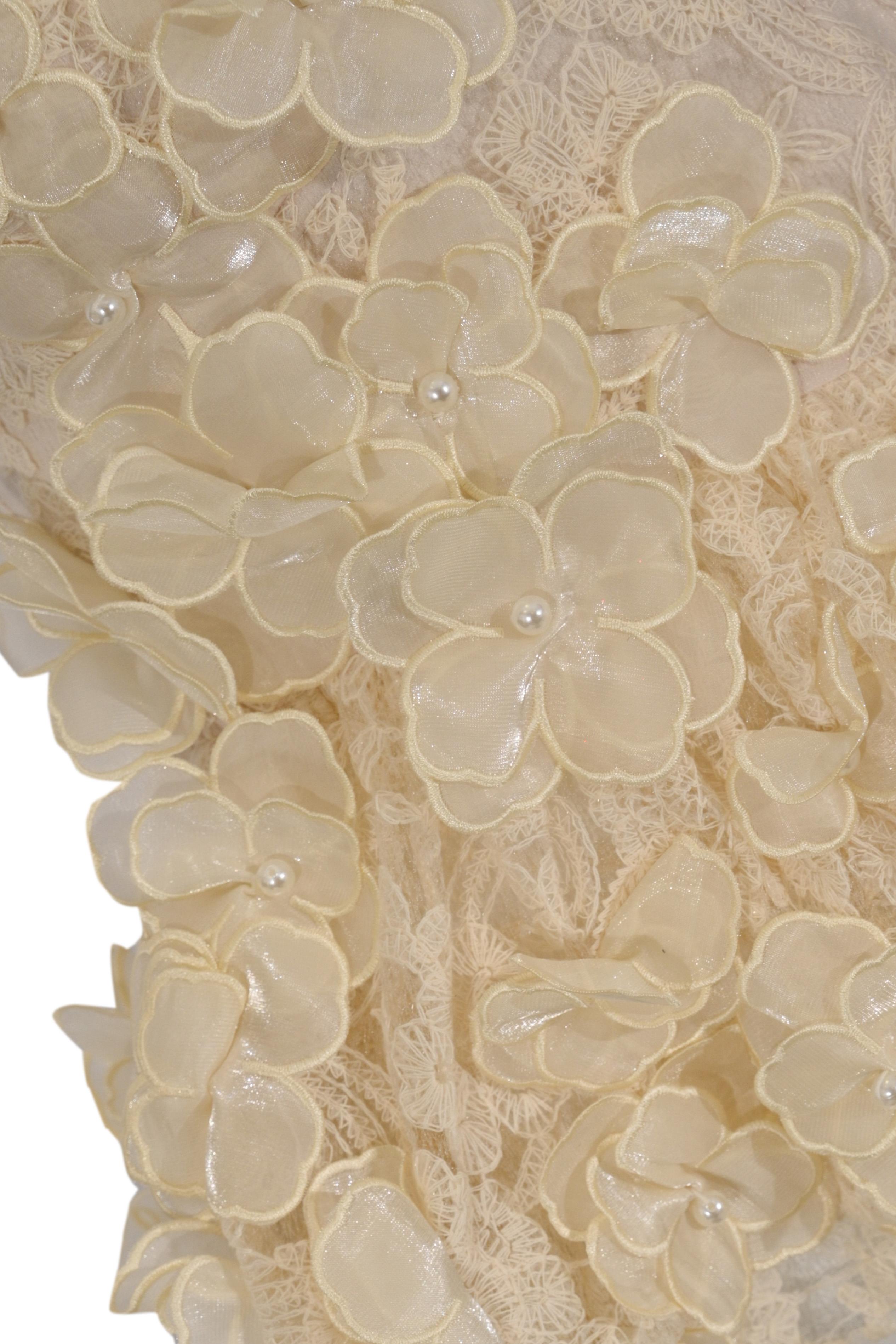 - Dettagli: applicazioni floreali in rilievo con perline, balza in pizzo sul fondo, lavorazione trasparente