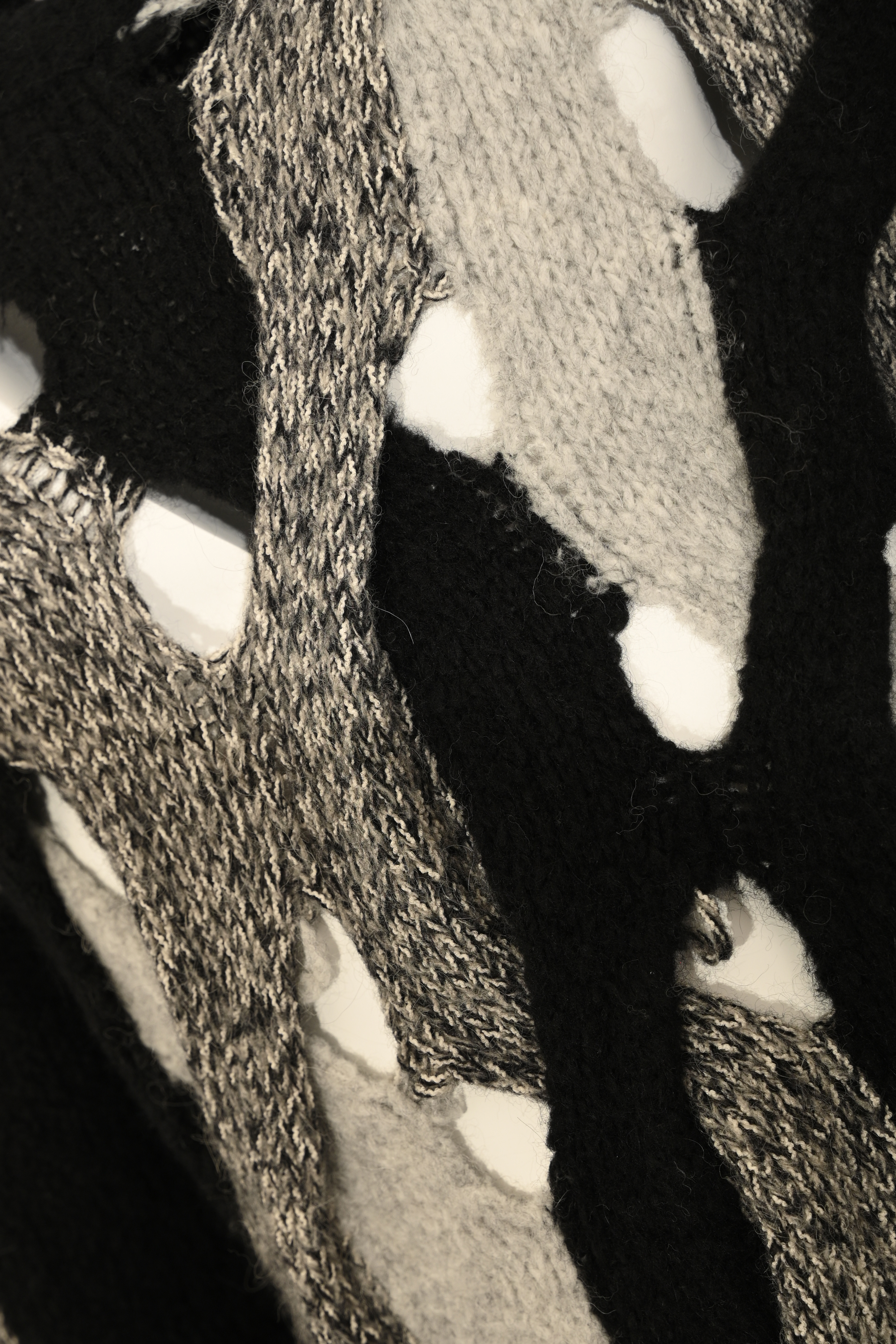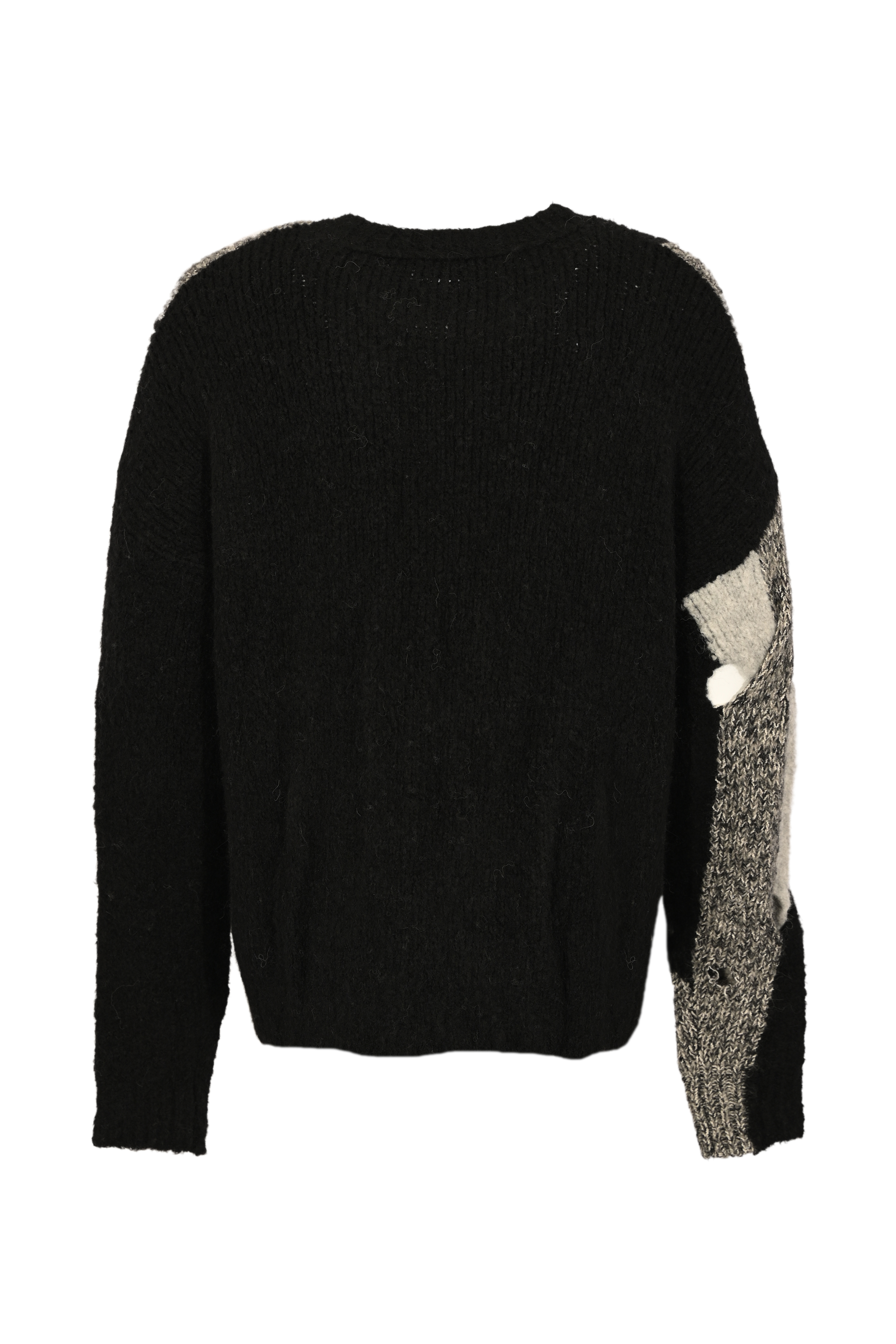 - Dettagli: Maglia con lavorazione a intarsio e trafori, effetto patchwork nei toni contrastanti, finiture a coste su fondo e polsi