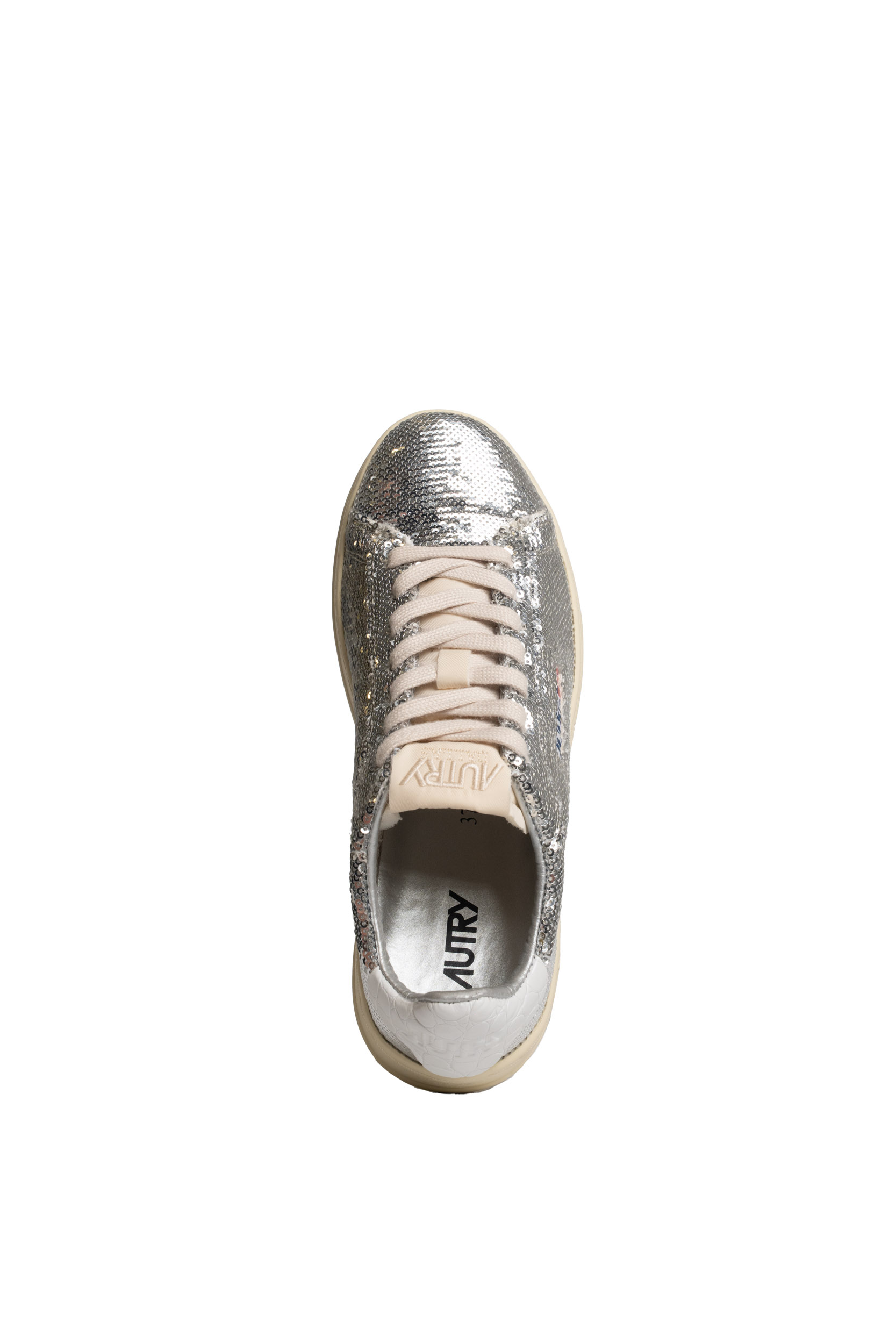 - Tomaia: Rivestita interamente di paillettes riflettenti, con tallone in pelle stampa cocco e logo Autry laterale.