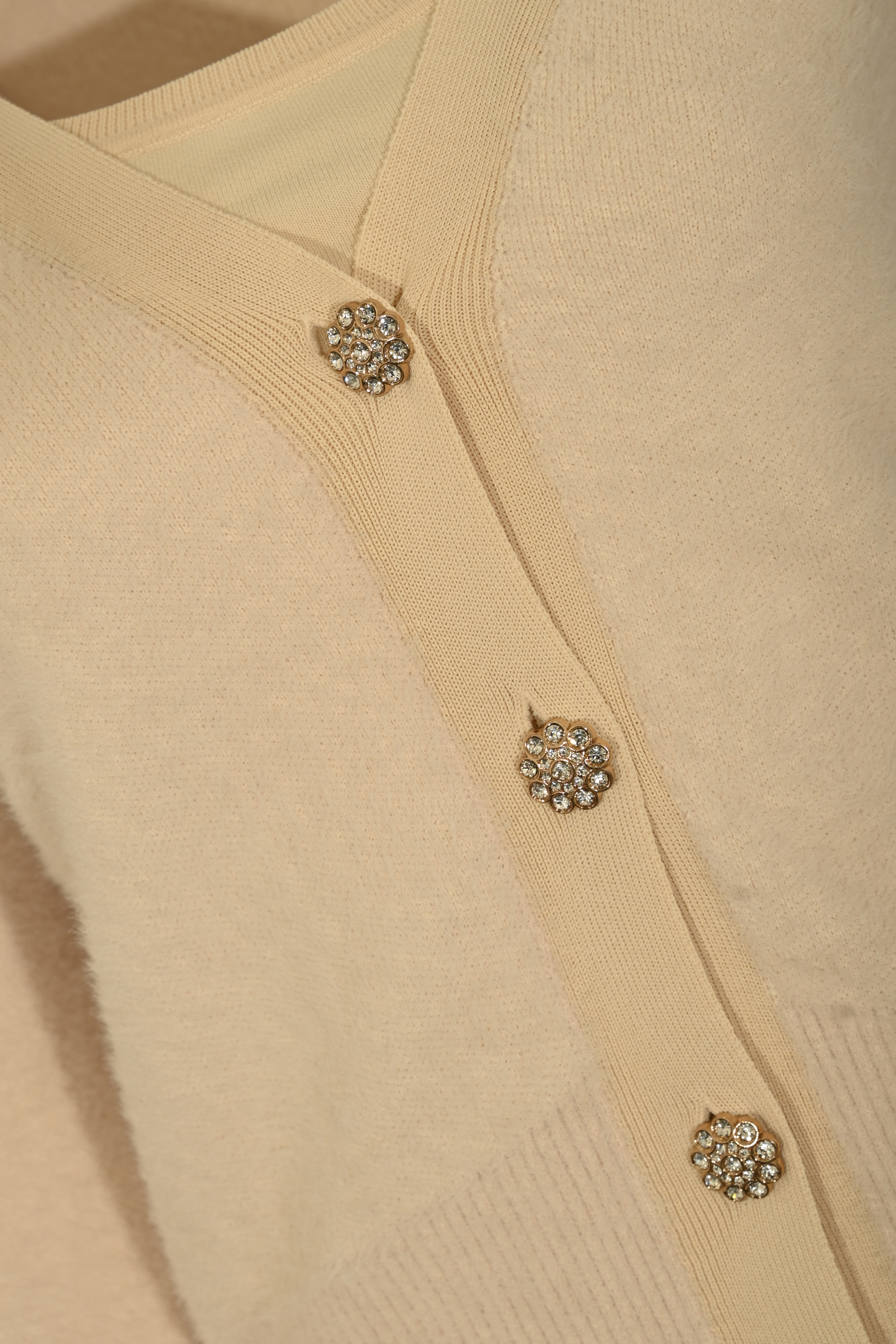 - Dettagli: cardigan corto con finiture a coste, bottoni dorati con cristalli, top sottostante coordinato tono su tono