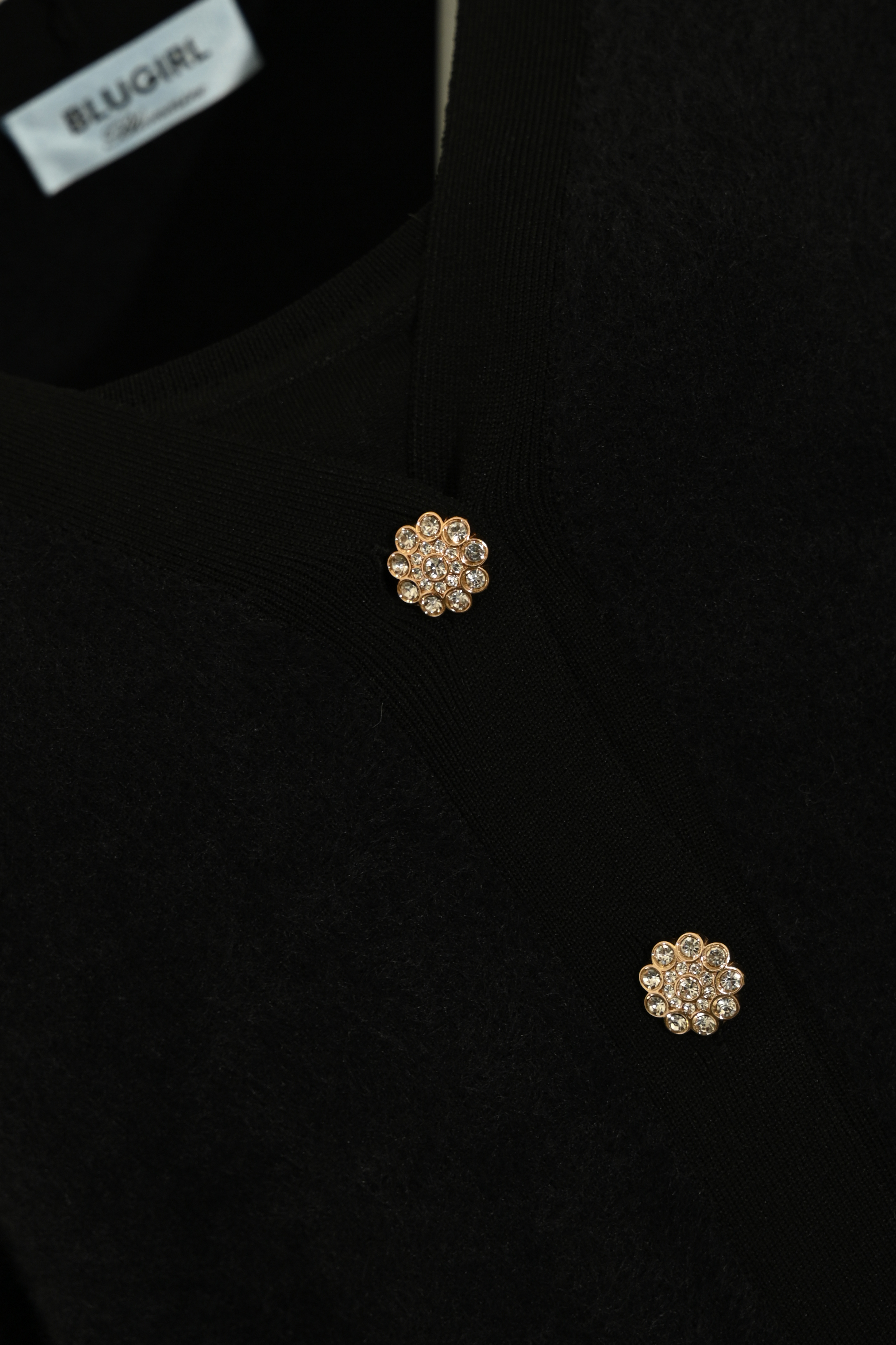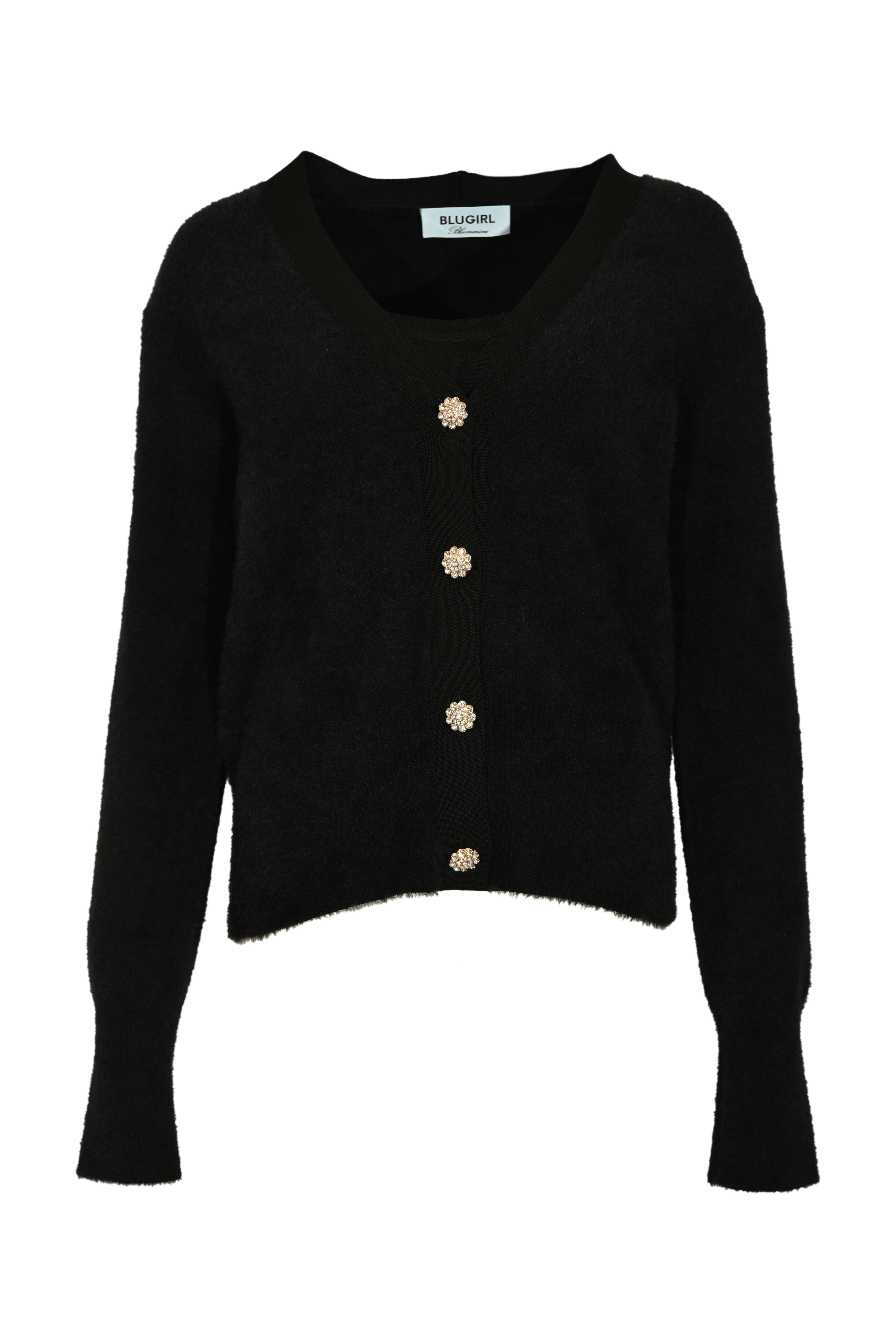 - Dettagli: cardigan corto con finiture a coste, bottoni dorati con cristalli, top sottostante coordinato tono su tono