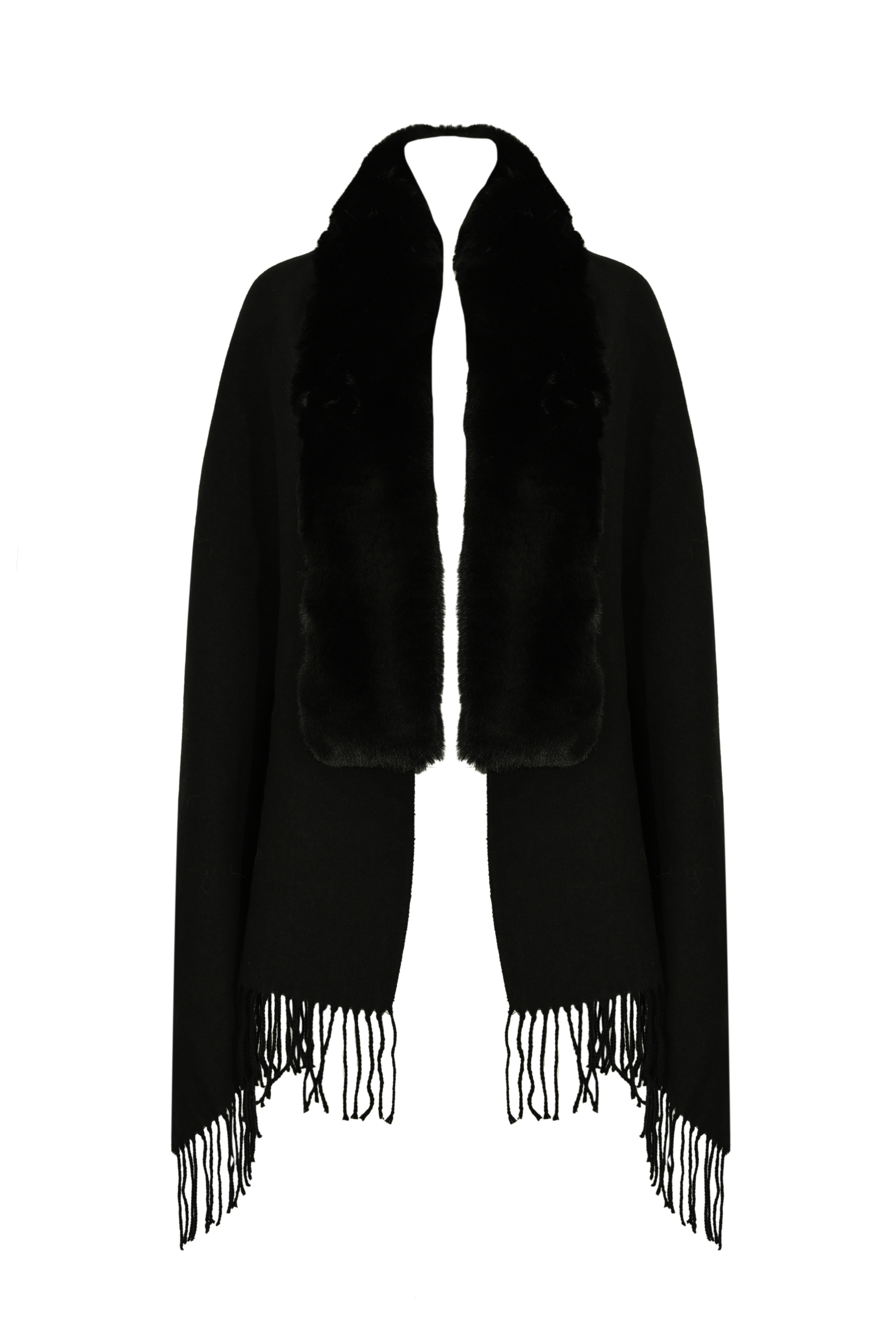 - Dettagli: frange sul fondo, collo effetto pelliccia a contrasto, taglio morbido e drappeggiato