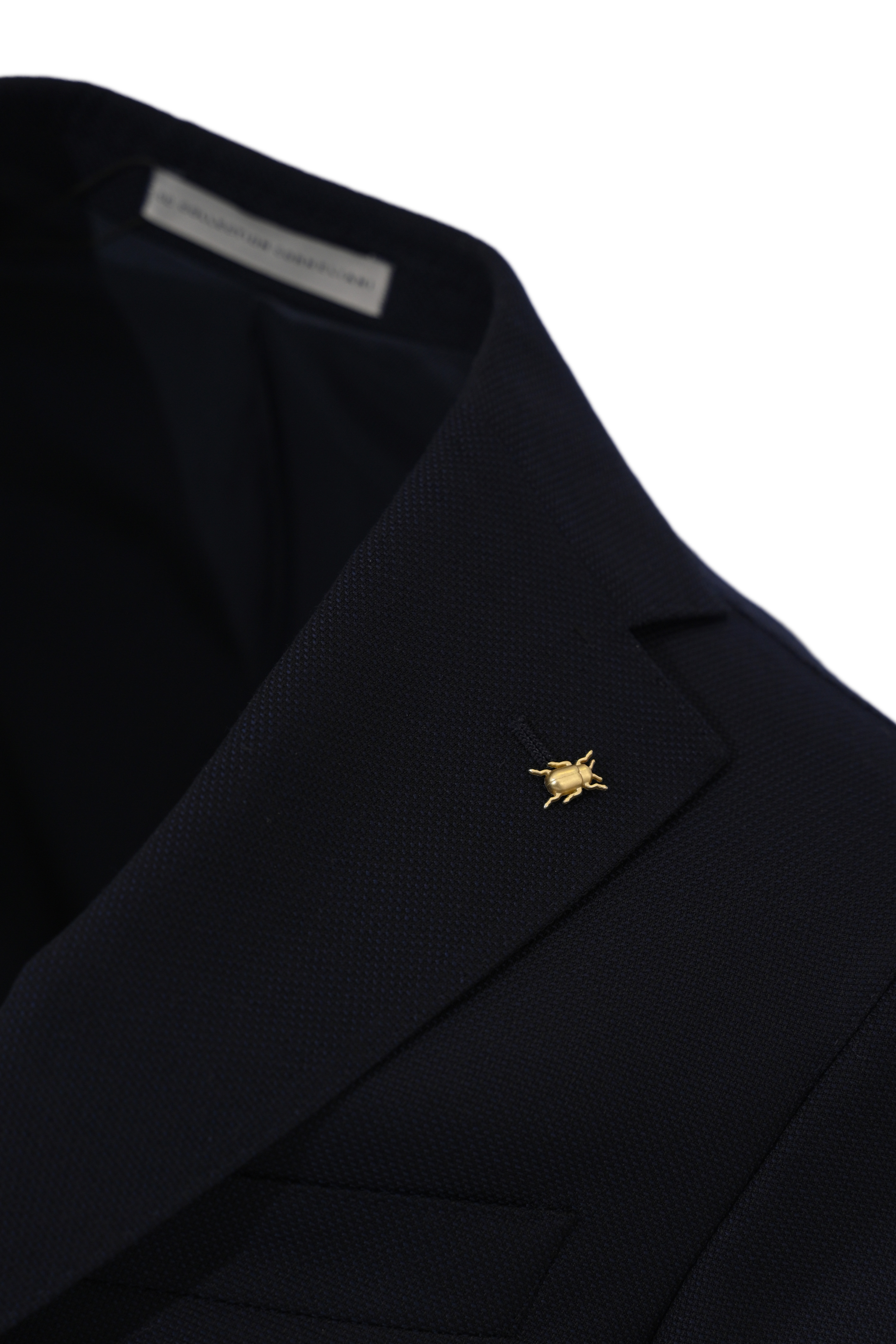 - Dettagli: Spilla iconica applicata al rever, spacchi laterali posteriori