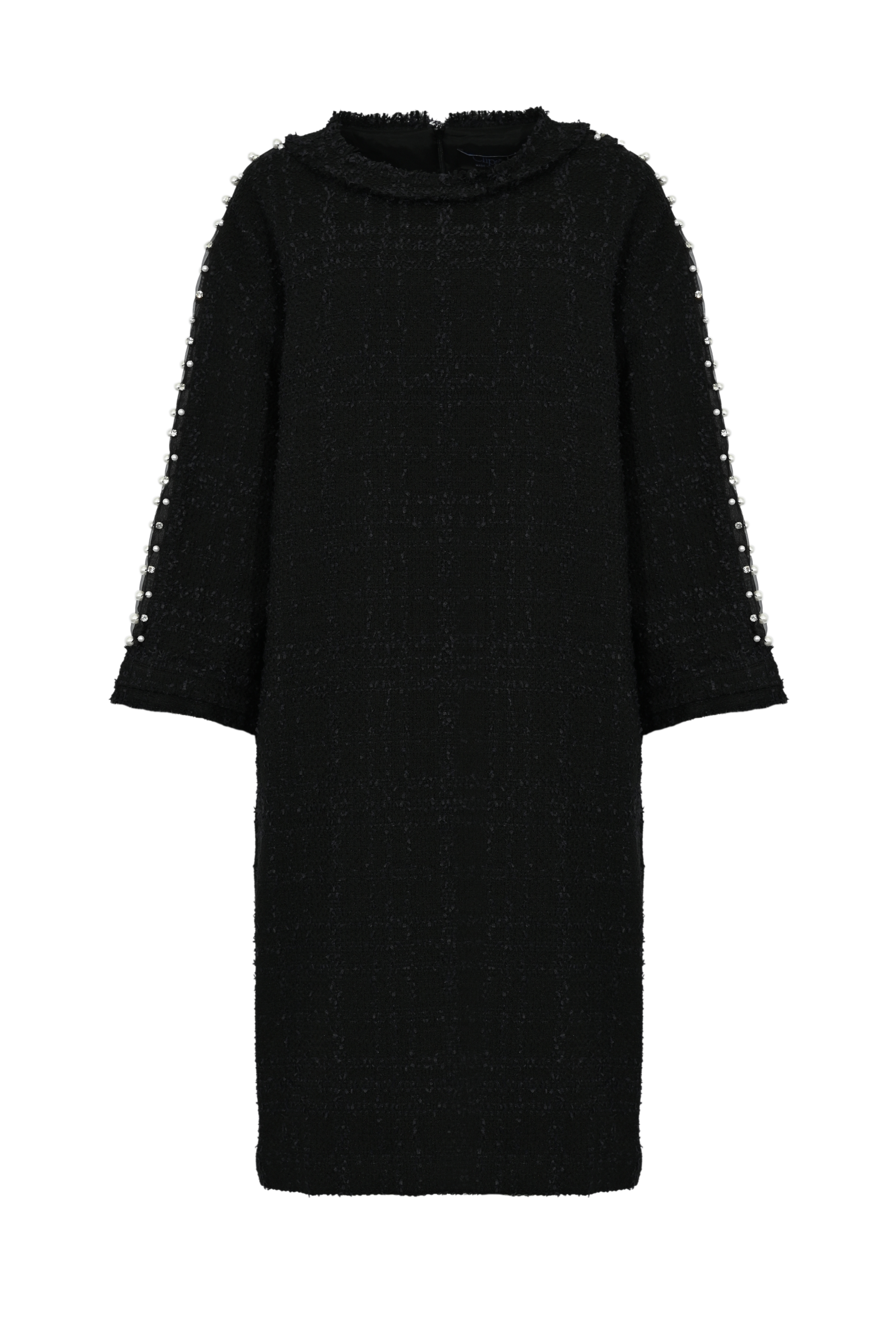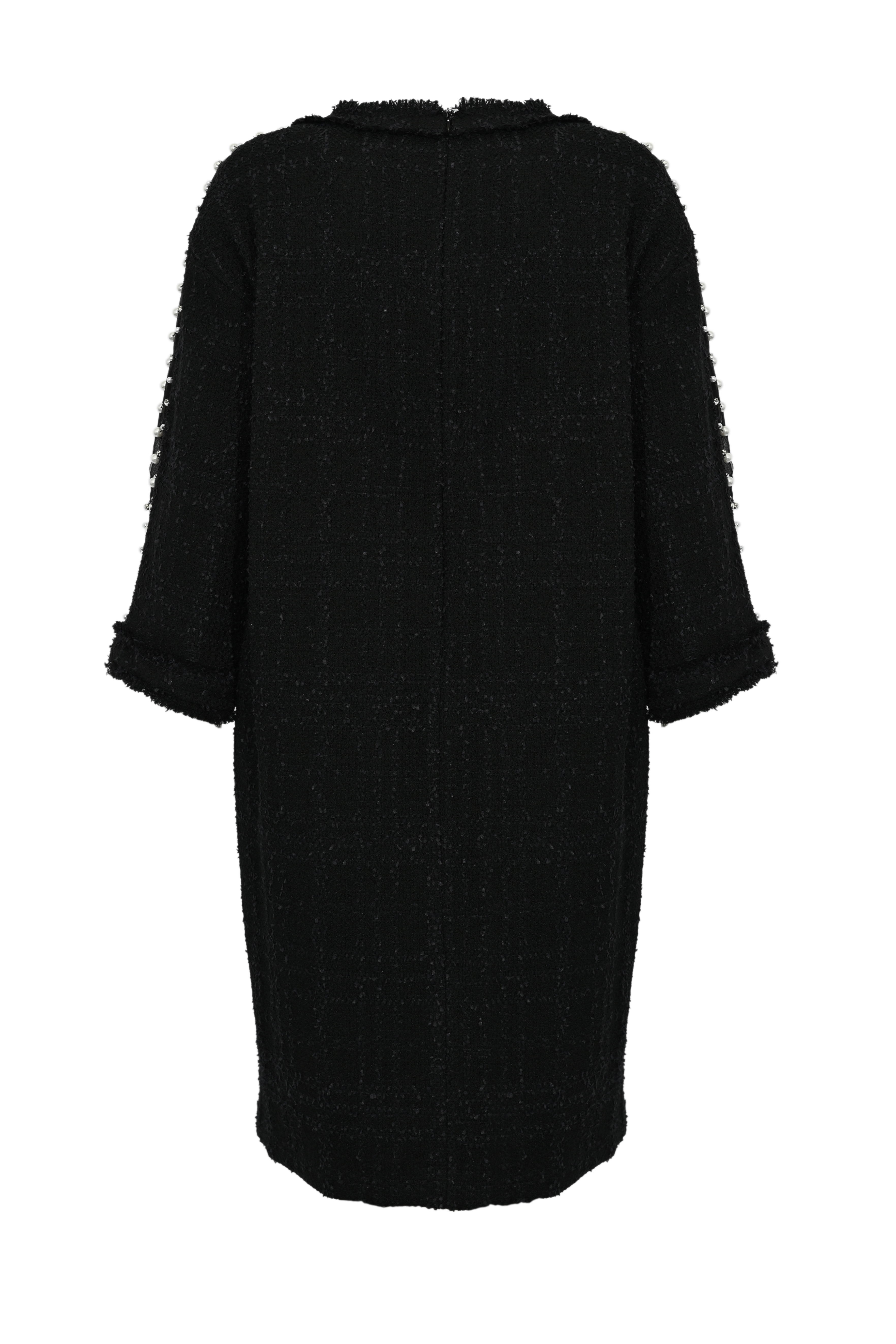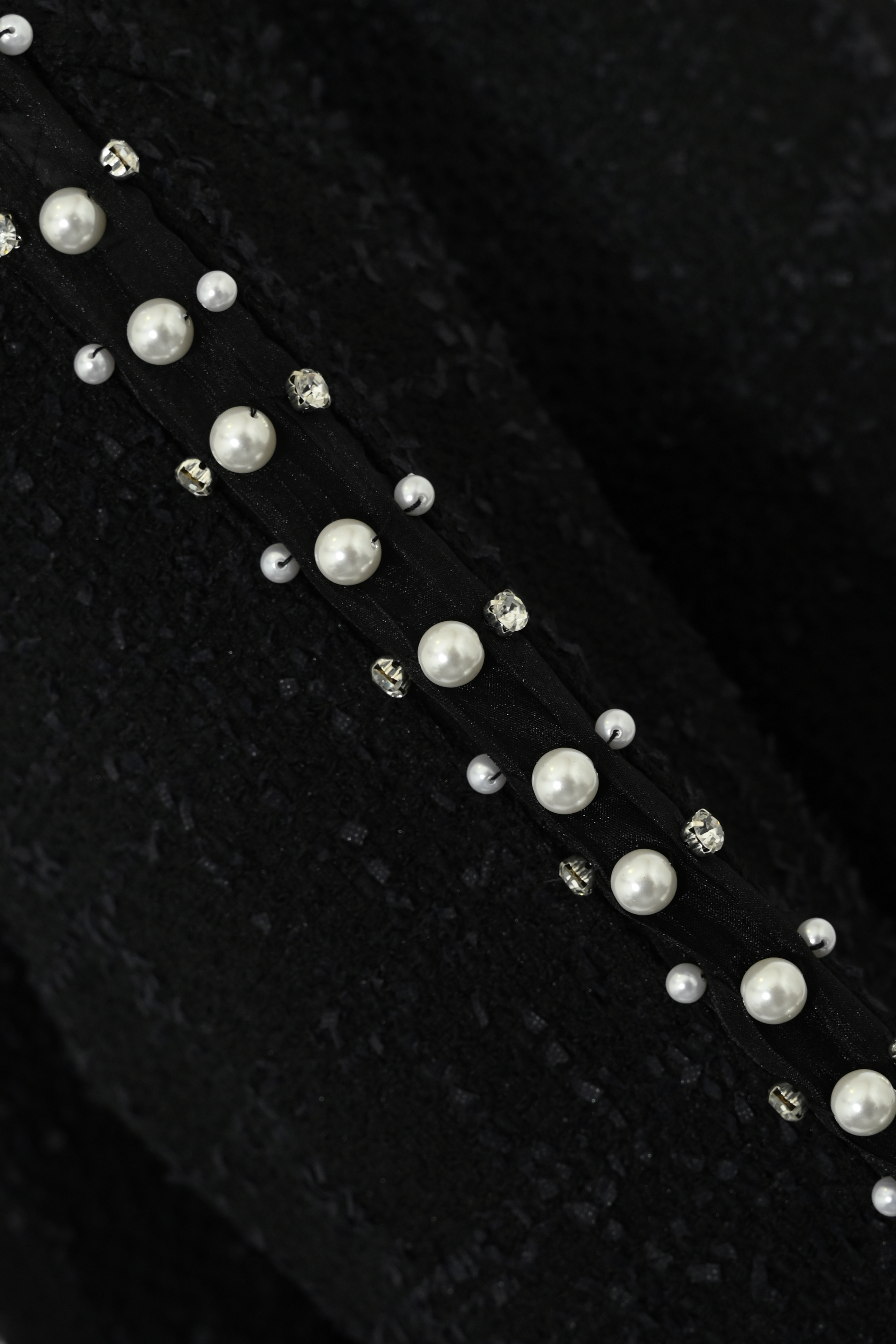 - Dettagli: applicazioni di perle e cristalli sulle maniche, finiture sfrangiate, texture effetto Chanel