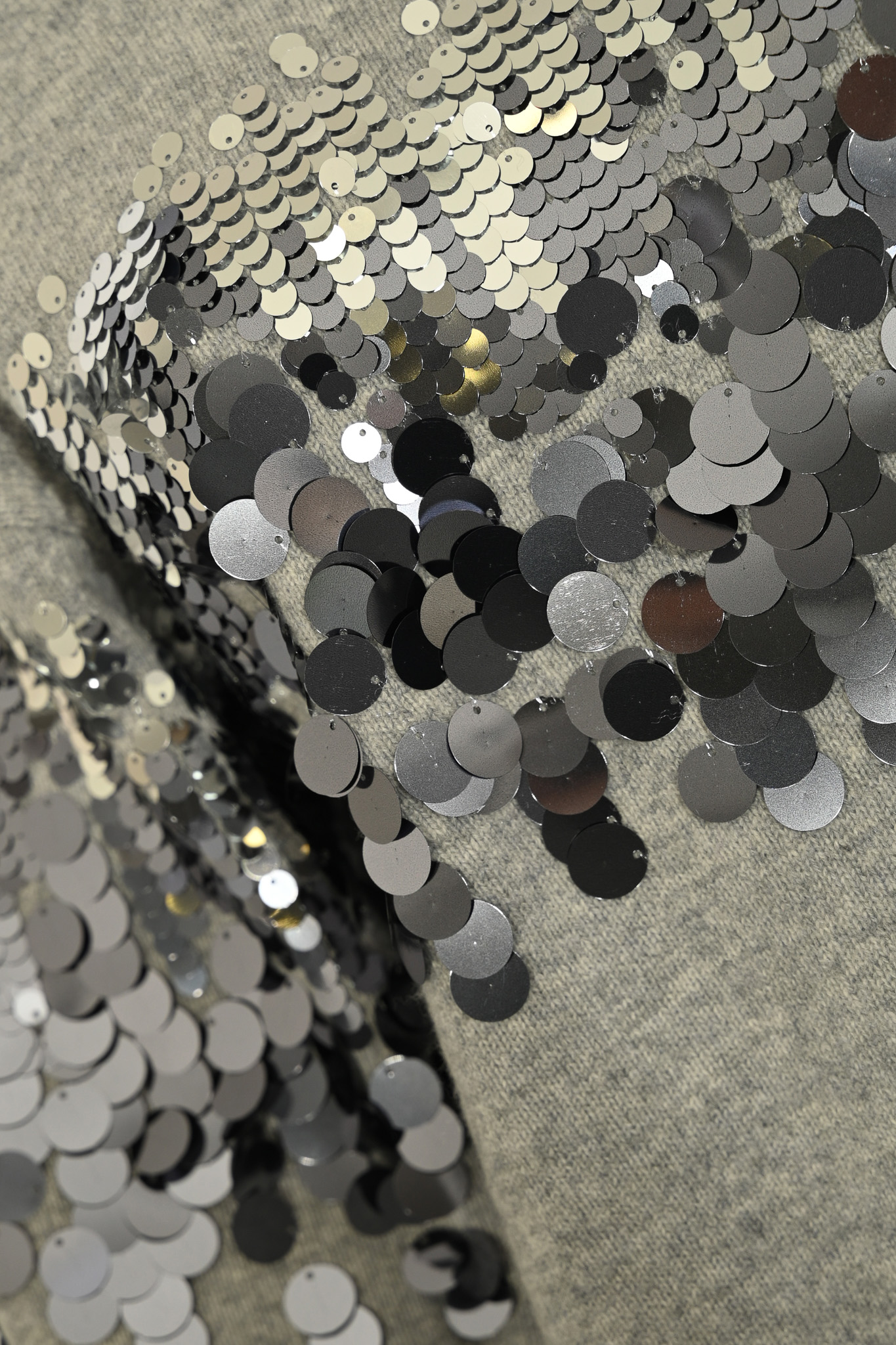 - Dettagli: decorazioni di grandi paillettes tonde nei toni dellargento e del grigio su parte anteriore e maniche, fondo e polsini a costine