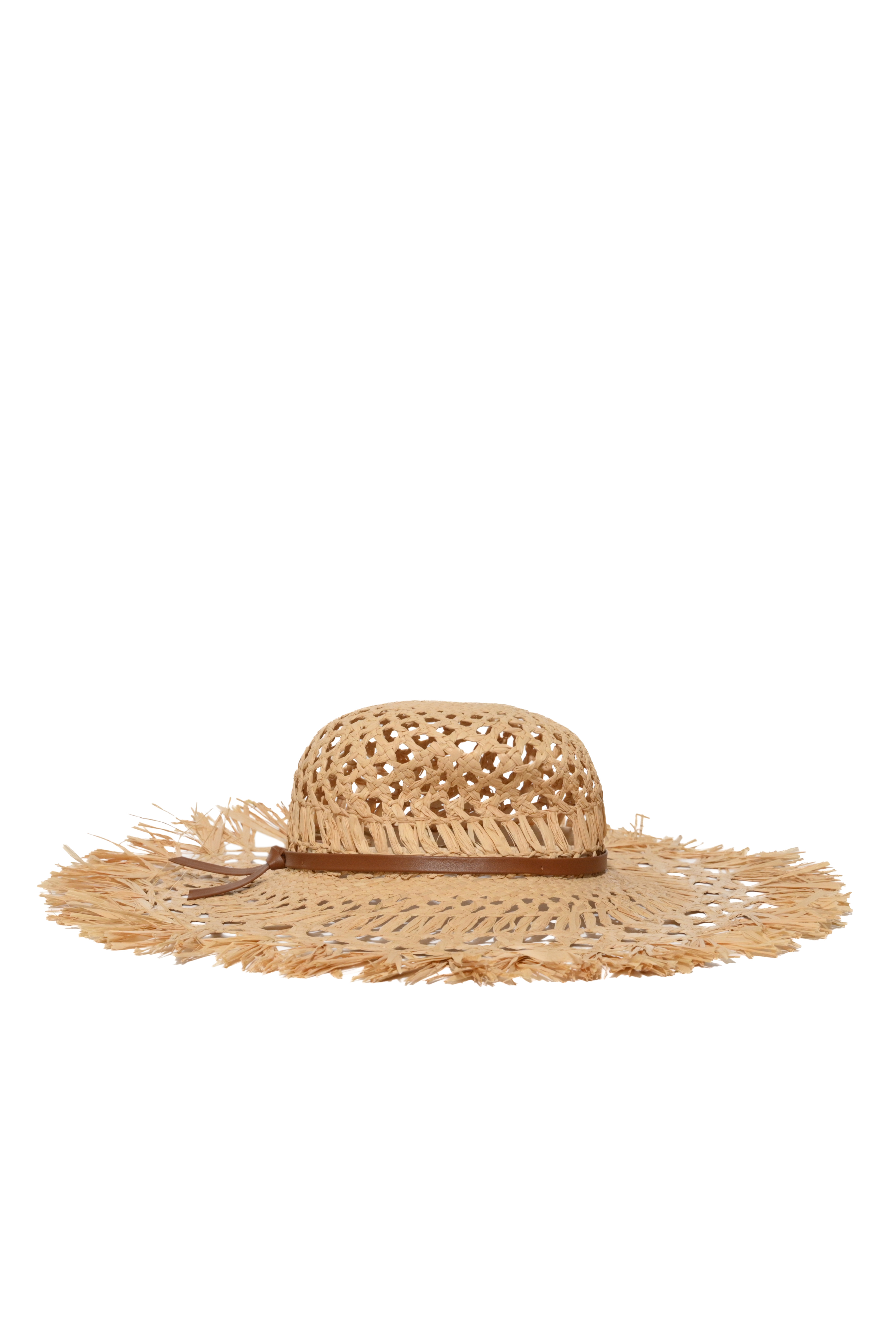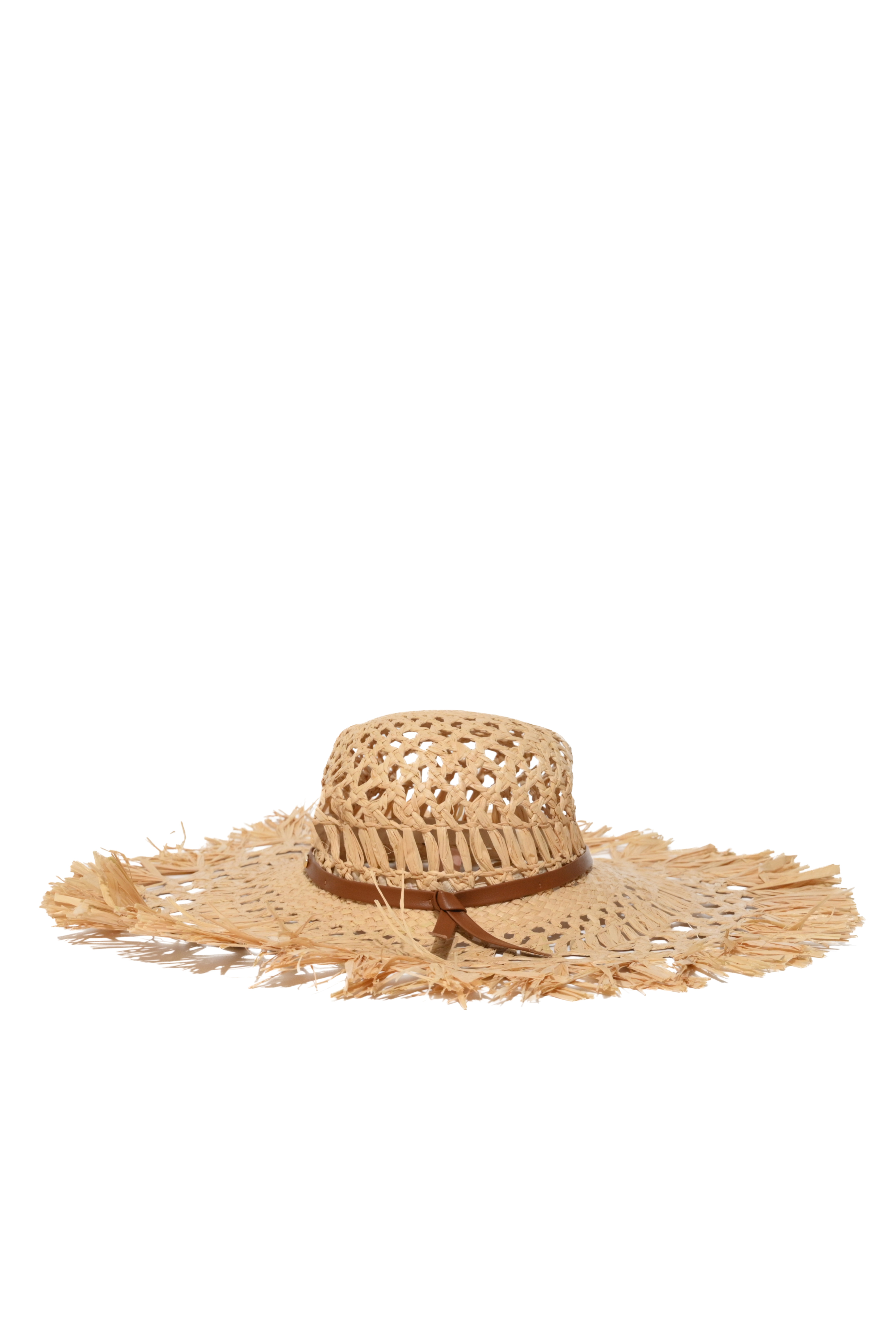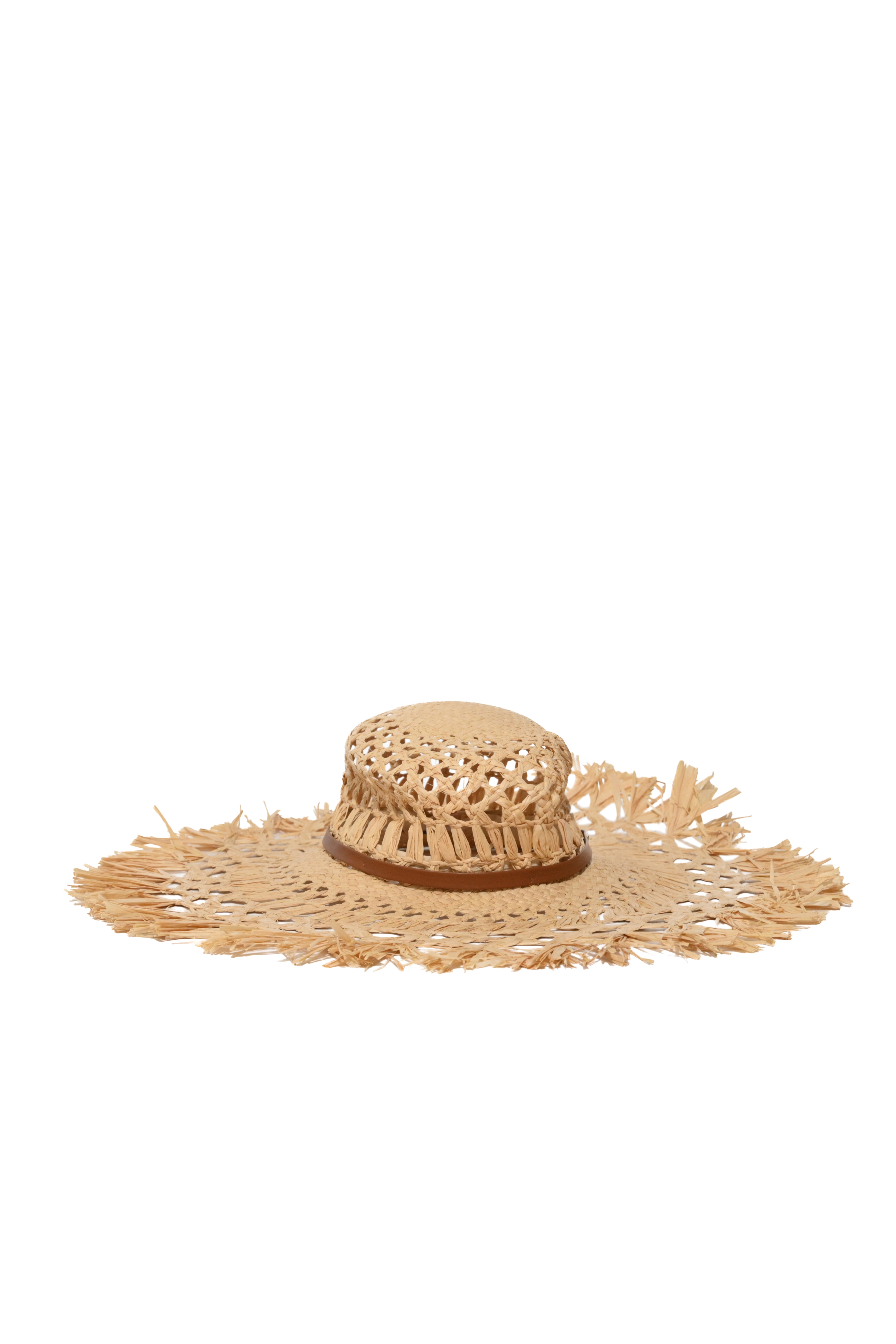 - Dettagli: lavorazione intrecciata traforata, tesa ampia con bordi sfrangiati, fascia decorativa effetto pelle con laccetto