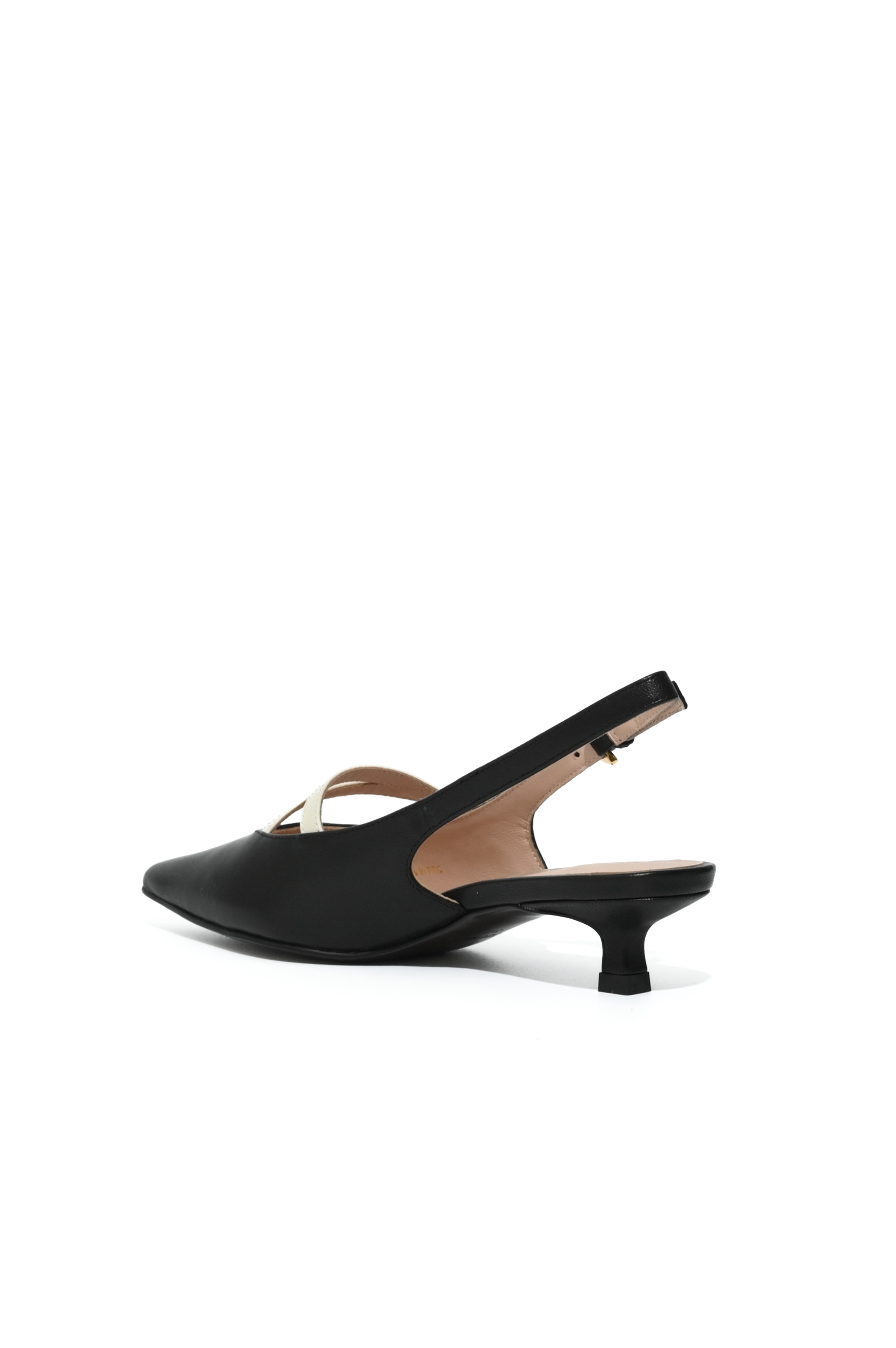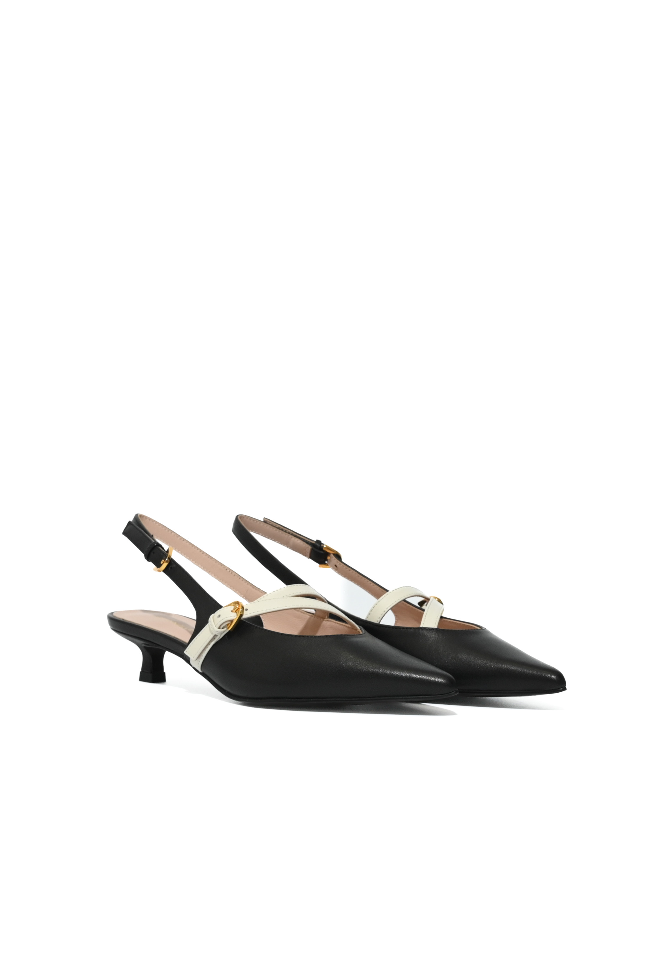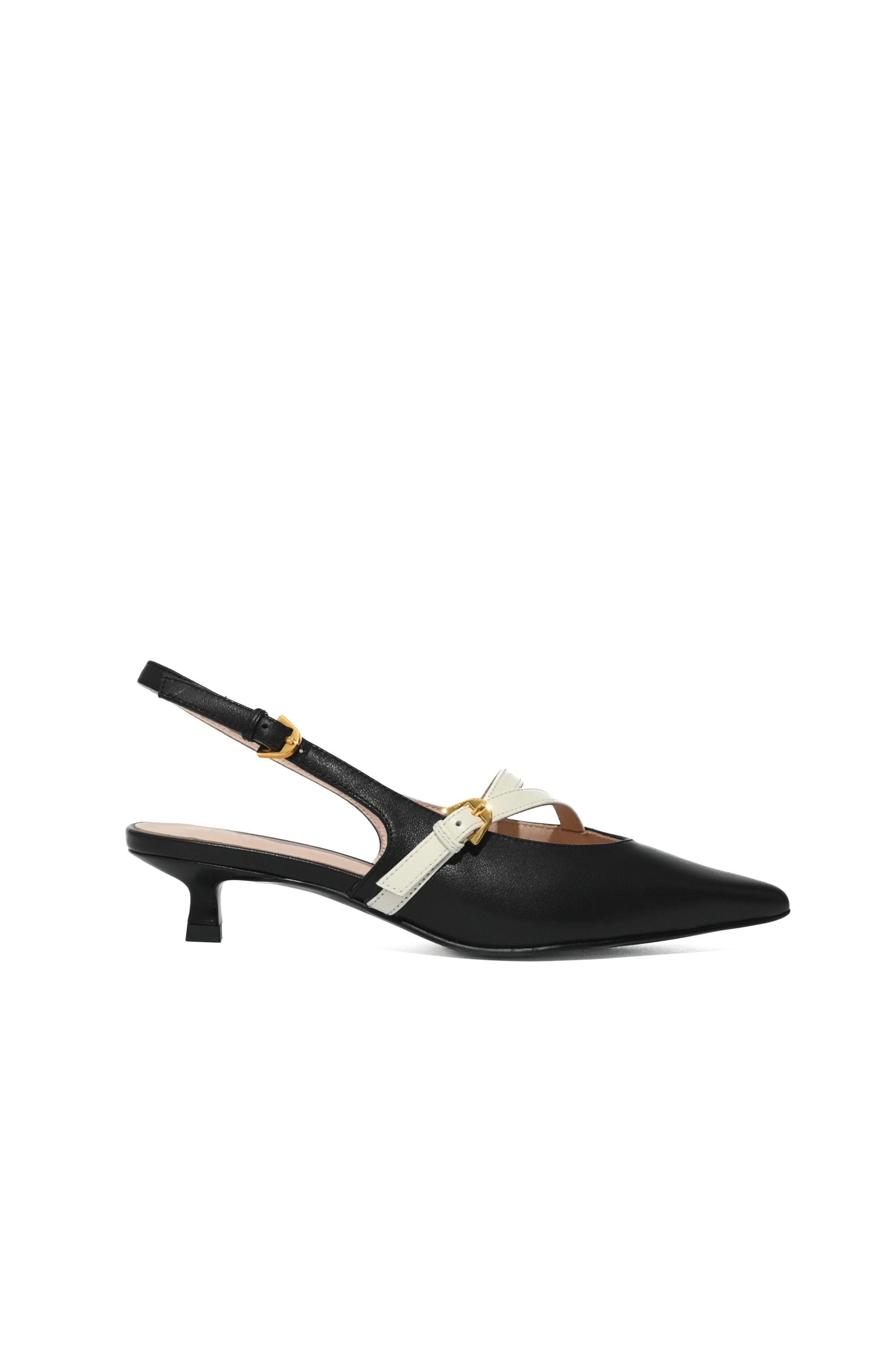 - Dettagli: design a punta con cinturino frontale incrociato a contrasto e fibbia metallica dorata