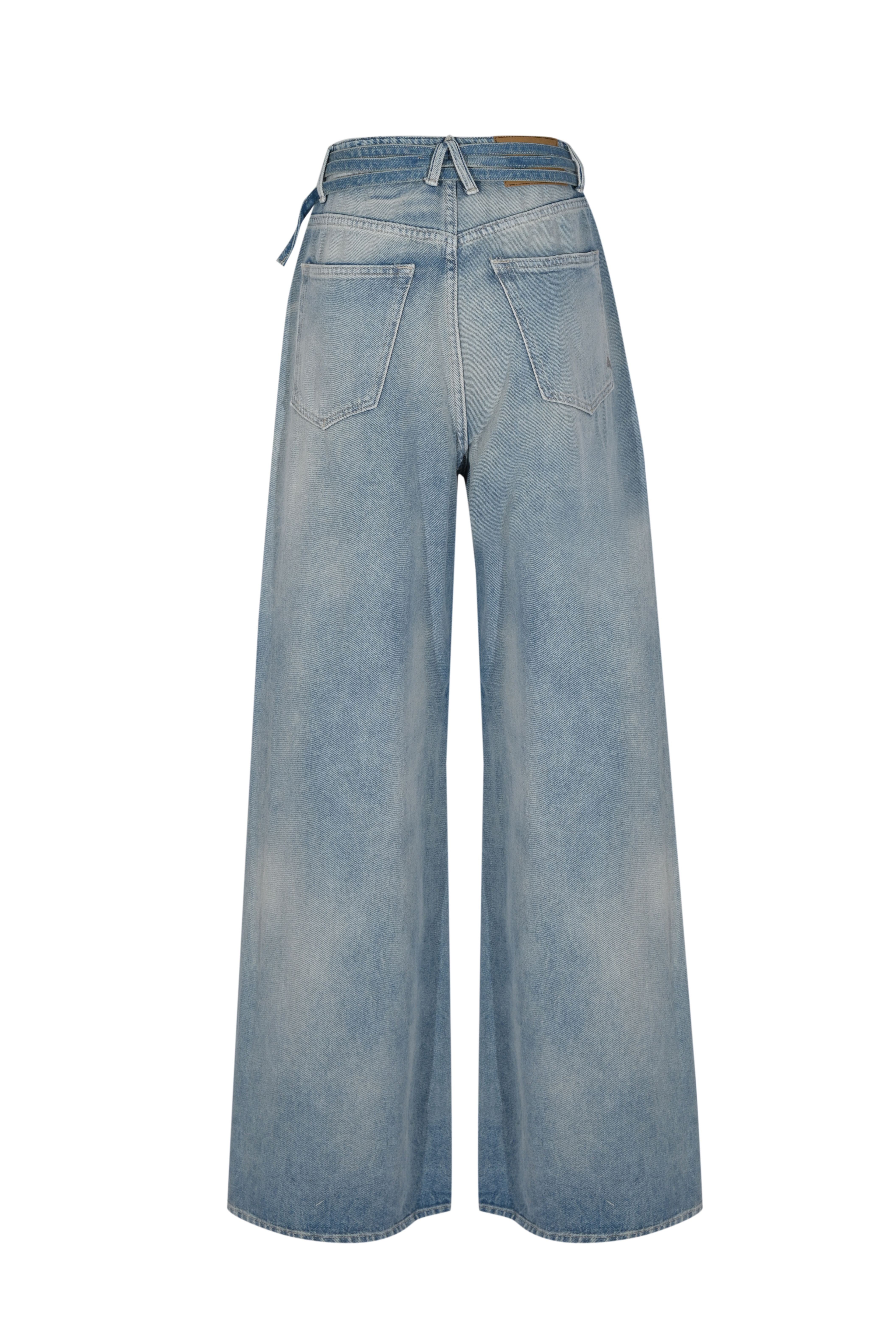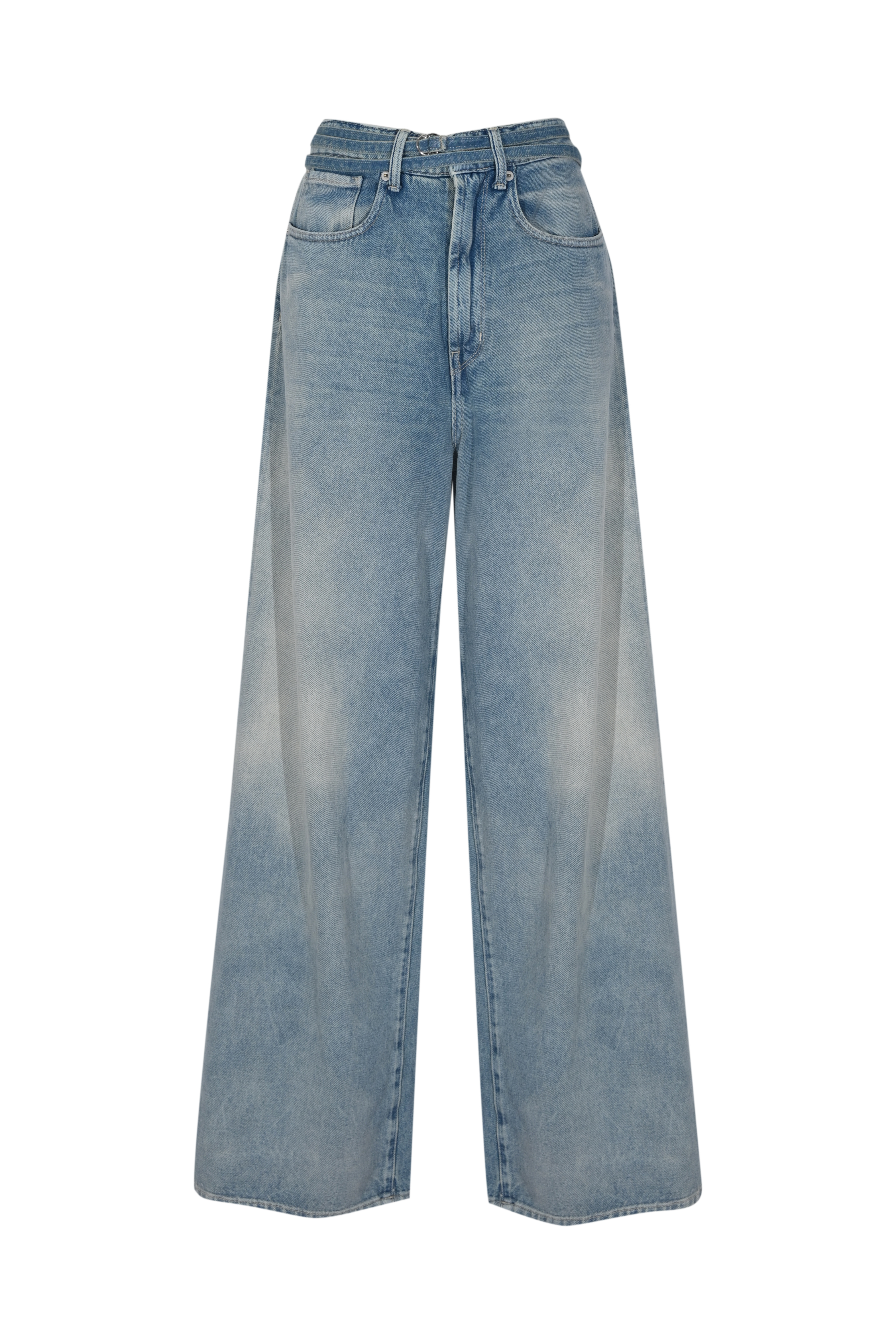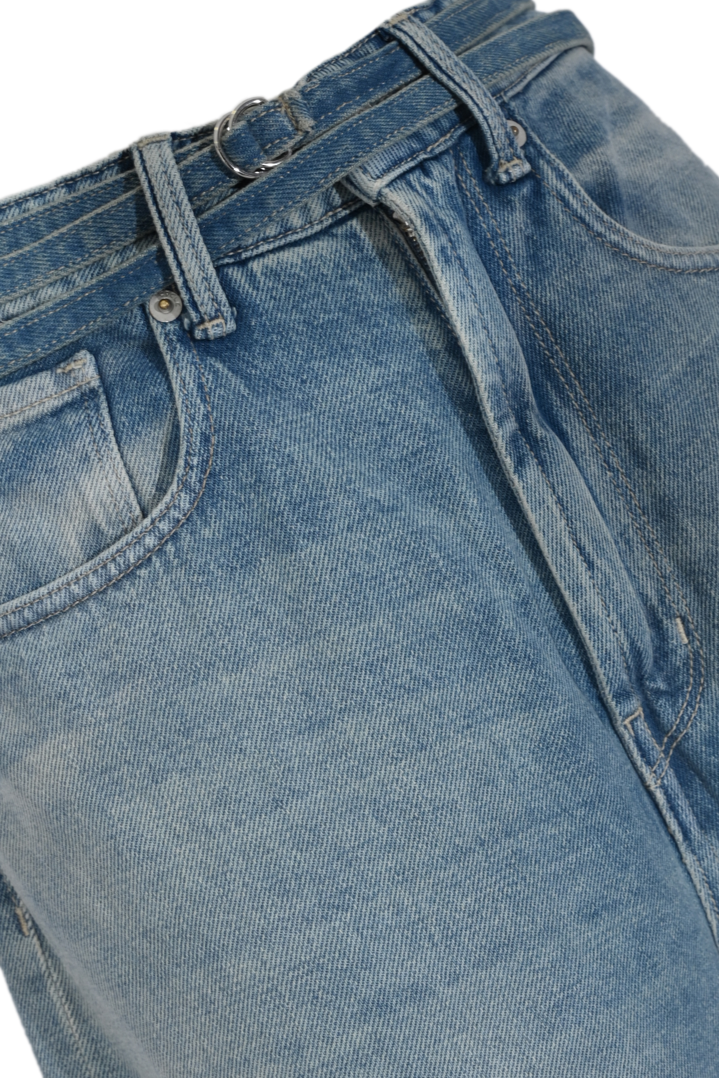 - Dettagli: lavaggio chiaro, cintura abbinata con anelli metallici, cuciture a contrasto