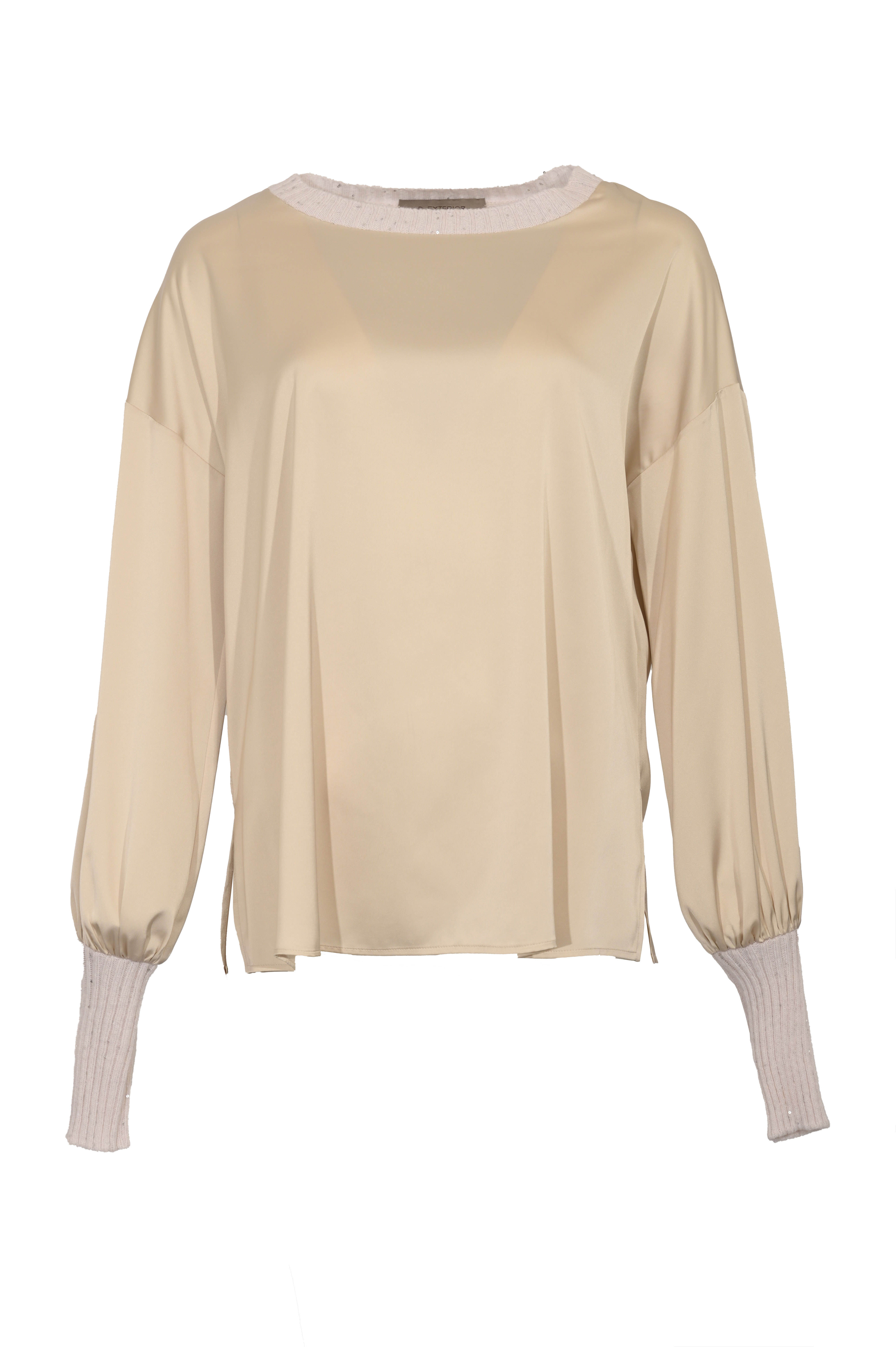 - Dettagli: linea morbida e fluida, spalle scese, polsini elasticizzati con effetto lucente, spacchi laterali al fondo, tessuto satinato dal finish luminoso