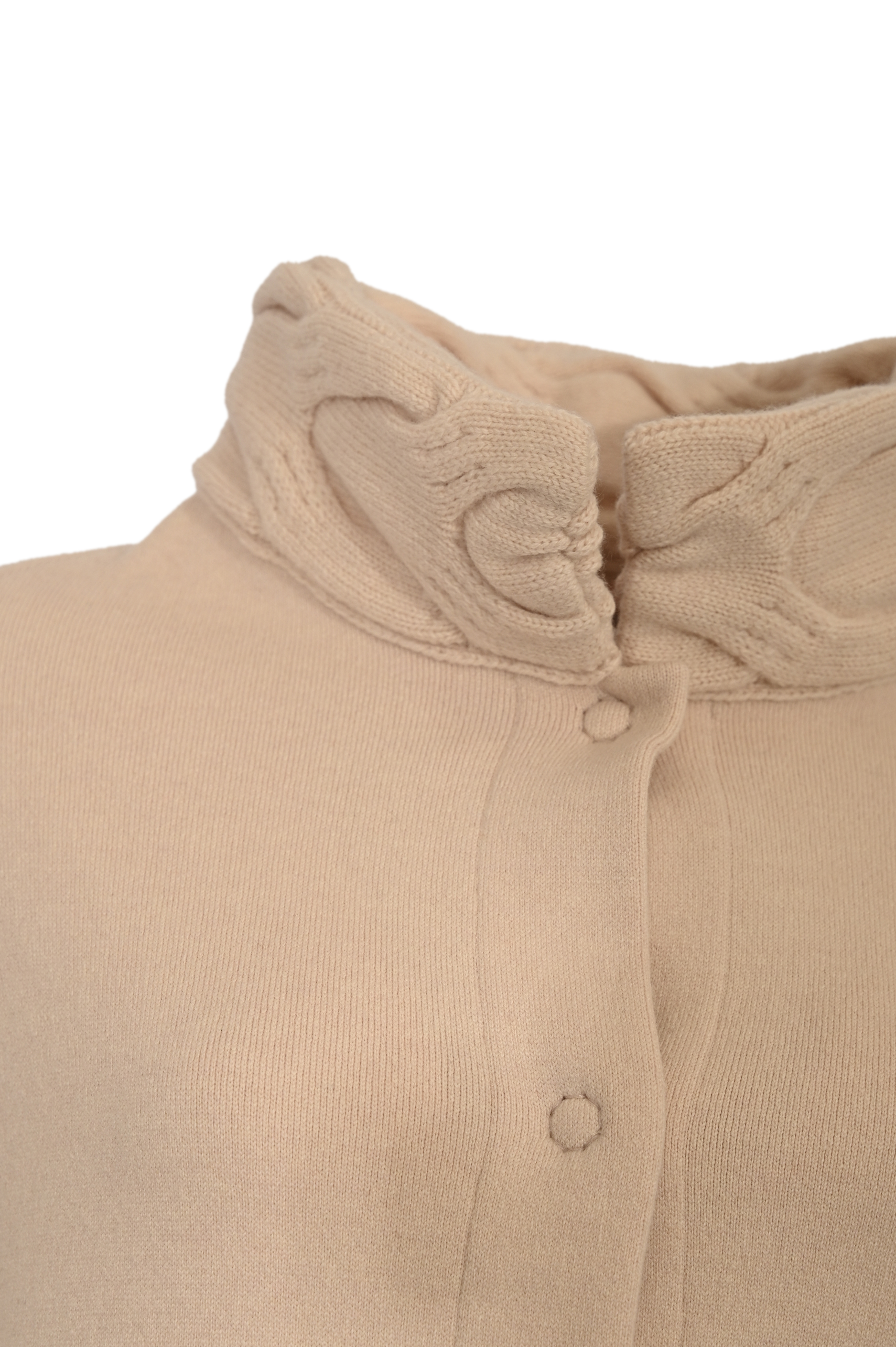 - Dettagli: Lavorazione a maglia liscia, collo e polsini con intrecci decorativi, taglio morbido e avvolgente