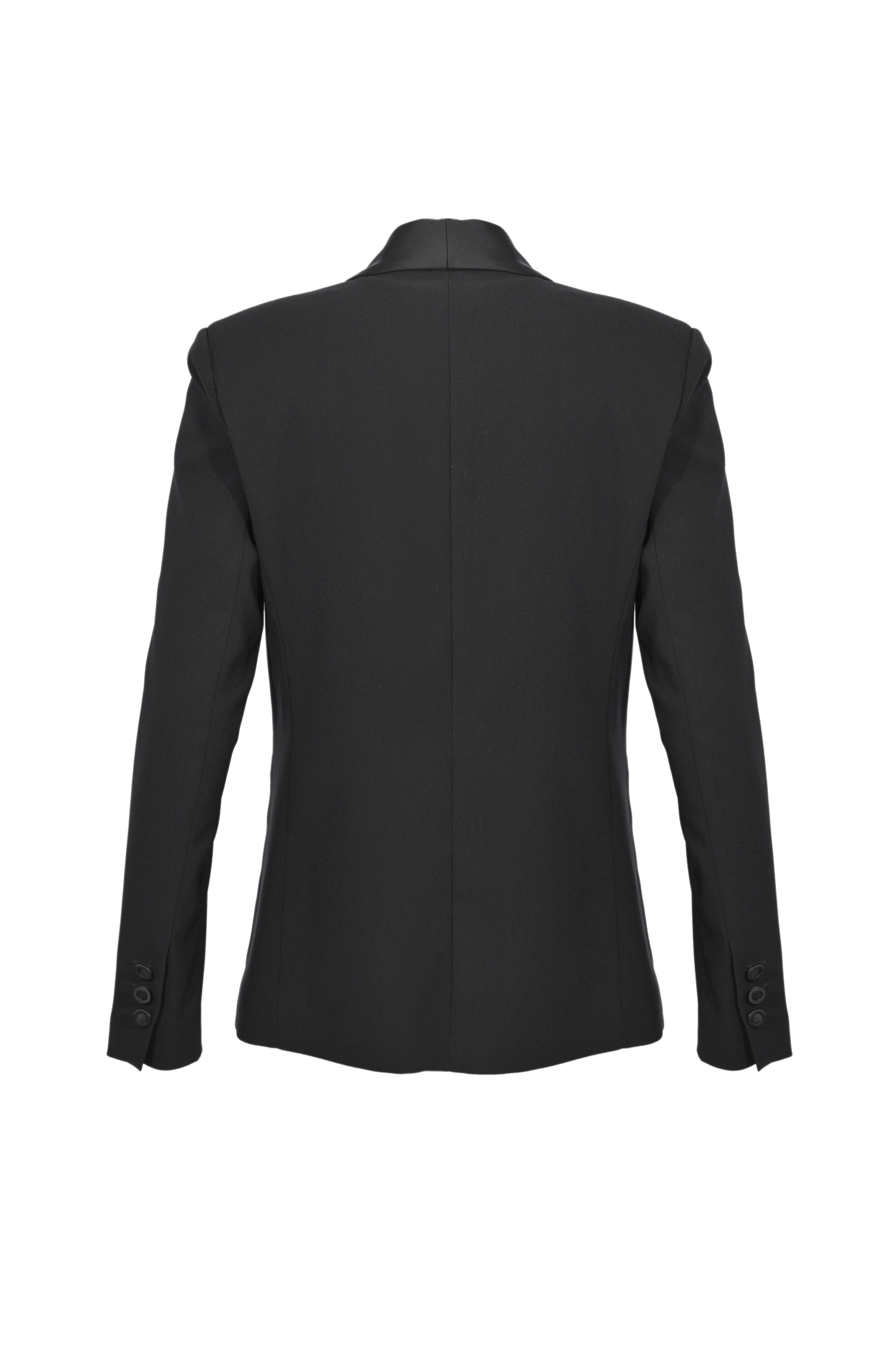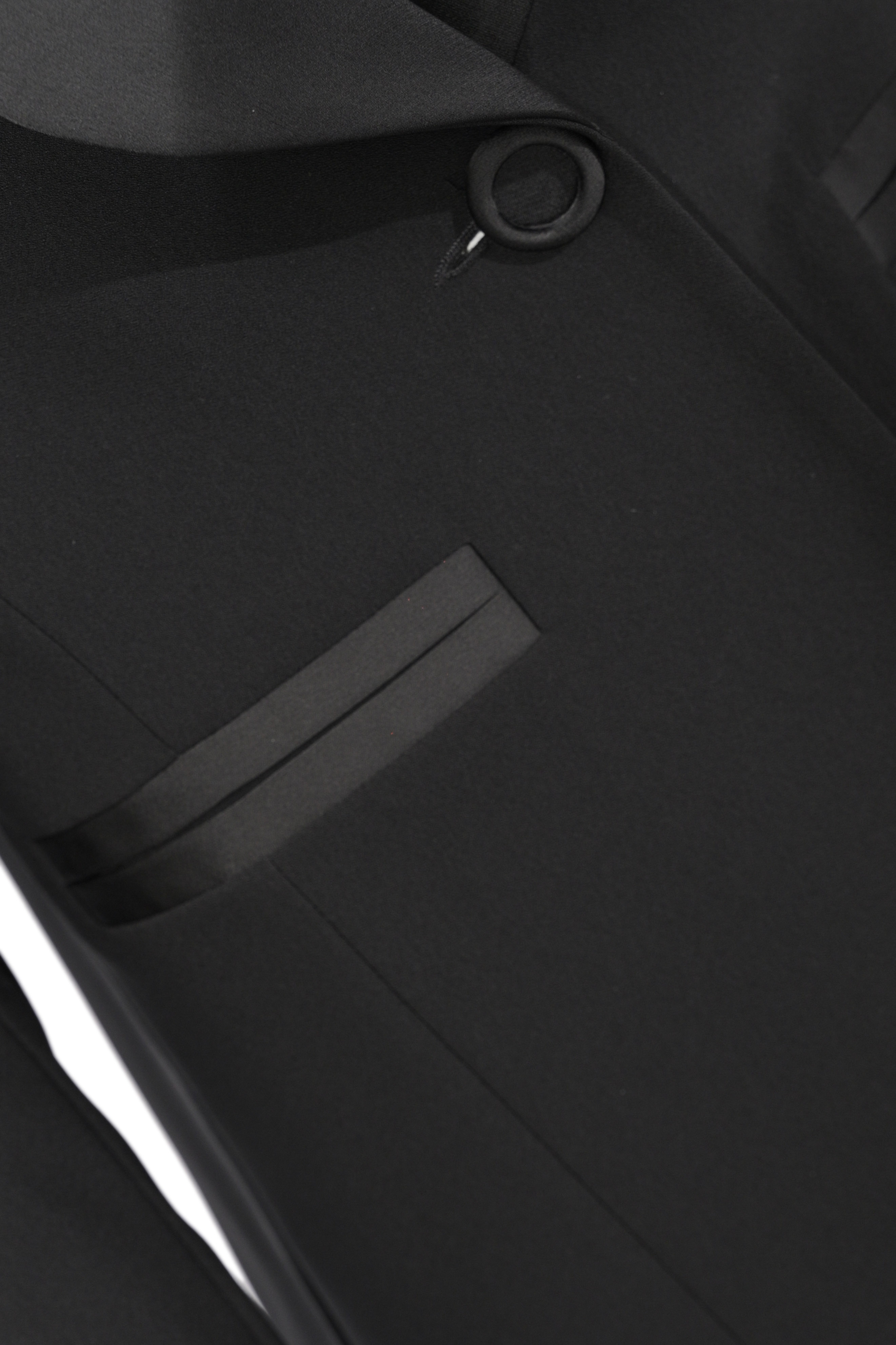 - Dettagli: inserti in raso su rever e profili tasche, linea sartoriale