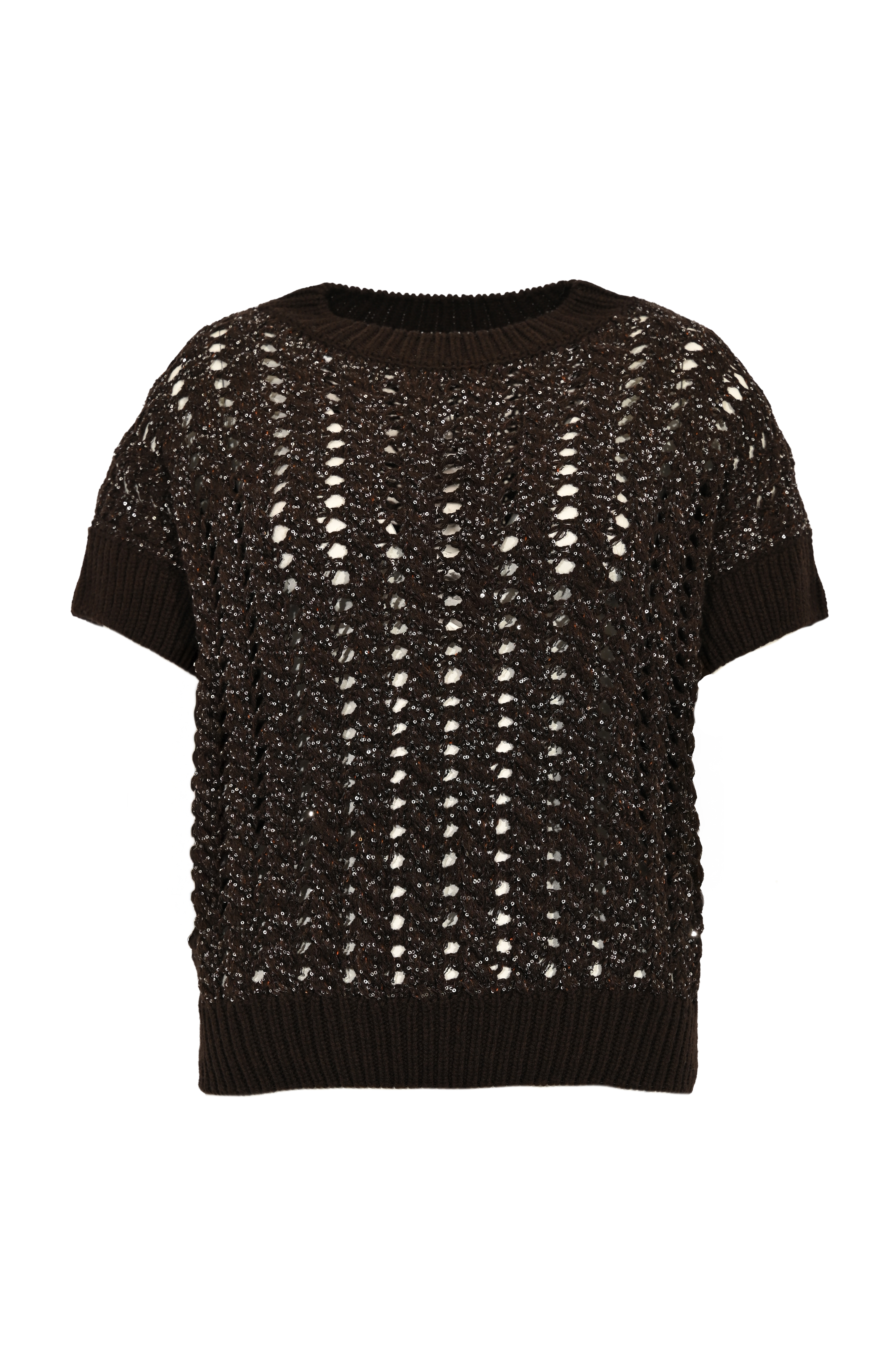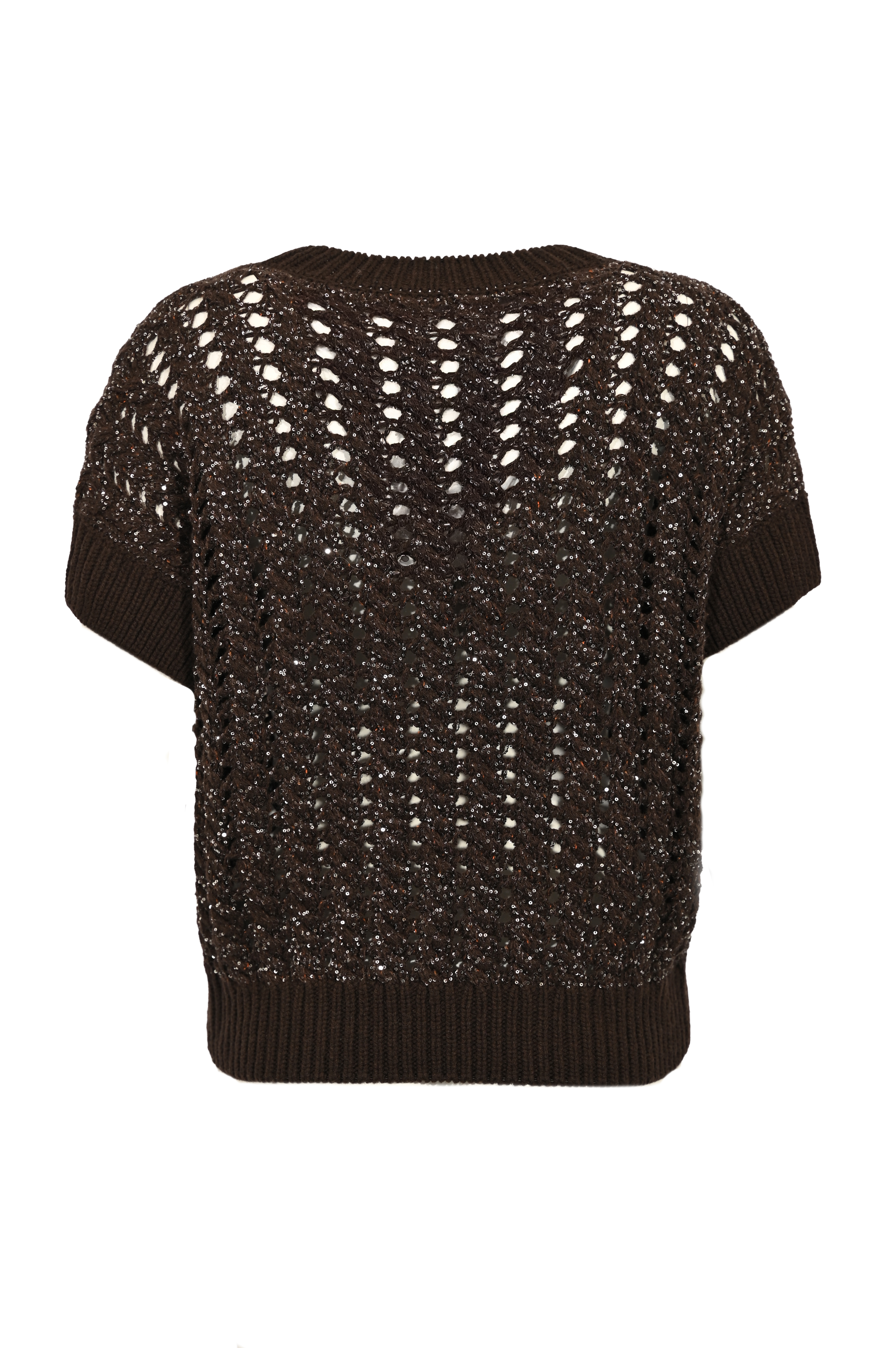 - Dettagli: lavorazione traforata con inserto di micro paillettes tono su tono, bordi a costine su fondo, maniche e collo, texture morbida e luminosa