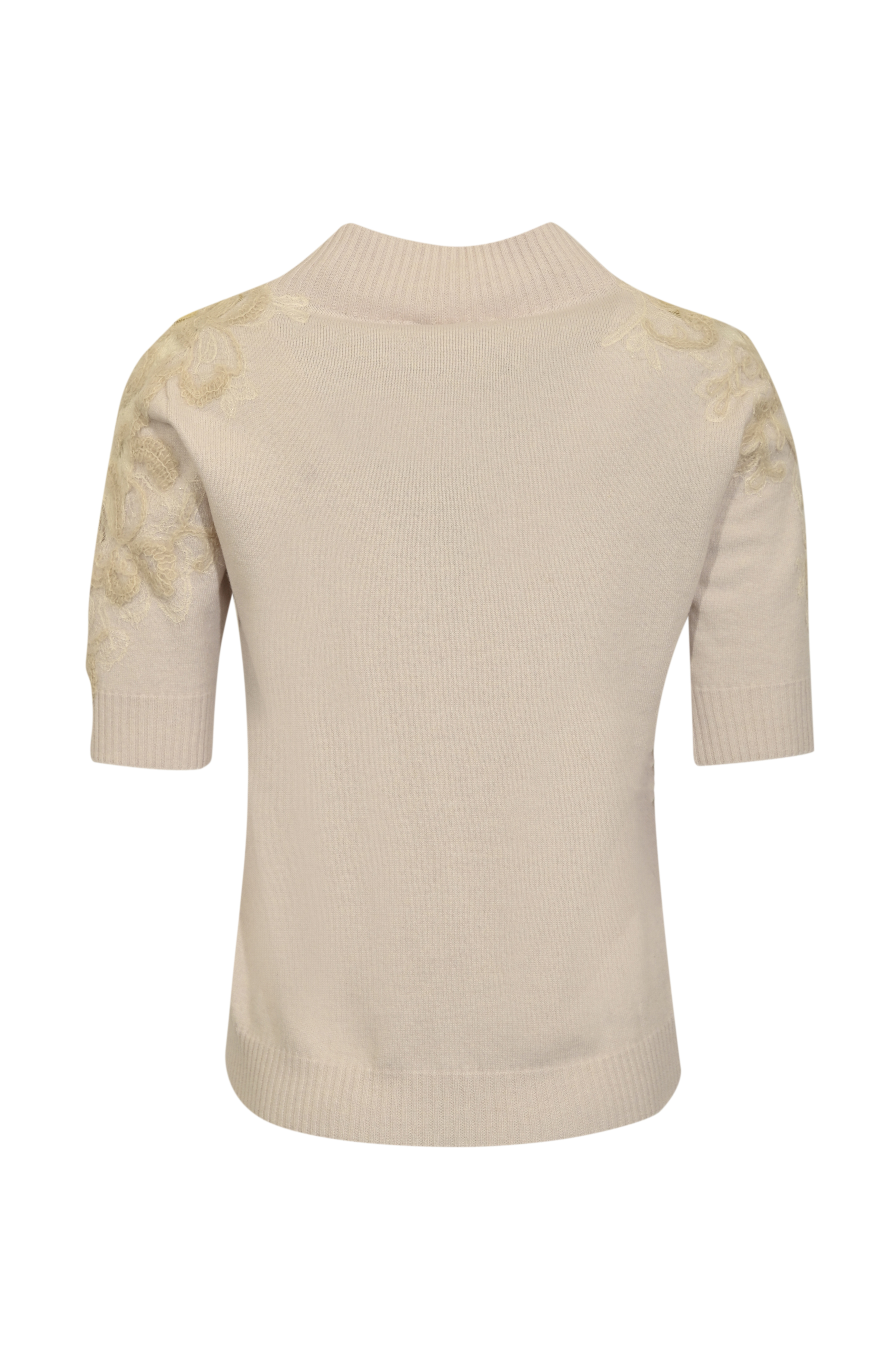 - Dettagli: Inserti in pizzo floreale applicati sulle spalle e sulle maniche, fondo e polsi rifiniti a coste
