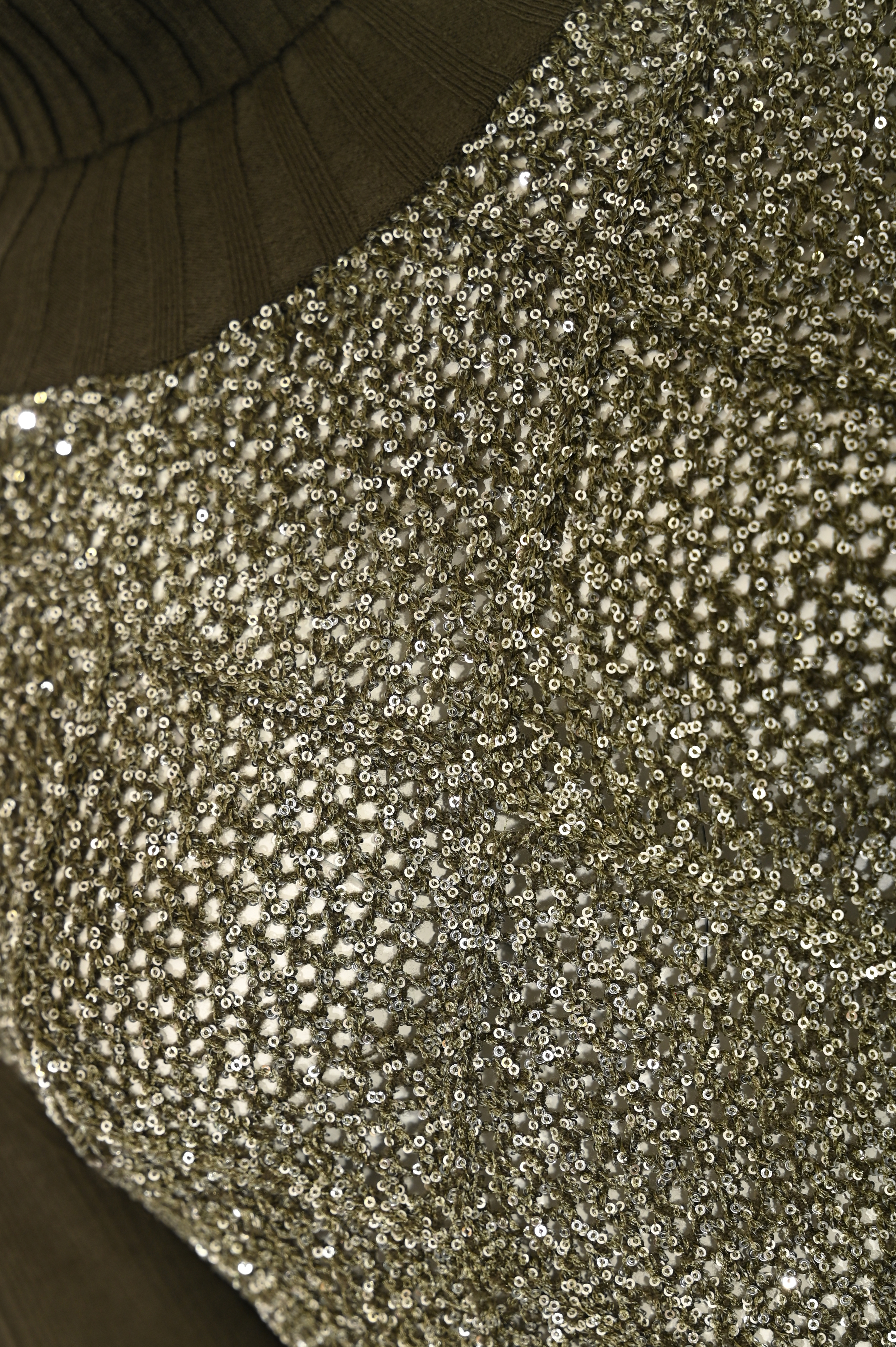 - Dettagli: Lavorazione a coste su maniche, collo e fondo; pannello frontale interamente decorato con paillettes; linea aderente con effetto strutturato