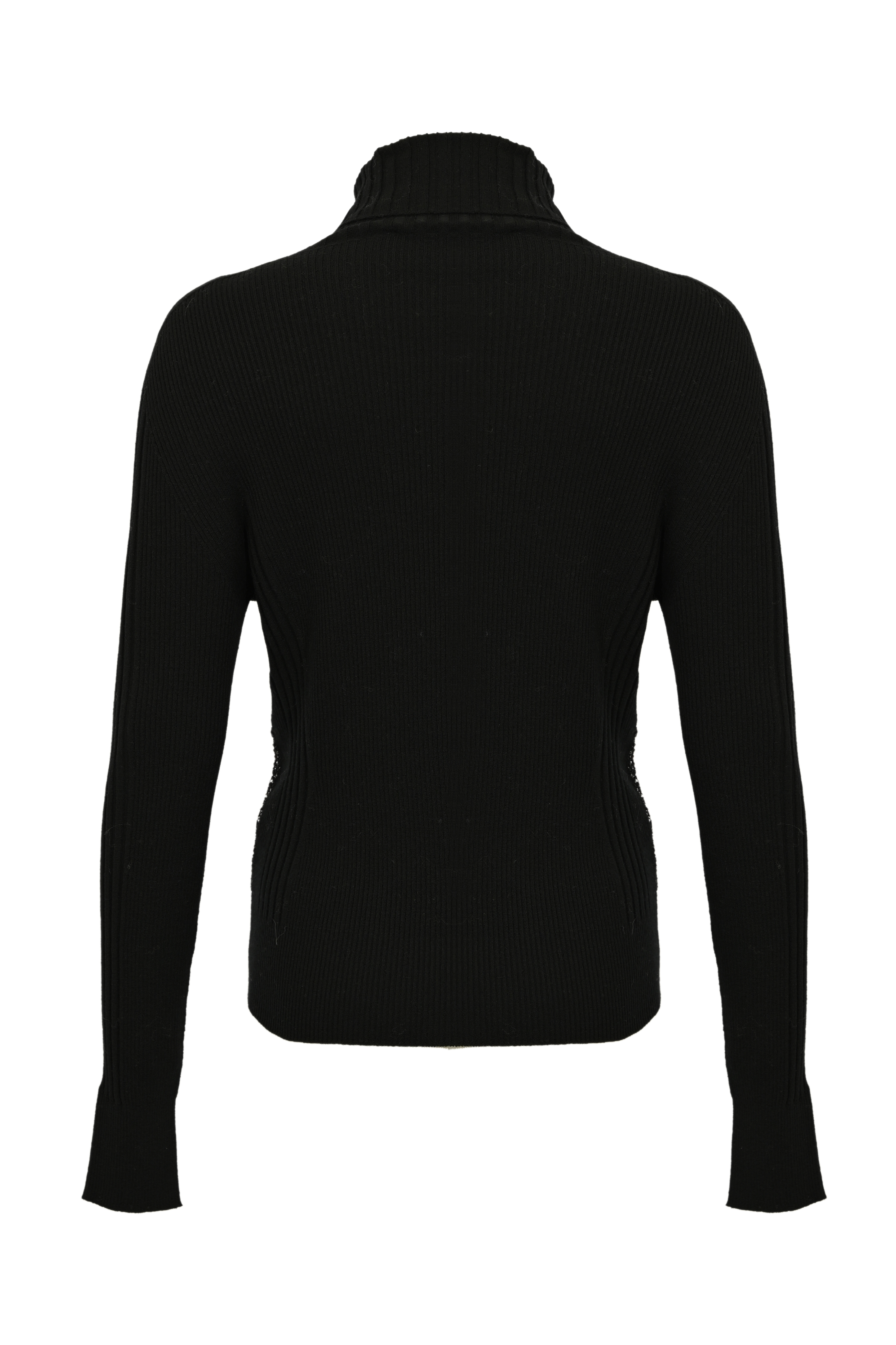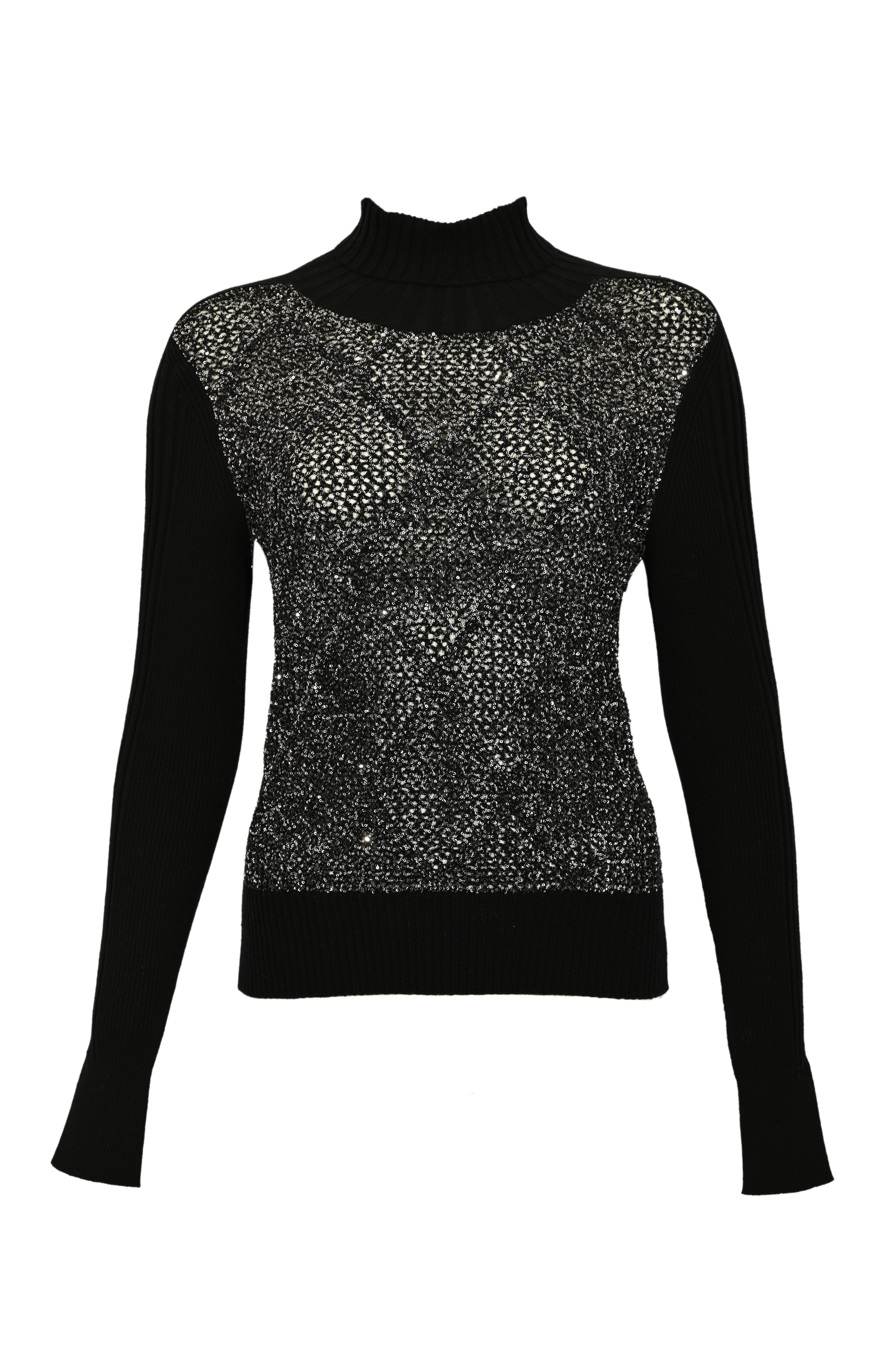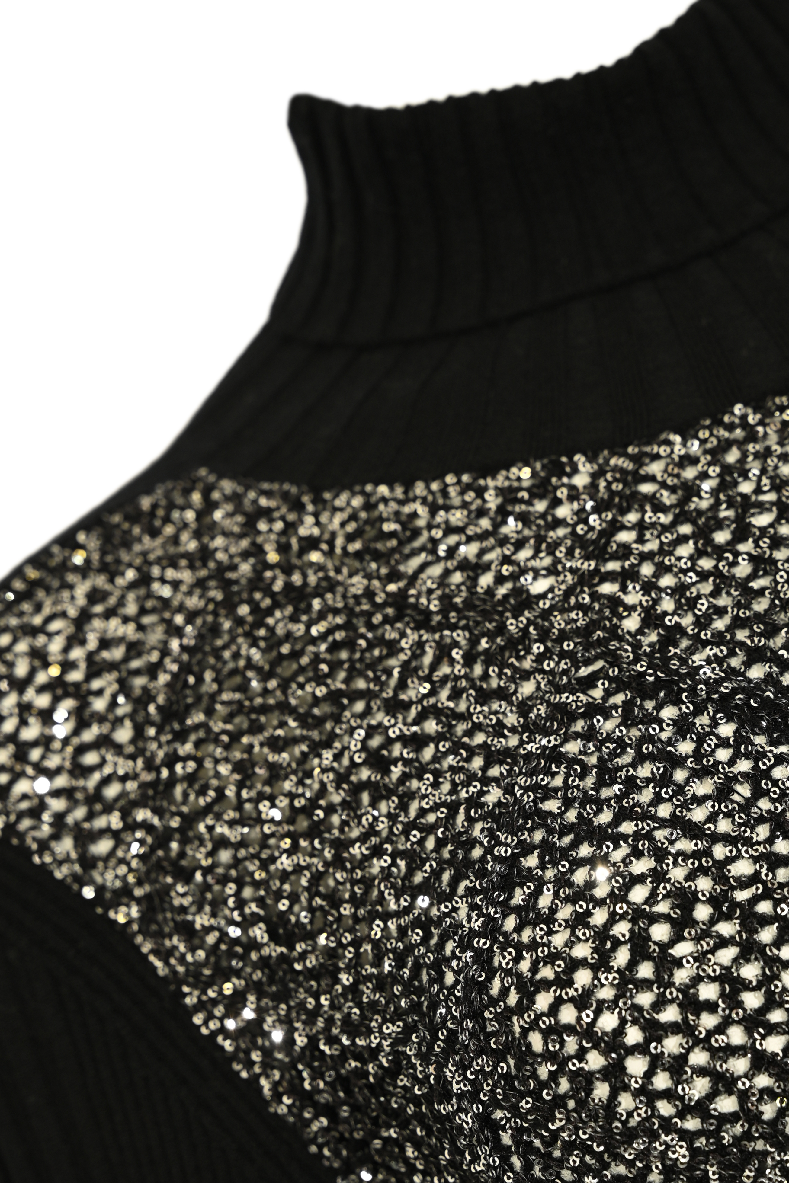 - Dettagli: Lavorazione a coste su maniche, collo e fondo; pannello frontale interamente decorato con paillettes; linea aderente con effetto strutturato