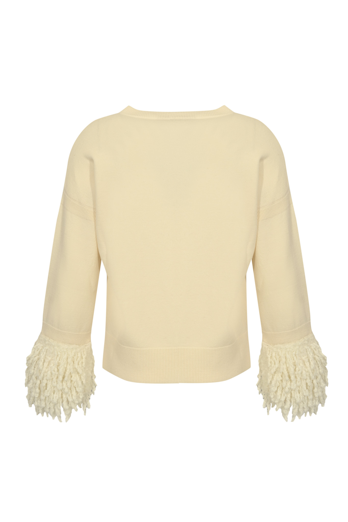- Dettagli: frange voluminose sui polsini, lavorazione in maglia fine, bordi a coste