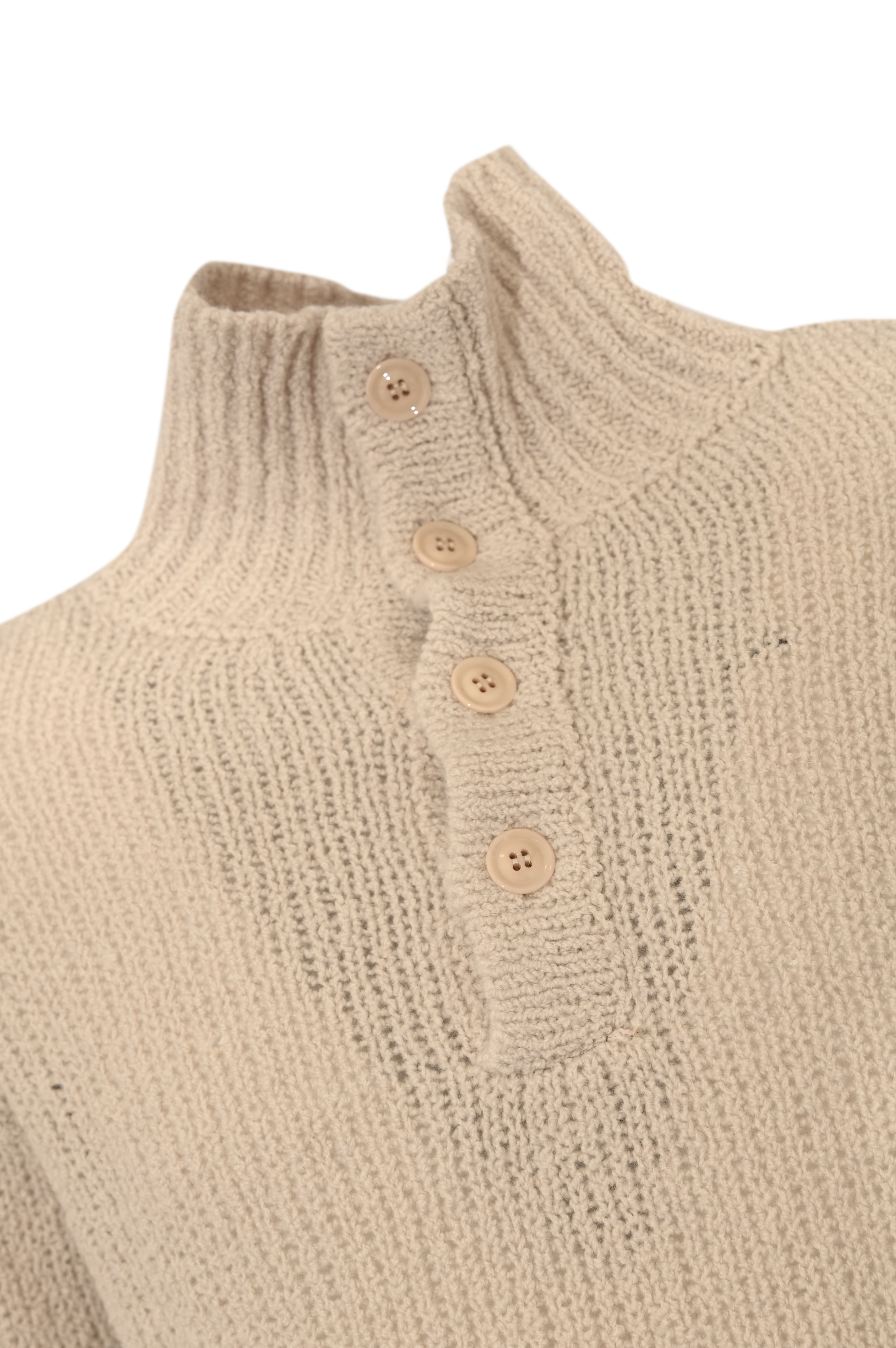 - Dettagli: lavorazione a maglia grossa, fondo e polsini a costine, texture morbida e calda, bottoni tono su tono