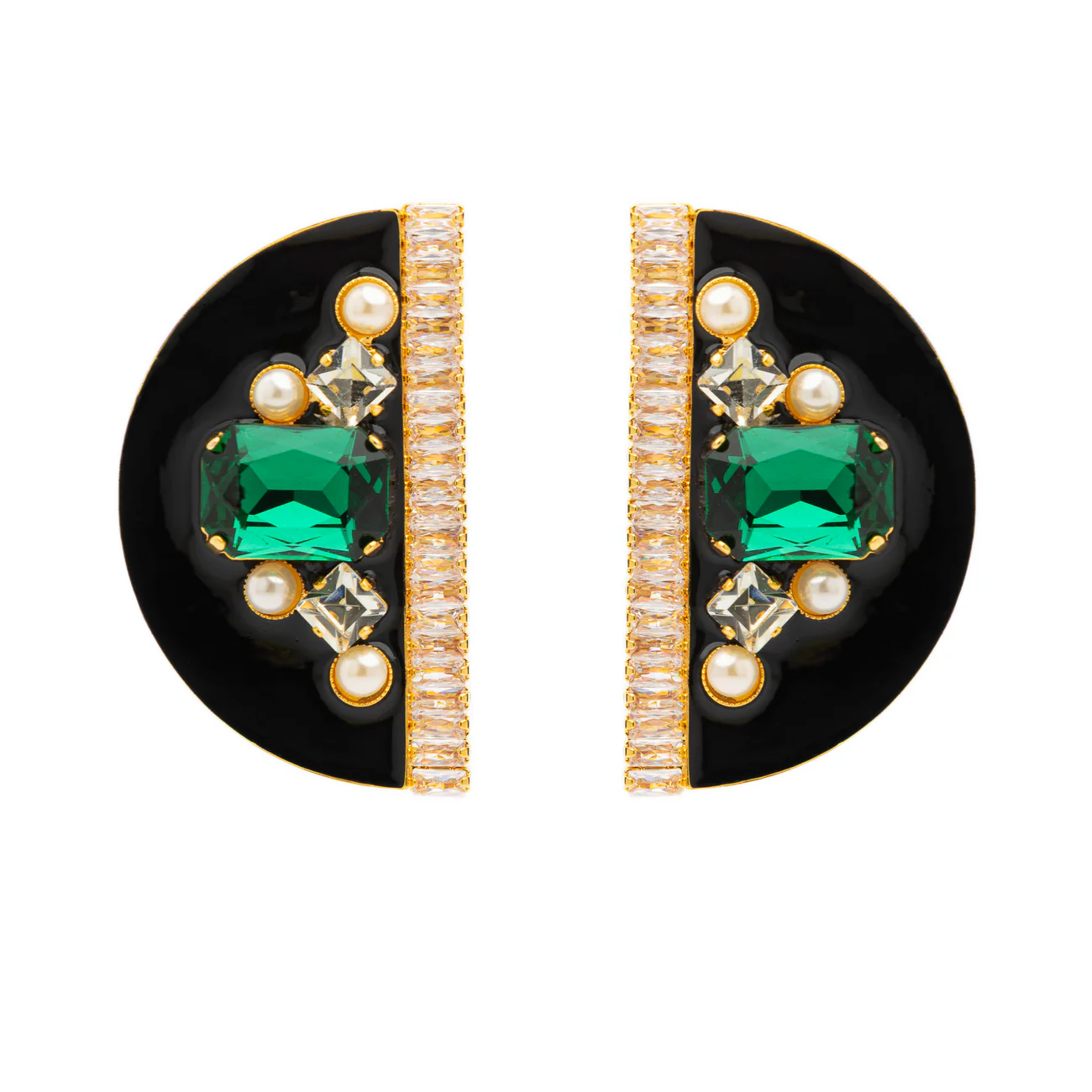 - Dettagli: design scenografico modello Diabolika, forma semicircolare, cristalli centrali verdi, perle decorative e profilo con cristalli