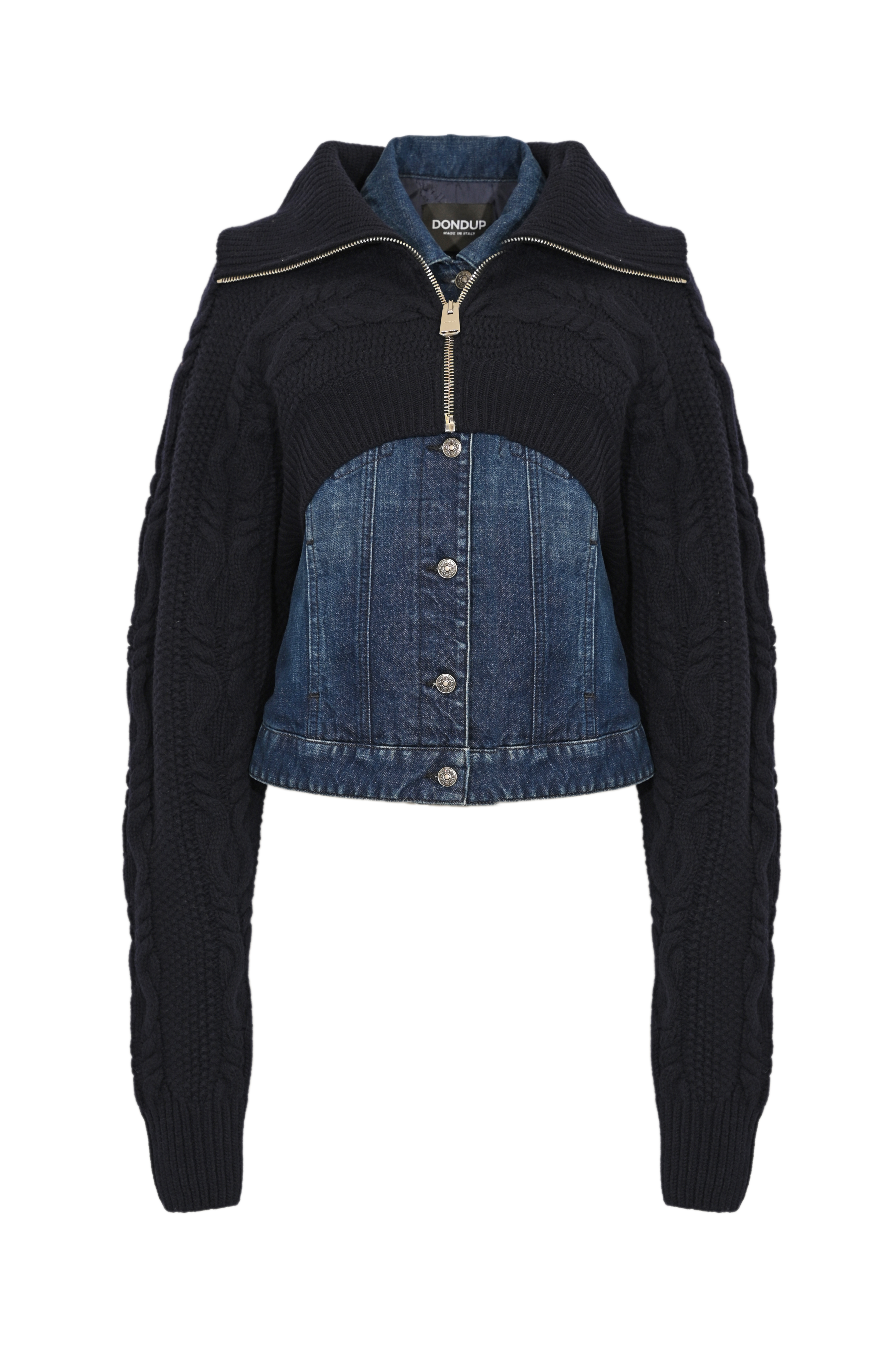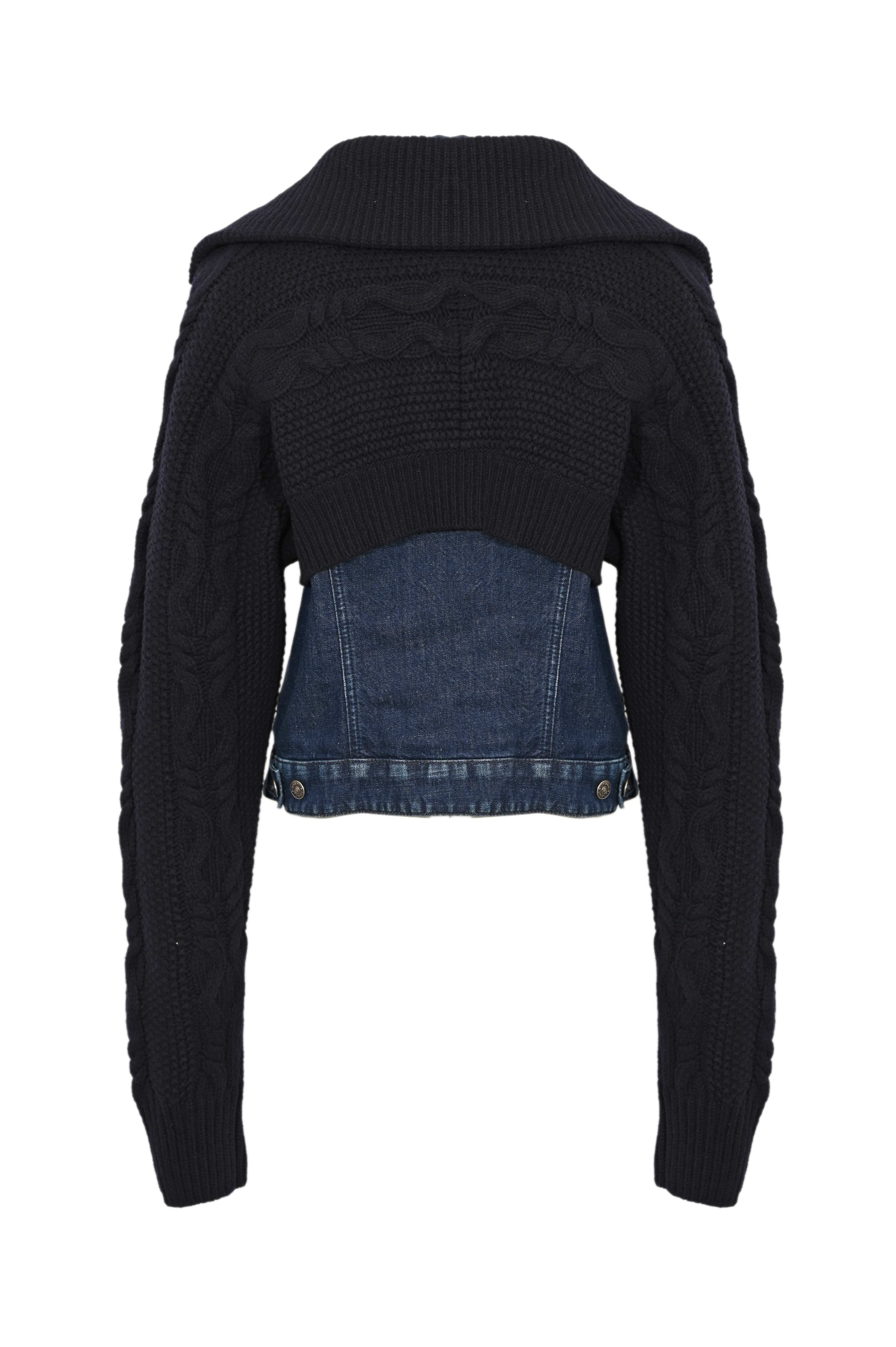 - Dettagli: effetto doppiato denim/maglia, struttura mista con lavorazione a trecce, fondo e polsini a costine