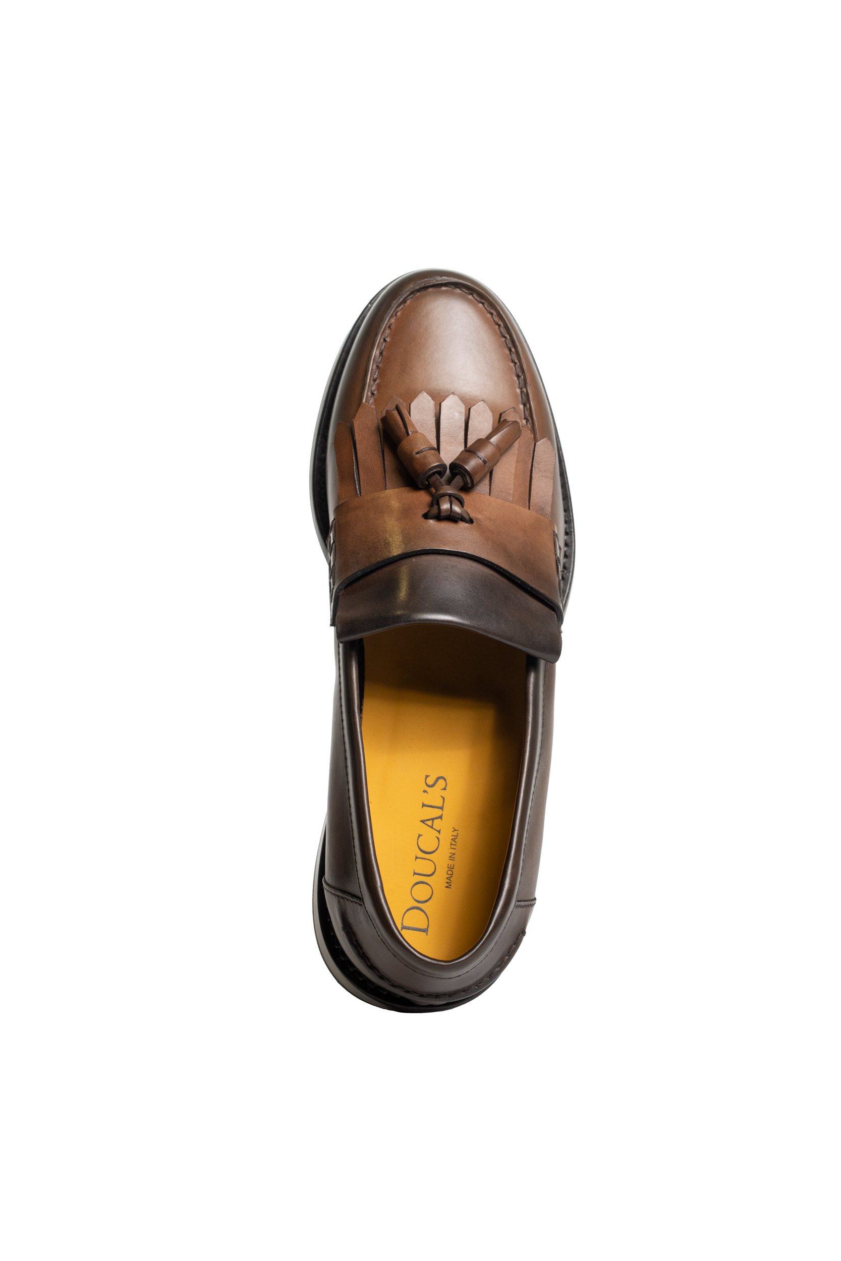 - Tomaia: Realizzata in morbida pelle color marrone bruciato con frangia decorativa e nappine sul collo piede; cucitura a vaschetta che sottolinea leleganza artigianale del modello.
