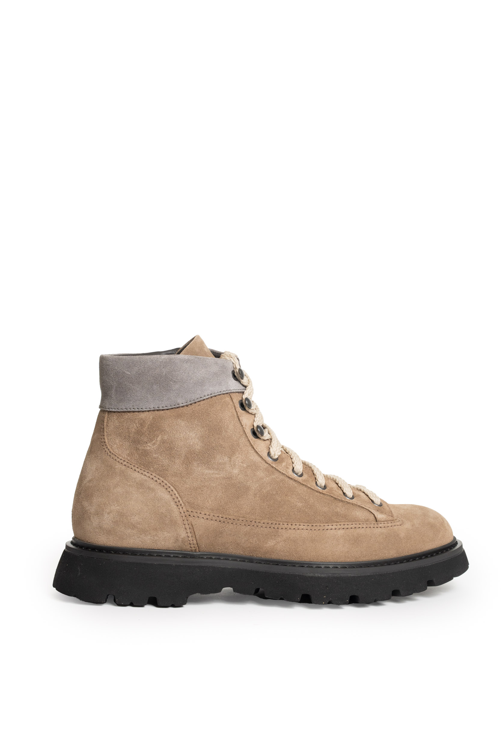 - Tomaia: Realizzata in suede beige con collarino imbottito in pelle grigia a contrasto; occhielli metallici e lacci tono chiaro; linea casual ispirata agli scarponcini da trekking urbani.