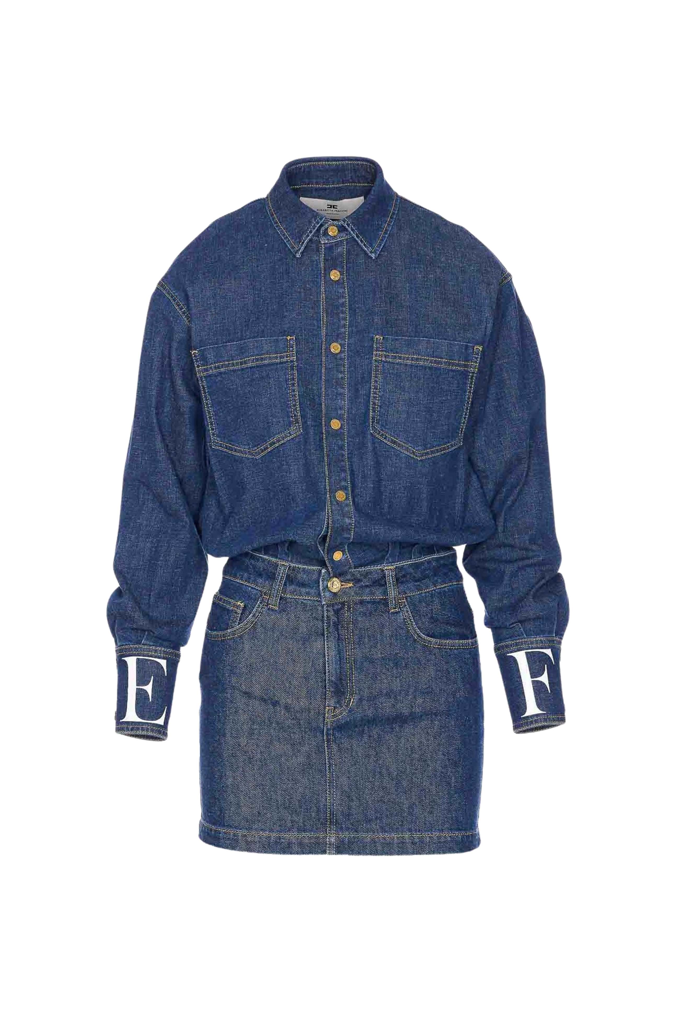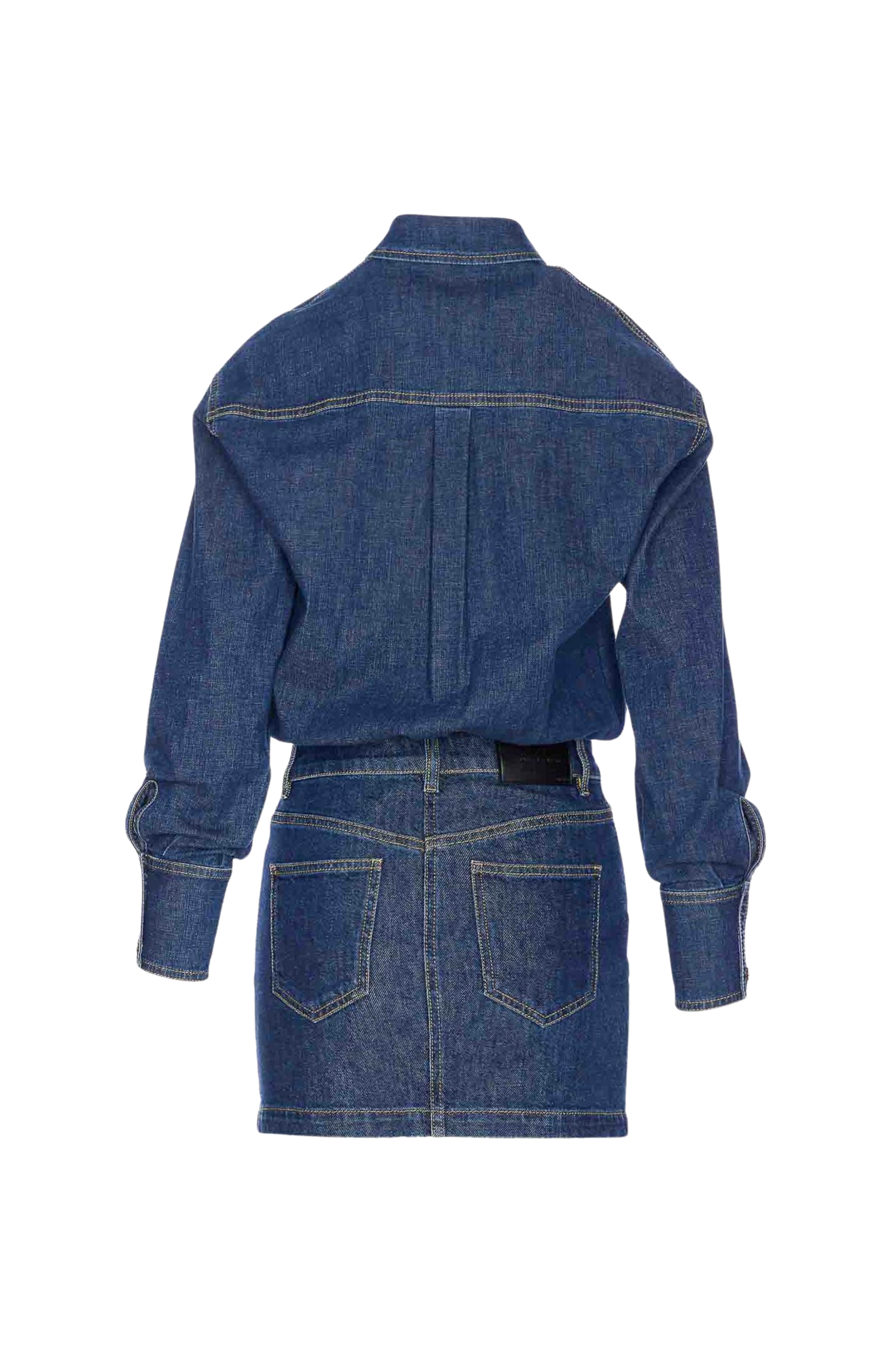 - Dettagli: Modello chemisier effetto due pezzi con parte superiore camicia e minigonna integrata, cuciture a contrasto, patch logo in pelle sul retro