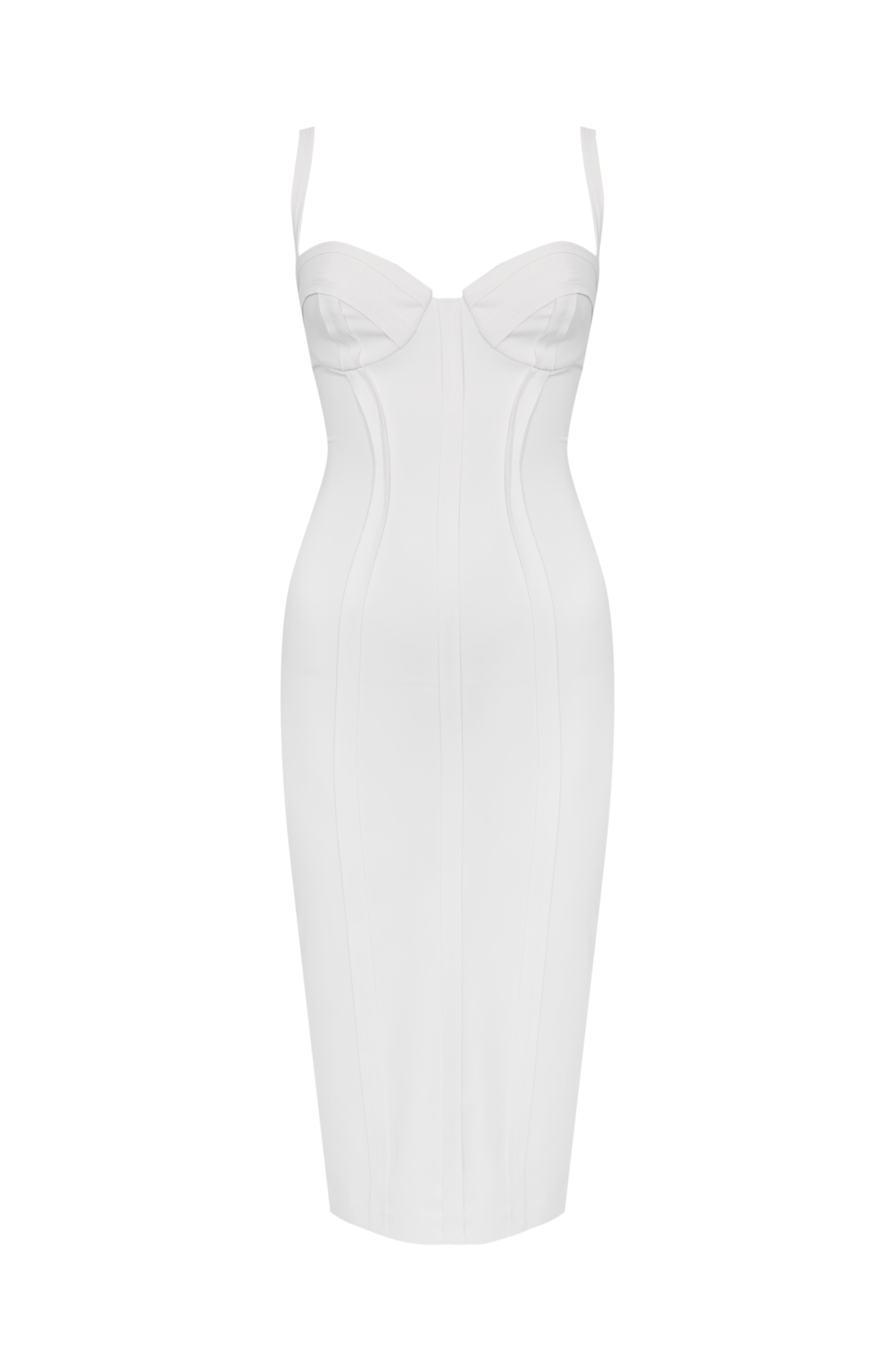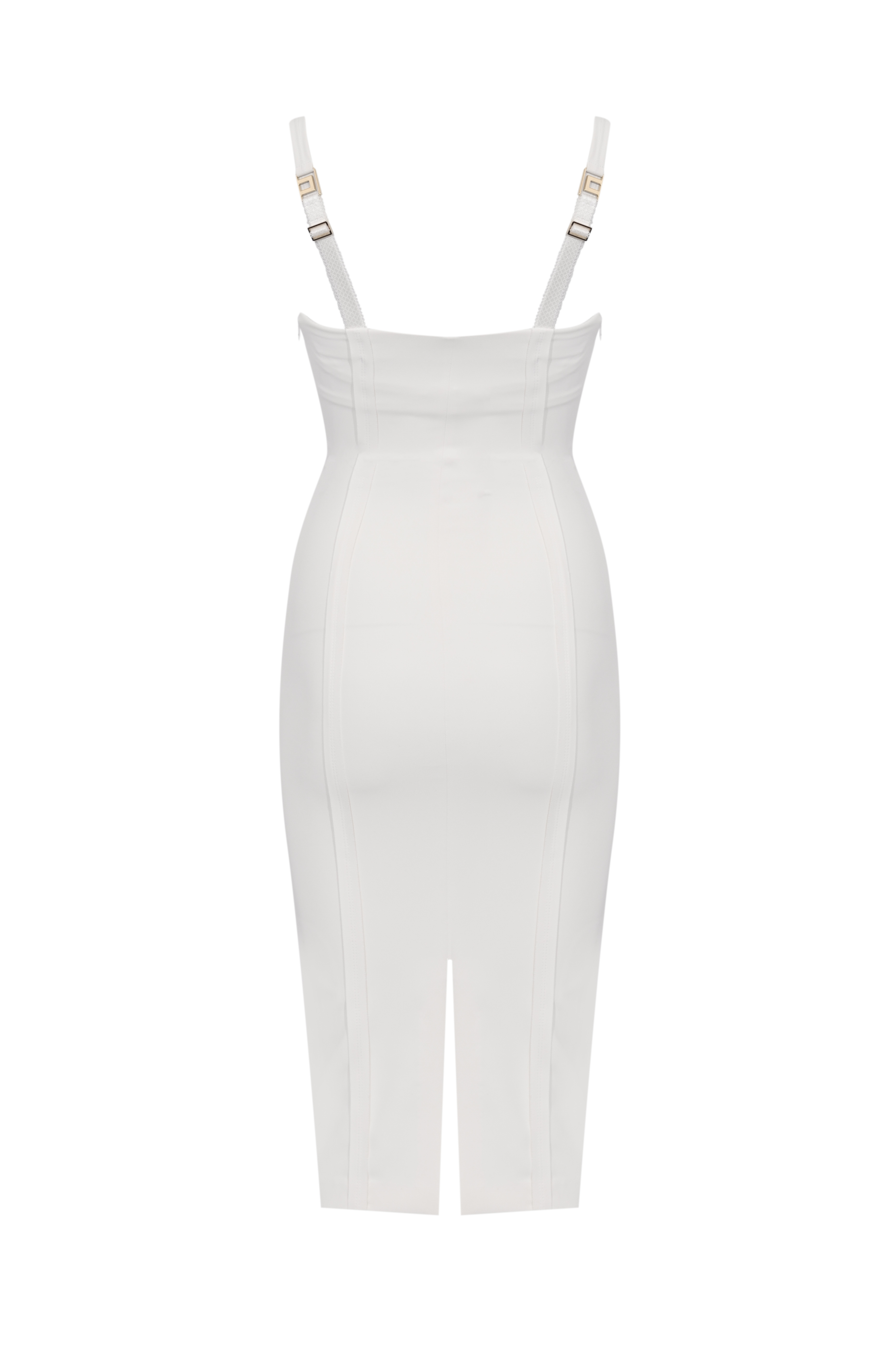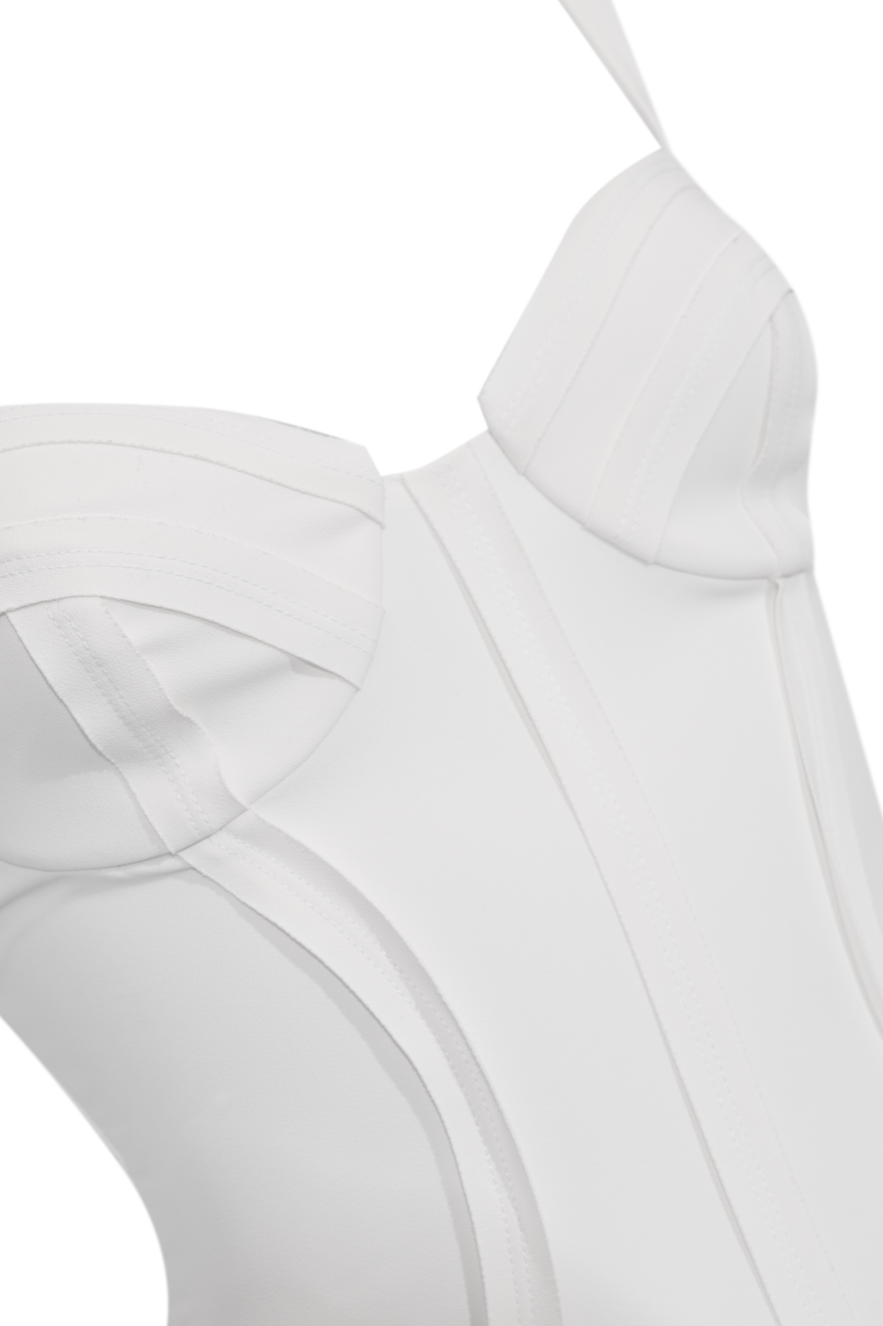 - Dettagli: cuciture sagomate, bustier strutturato, tessuto a taglio vivo, spacco posteriore