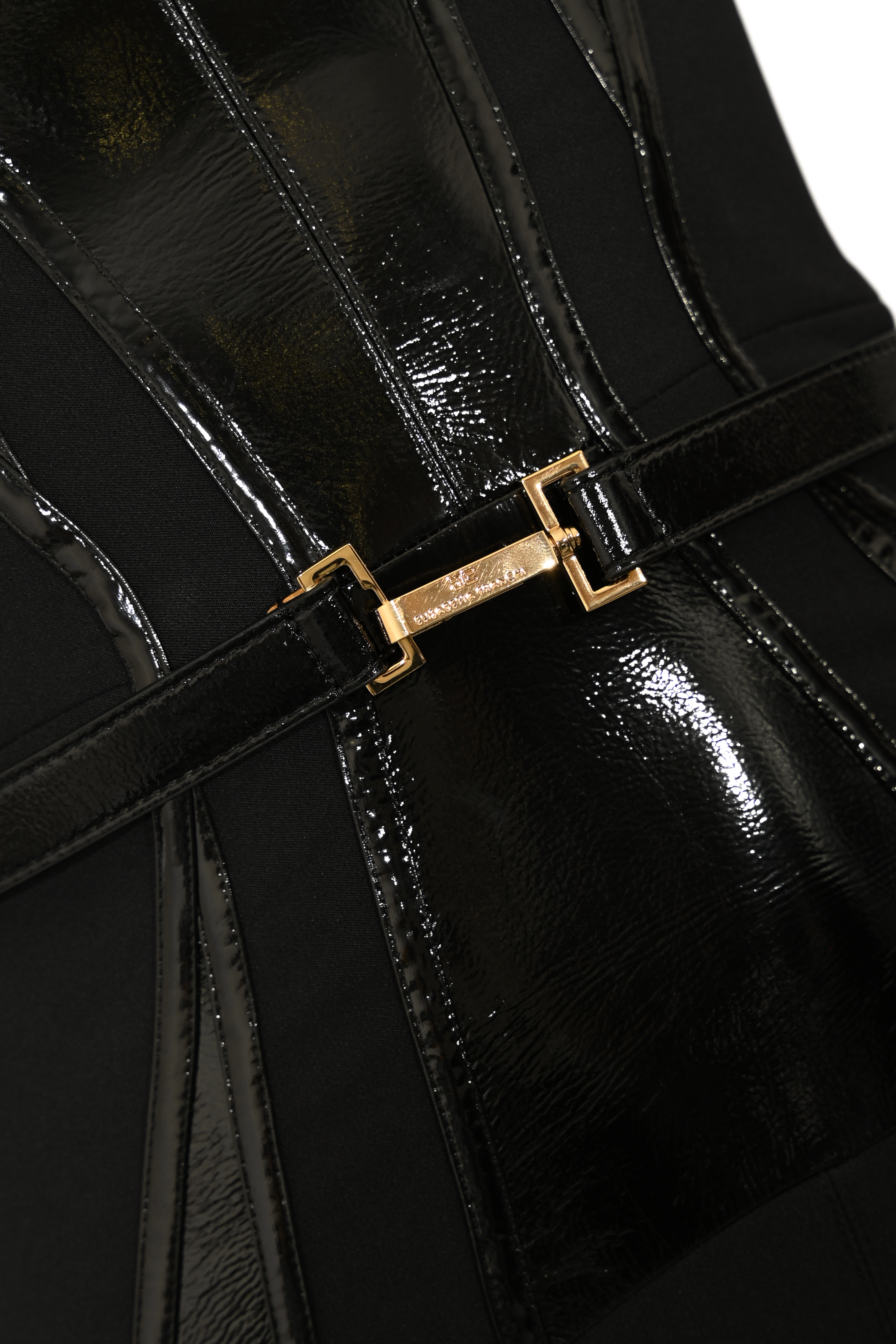 - Dettagli: pannelli lucidi effetto corsetto in vinile, cintura sottile coordinata con fibbia logata dorata, cuciture a vista verticali che slanciano la figura, spacco posteriore